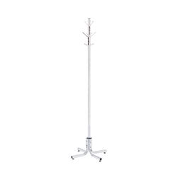 The free standing coat rack features four double hooks that securely hold up to eight garments. Steel hooks have ball tips to prevent damage to garments and the 21-inch wide base provides stability.Features