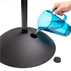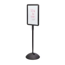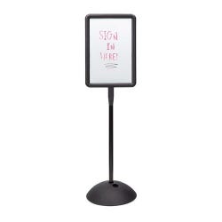 Floor sign with dual-sided dry erase/magnetic whiteboard surfaces lets you display messages for traffic going in either direction. The writing surface adjusts + or – 45 degrees. It has a durable molded construction with UV inhibitors that make the sign suitable for indoor or outdoor use. The 18-inch wide base may be filled up with sand or water for extra stability. Black finished sign is transportable and easy to use. Assembly required. Measures 18 W x 18 D x 65 inches.Features