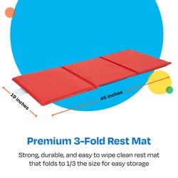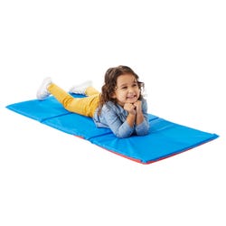 This Childcraft® Premium 3-Fold Rest Mat for classrooms is the perfect solution for naptime and relaxation. The foldable mat is padded and easy to wipe clean, combining comfort and durability for students and teachers. The sleeping mat is made using radio frequency vinyl welding technology to seal all seams and protect the foam padding from liquid and bacteria. Wipe clean to disinfect after each use. Lightweight and simple to take out/put away, the floor mat folds into 1/3 the size when not in use. Each sleeping pad includes a name tag holder for personalization. Measures 45 L x 19 W x 3/4 H inches.Features