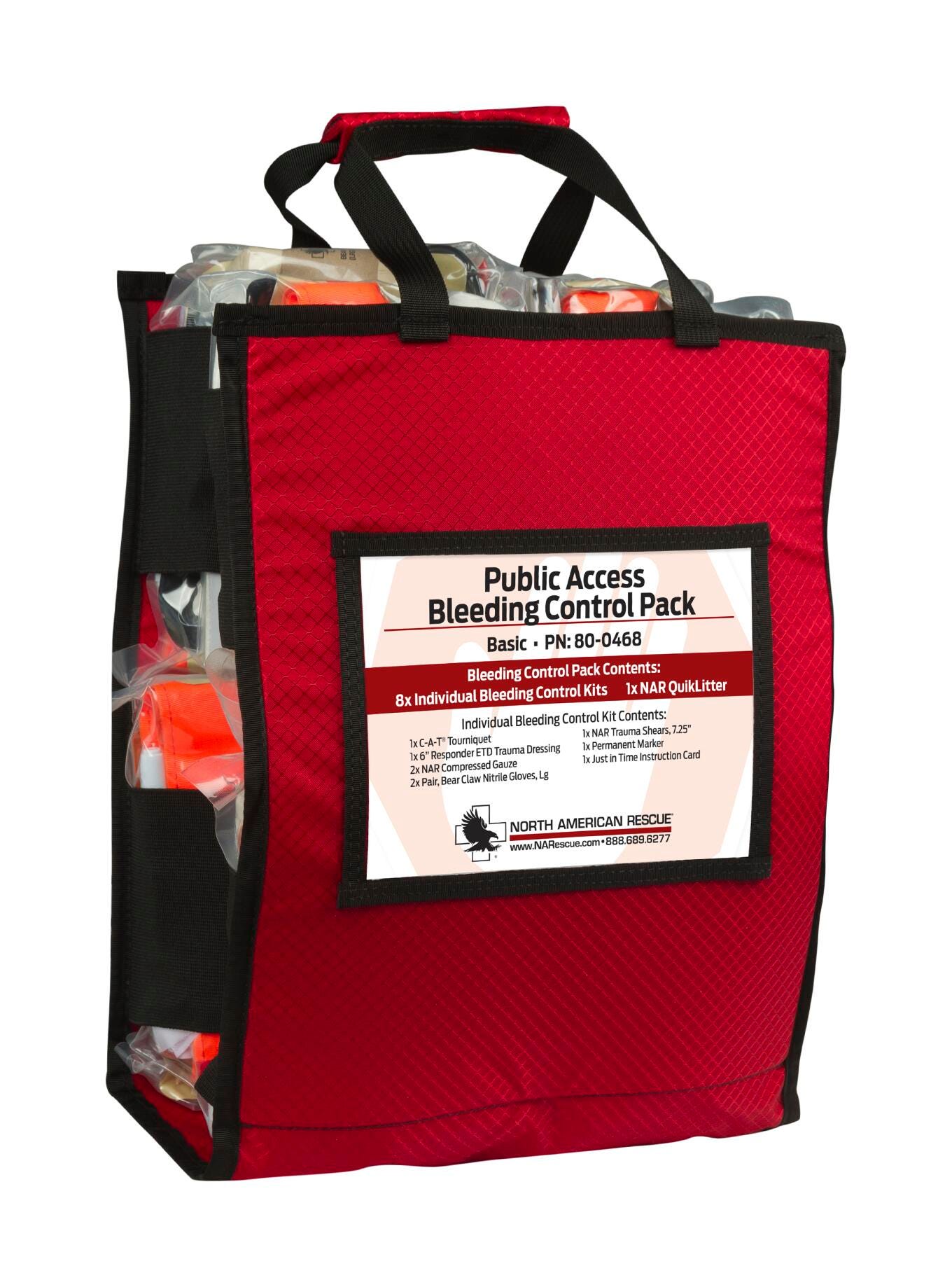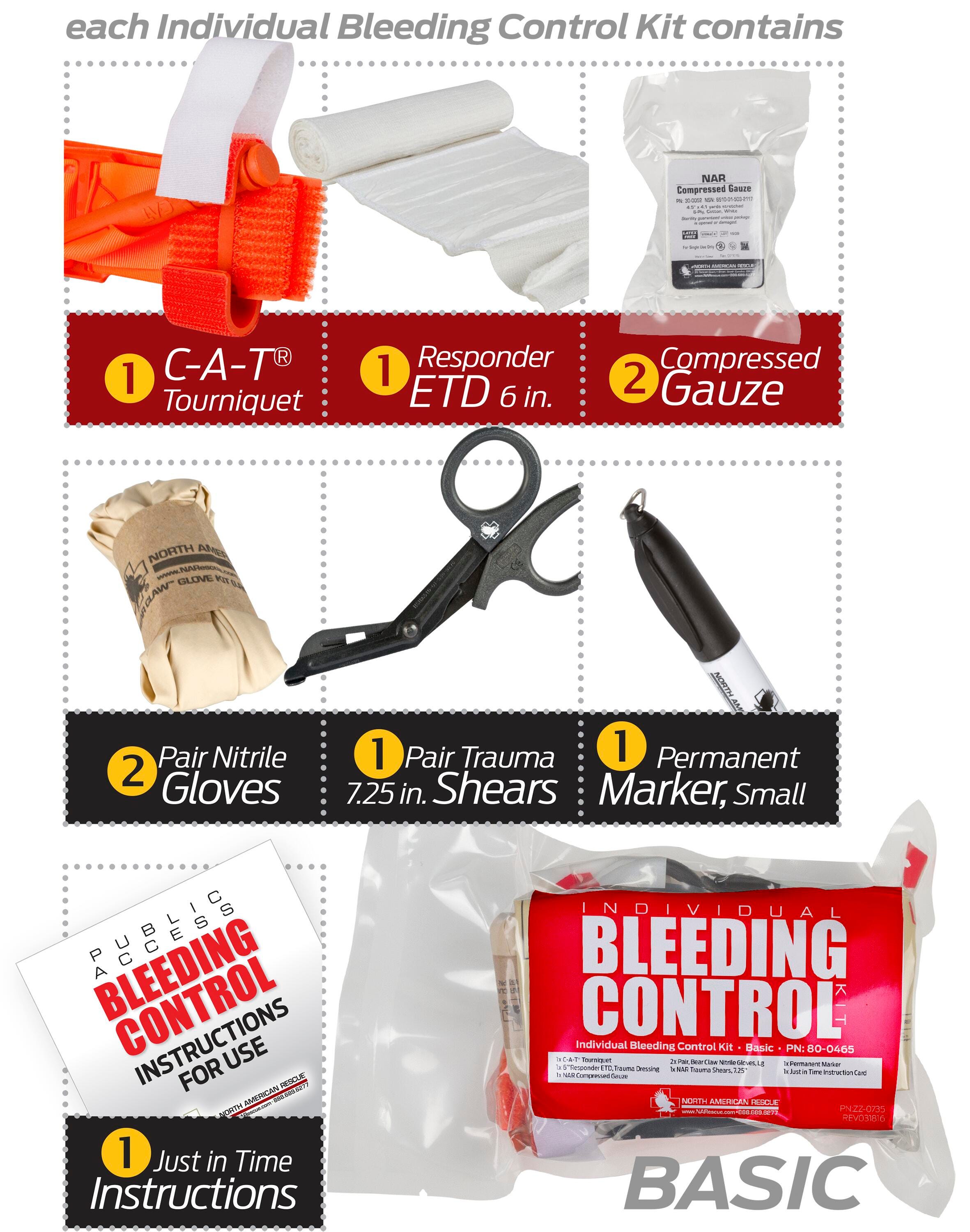 North American Rescue Public Access Bleeding Control Station contains: One (1) Public Access Bleeding Control Pack, which includes eight (8) Individual Bleeding Control Kits. Stored in a durable, clear polycarbonate cabinet that is easily accessible with highly visible "Stop the Bleed" placards for fast identification. The rugged storage case provides both physical and environmental protection. It also contains an eyelet that allows for a secondary safety seal to easily identify if the station has been opened or tampered with. The clear design of the storage case allows visibility at any angle and the external mounting tabs enable the case to be easily installed on any wall. The internal design includes a wire shelf that supports the Public Access Bleeding Control Pack and the exterior has rounded corners to help prevent injury if bumped into and comes complete with the mounting hardware.Includes: