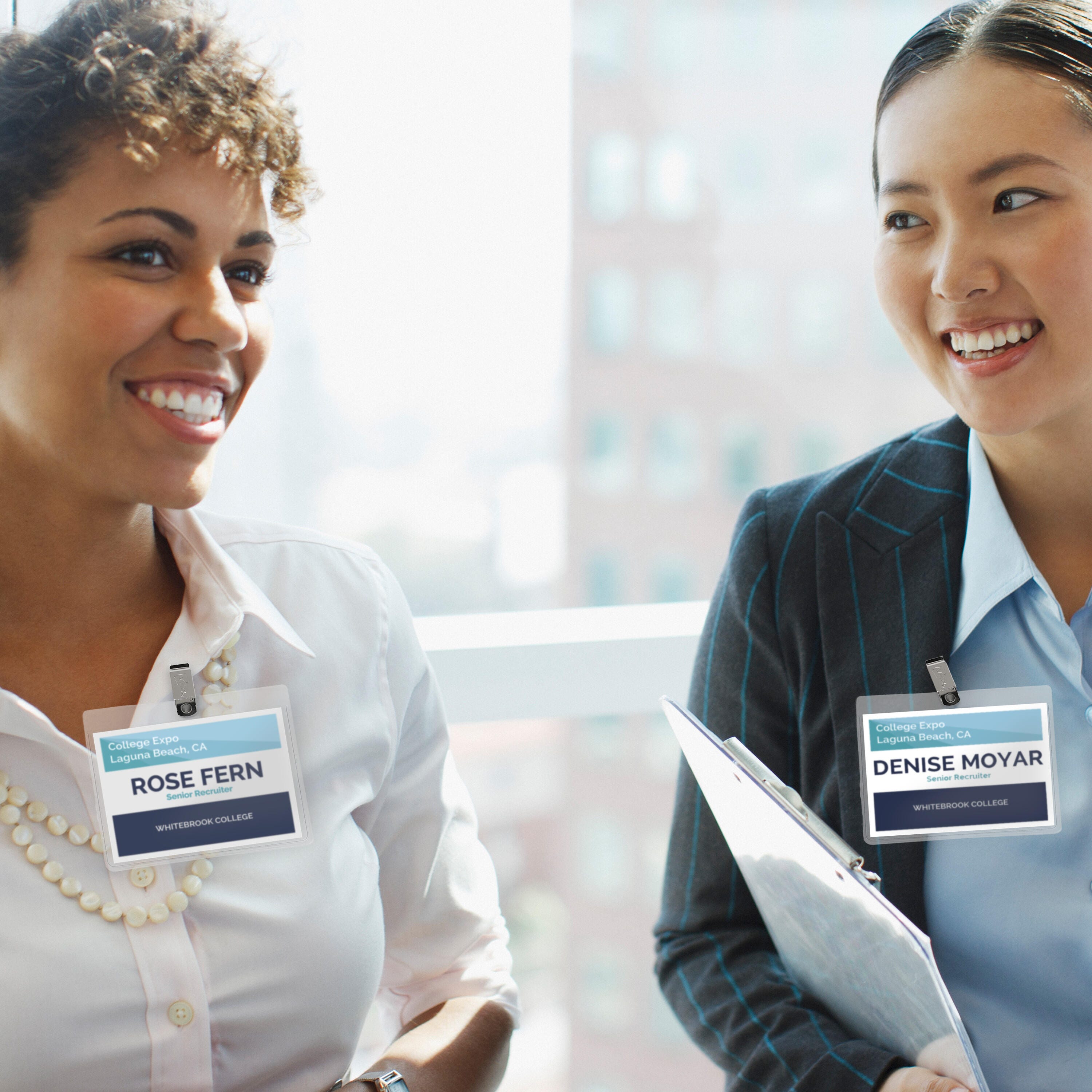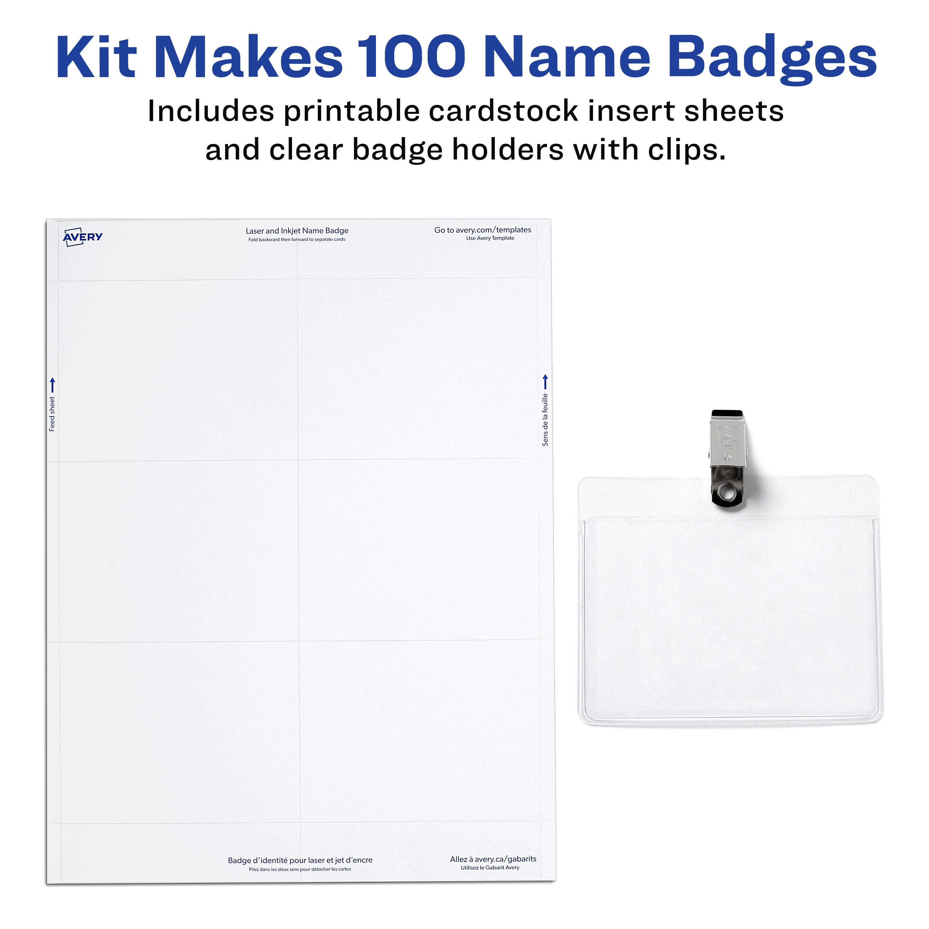 Avery Clip Style Name Badge Kit offers top-loading, soft, plastic badge holders measuring 2-1/4 in x 3-1/2 in and featuring a garment friendly clip. Laser/inkjet compatible kit with flexible, crystalclear, PVC free holders includes white 8-1/2 in x 11 in sheets that tear cleanly. It comes with box tops for Education coupon and is sold as 100 per pack.