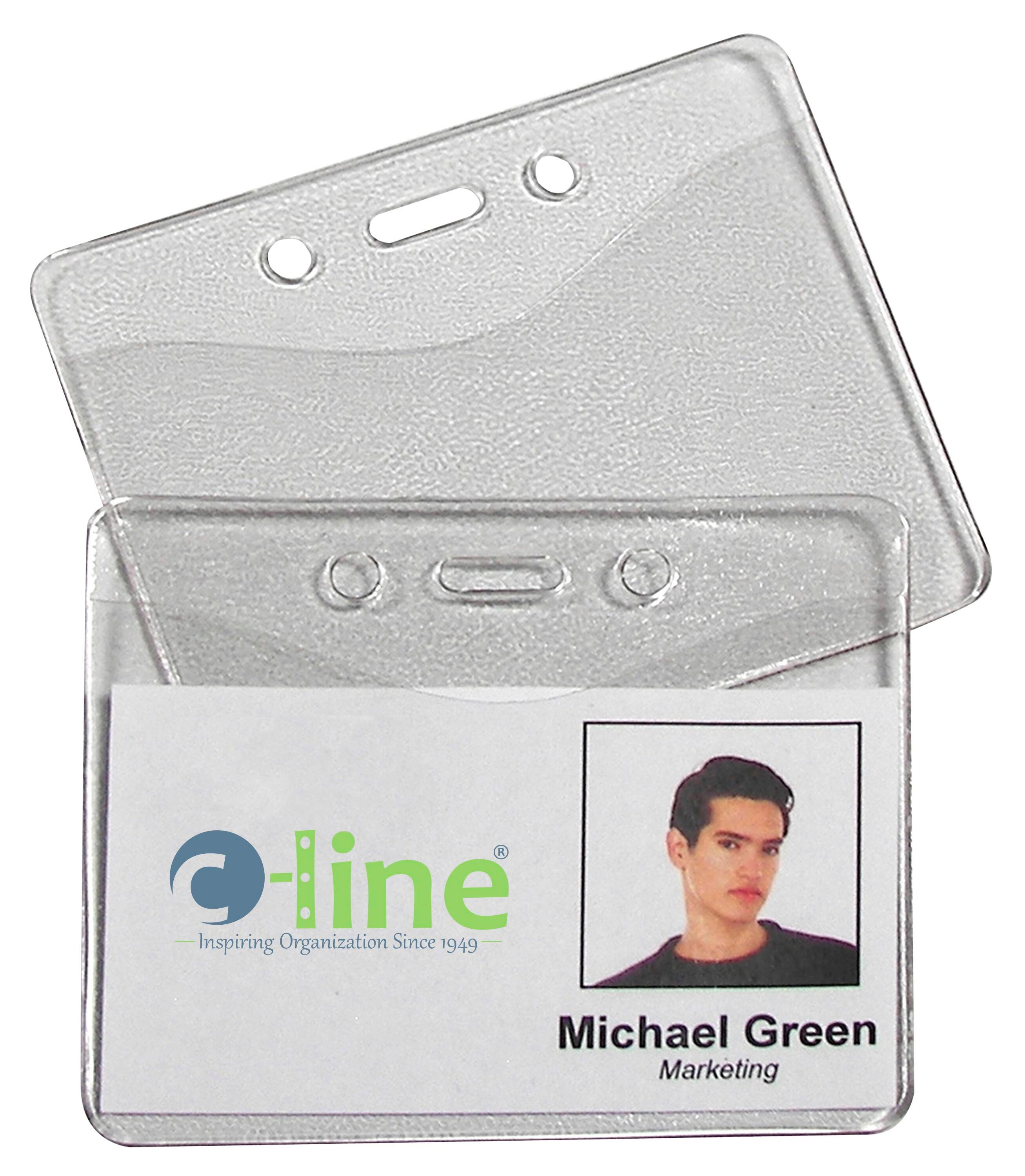 Store and protect work IDs or business cards with the heavy duty, vinyl holders. The slot/chain holes can be used to create a hanging badge, if necessary. Store data/credit card size badges (2-3/8 x 3-3/8 inches) in these heavy duty vinyl holders. Textured back keeps cards from sticking.Features