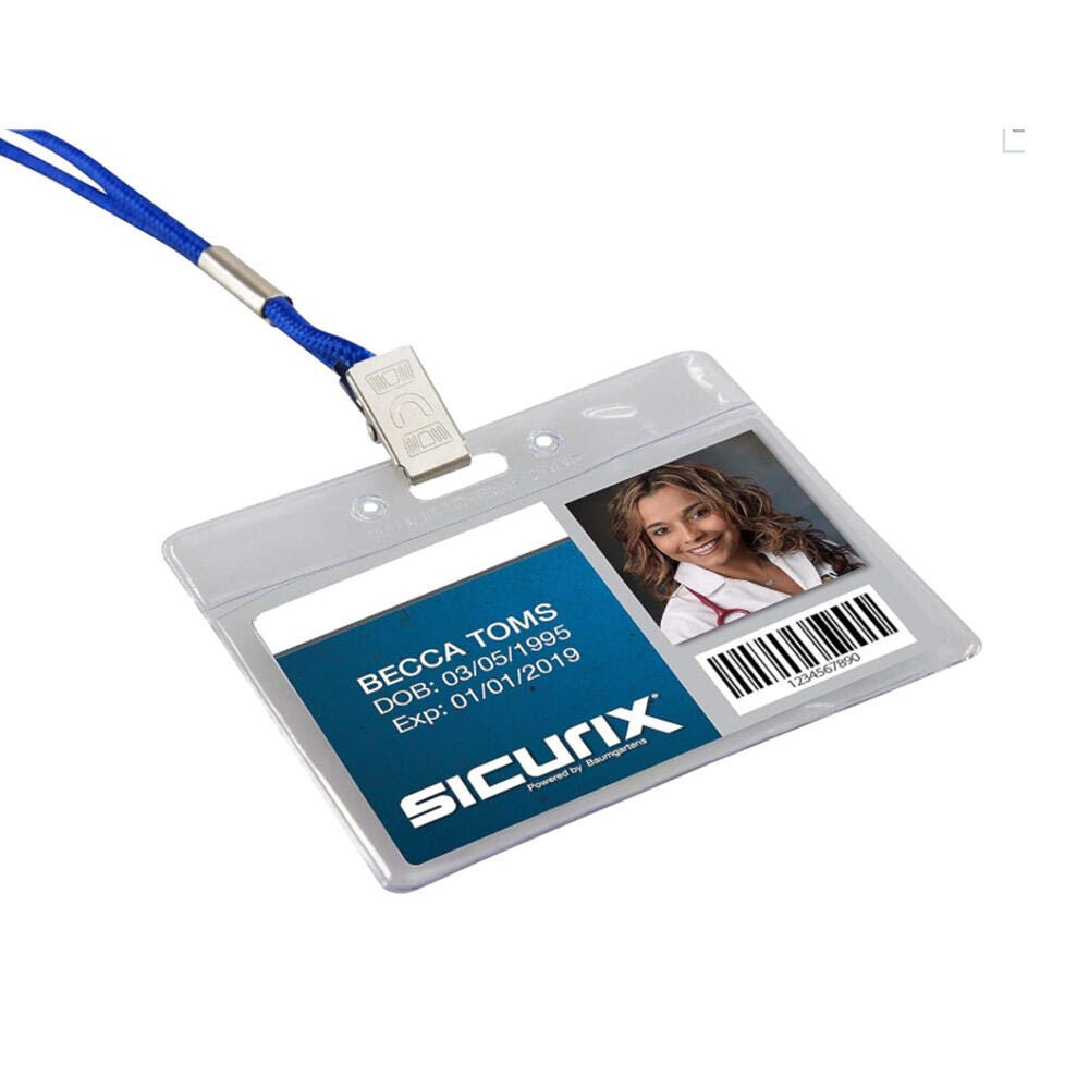 This SICURIX Horizontal Badge Holder supports a maximum insert size of 3-7/8 L x 2-5/8 W inches, and is made for daily use. Durable and weather resistant, while still being flexible and easy to clean. Can be used for personal use for employee badges, or to protect frequently used visitor badges. Sturdy vinyl ID/business card holder features reinforced headers with prepunched slot and chain holes. It is sold as 50 per pack.Features
