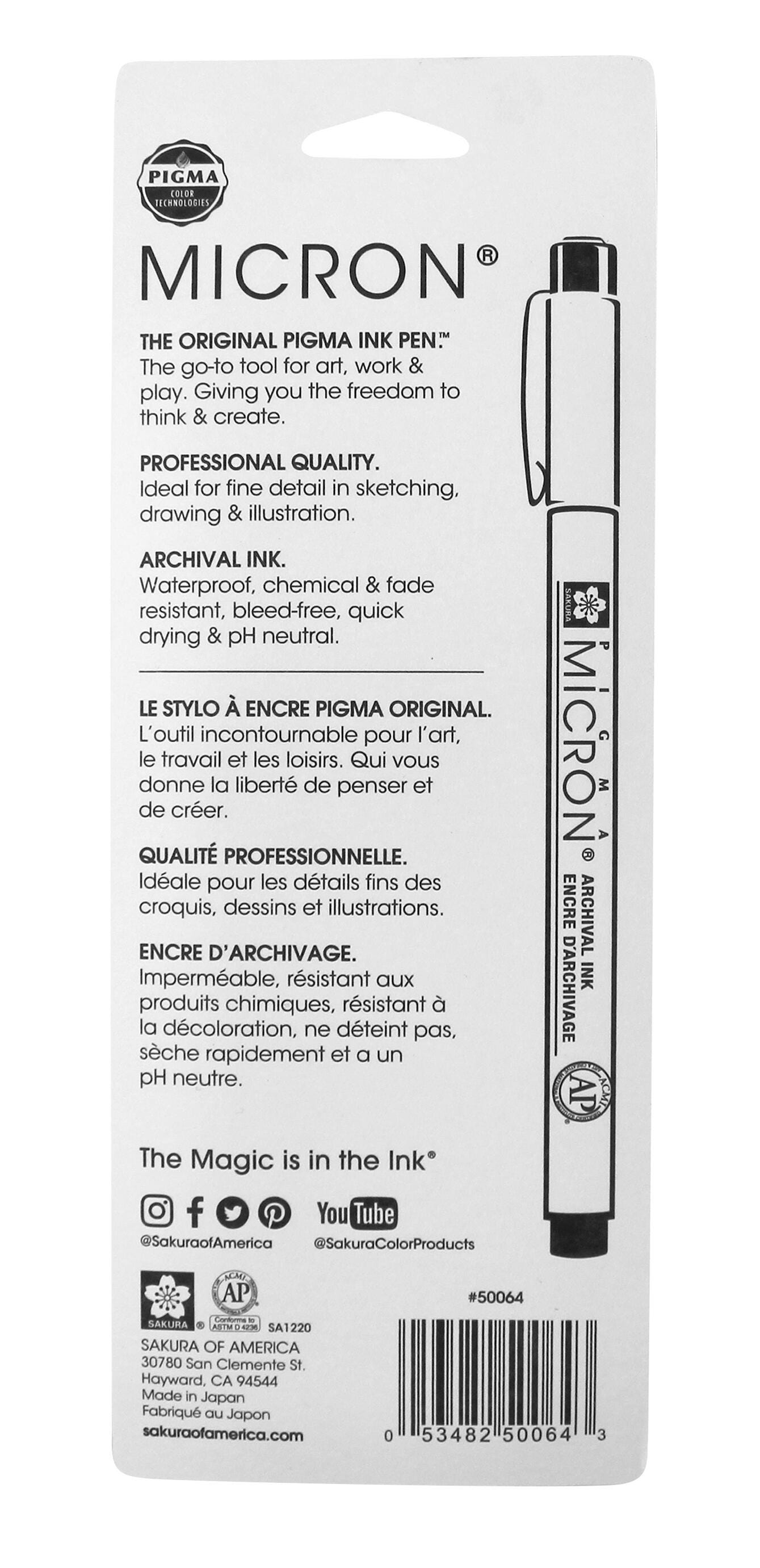 This permanent, fade resistant, chemically stable, pigment-based ink will not bleed or run if liquids are spilled on or applied to the document after the ink has dried. Perfect for legal situations, Pigma ink is nearly impossible to alter on documents, in log books, or on checks. It’s no wonder architects, archivists, anthropologists, entomologists and laboratories depend on Pigma Micron for record keeping.Features