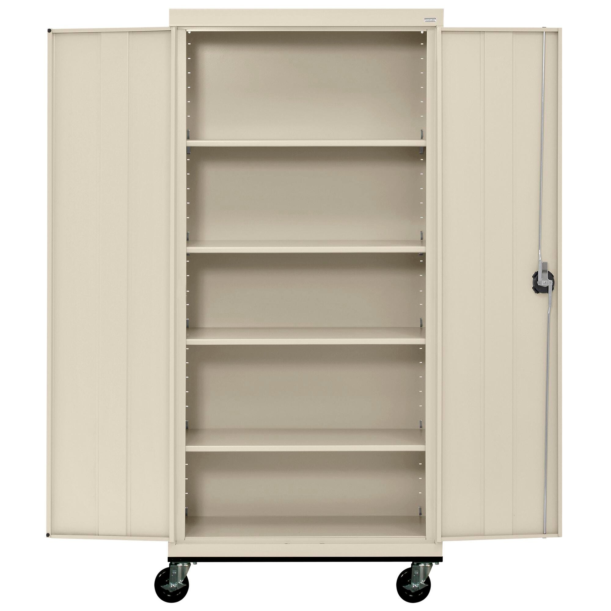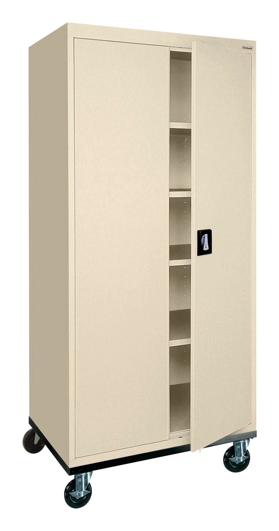 Heavy-duty cabinet with all welded steel construction is made of 20/22 gauge heavy steel. There are 4 adjustable shelves and one fixed bottom shelf that hold 230 pounds of evenly distributed weight. The doors have a recessed 3-point locking handle. The heavy-duty caster base has flush 5-inch casters, and two lock. Cabinet has a powder coat finish.