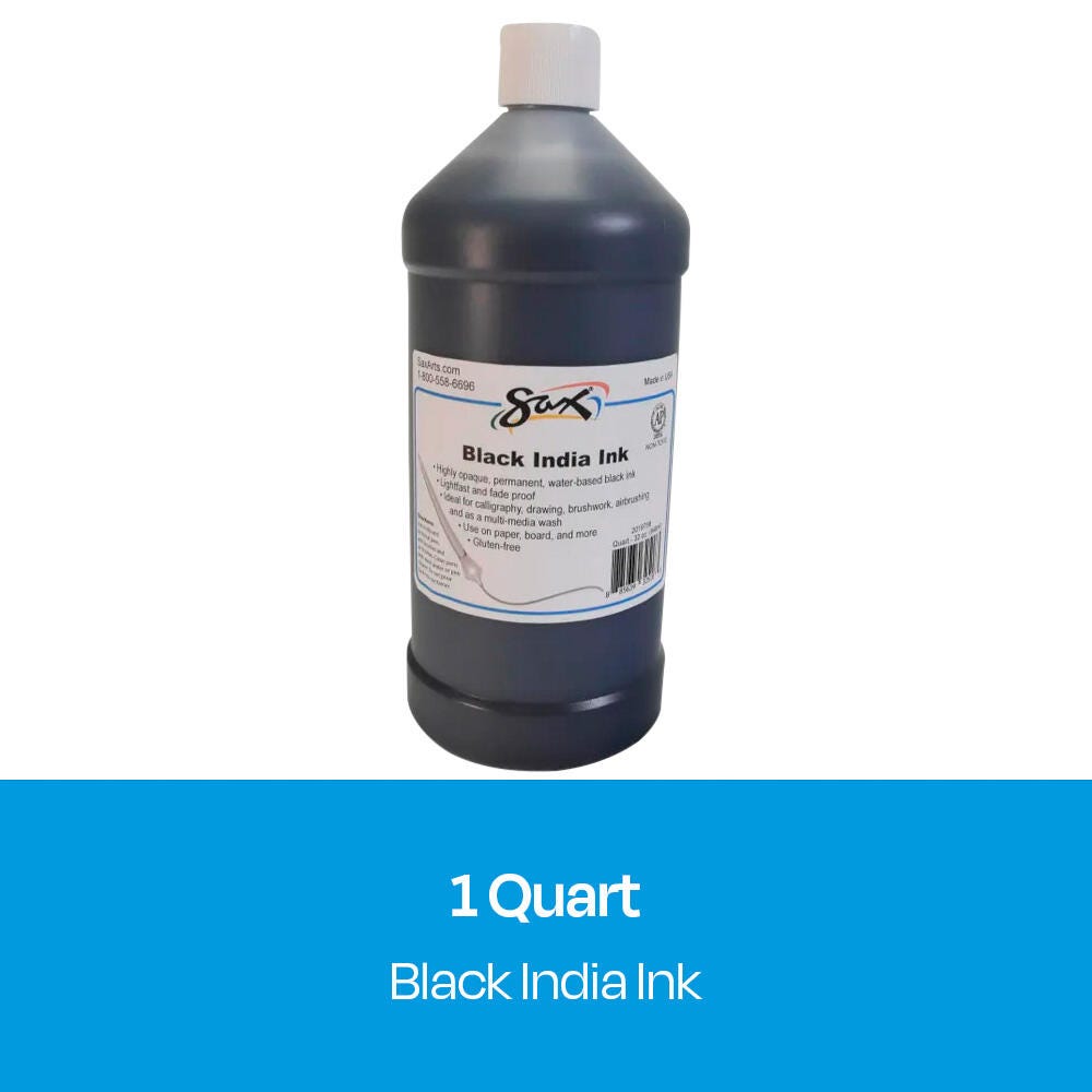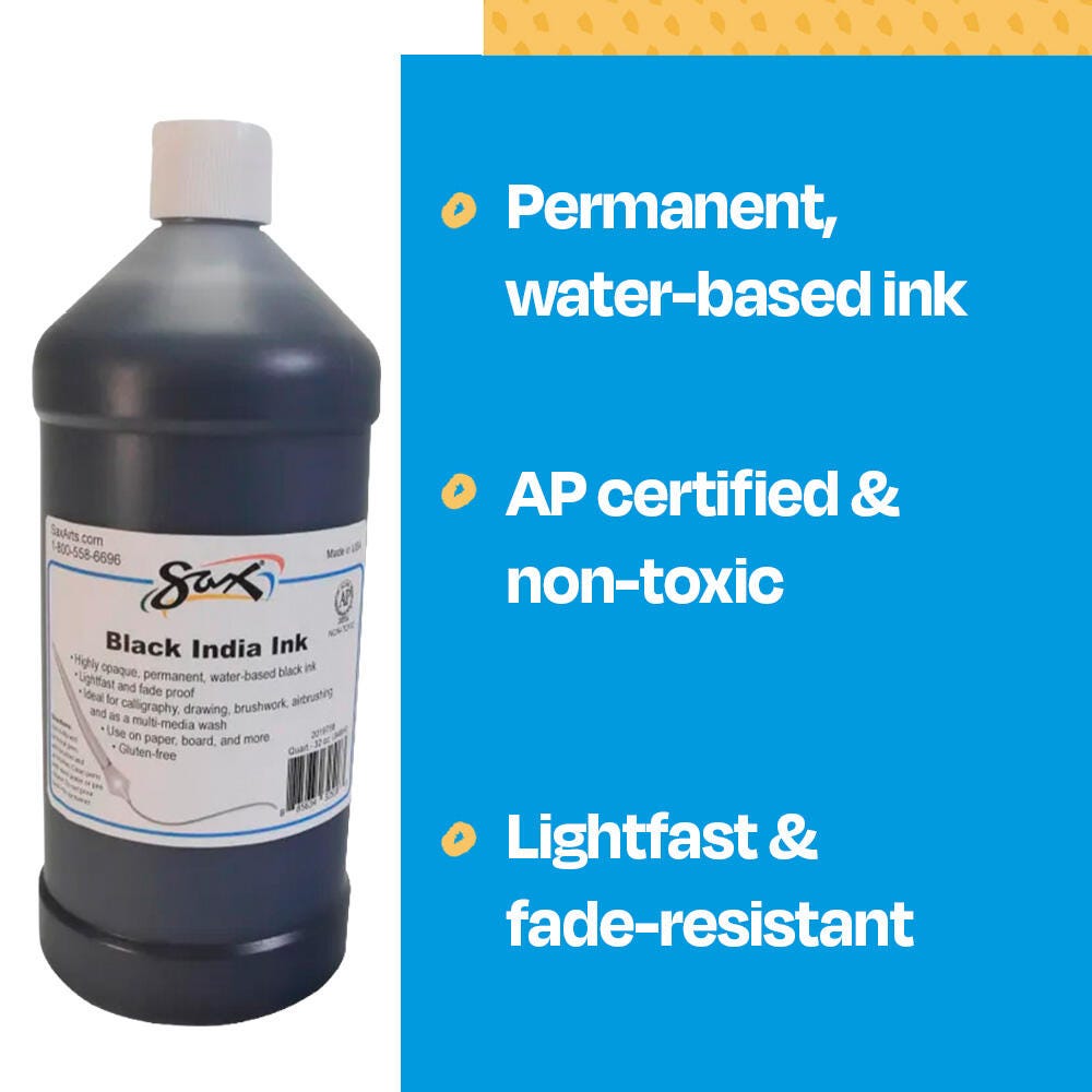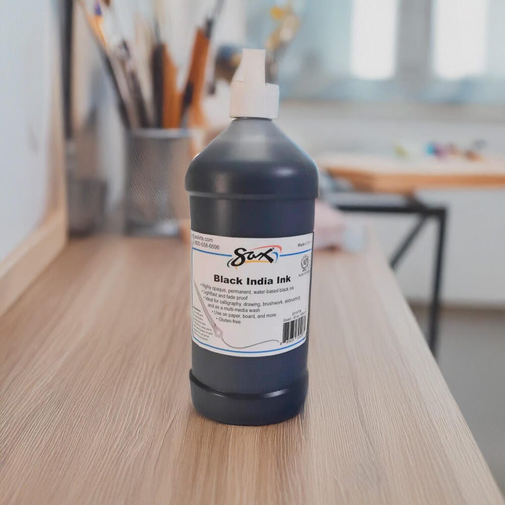 Sax black India ink is a versatile ink for use on everything from printing and outlining to drawing comic strips. The highly opaque, permanent, water-based black ink is lightfast and fade proof. Our rich, smooth flowing formula is ideal for calligraphy, drawing, brushwork, airbrushing, and as a multimedia wash. Pair the ink with technical pens, dip pens, brushes, and airbrushes as needed.Features