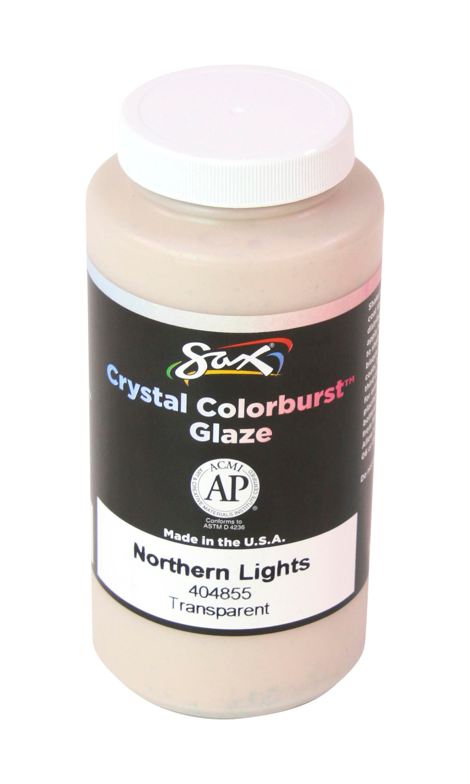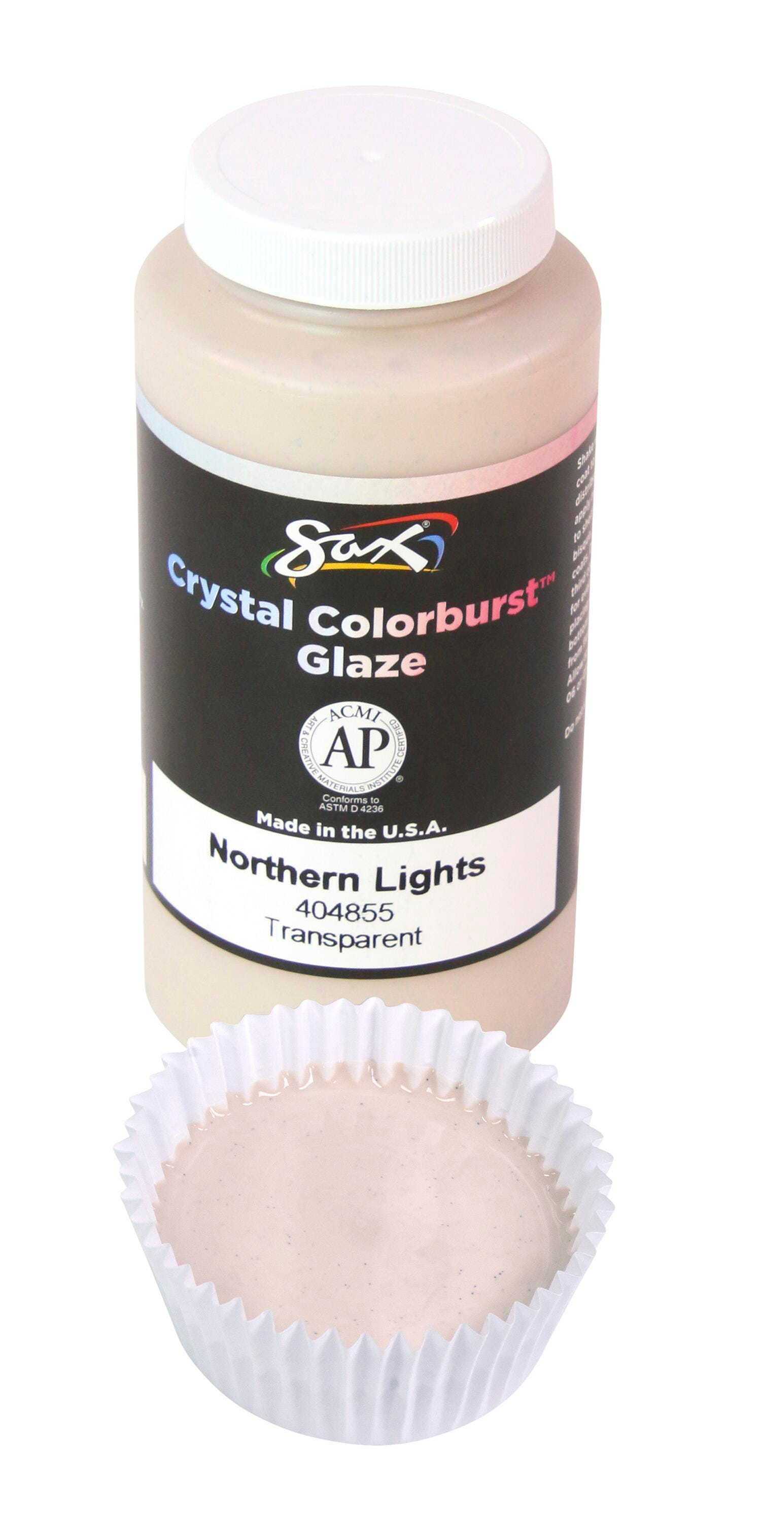 Sax Crystal Magic Glaze in transparent Northern Light features tiny crystals mixed with a speckled base which melt and move during firing, allowing colors to bloom for beautiful, one-of-a-kind designs. Every application and firing will produce different results for unique pottery and ceramic projects. The painting glaze may appear a different color during application and change to the desired look after the required firing in a kiln. Our ceramic glaze paint creates multi-colored patterns when fired. The base glaze fades and crystals will fade and cascade when fired at cone 6.Features