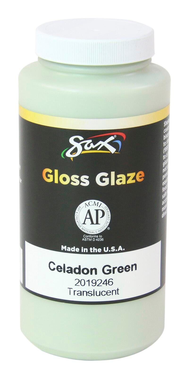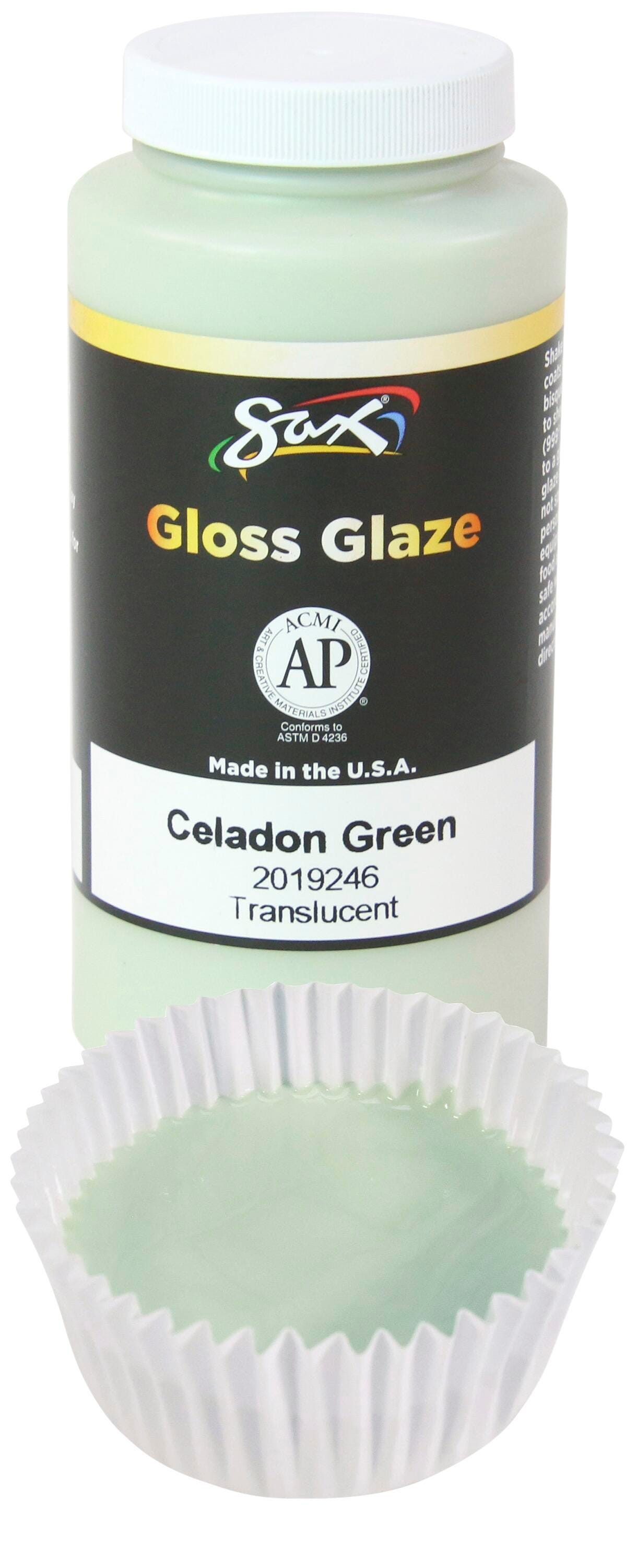 Sax gloss glaze in Celadon Green is a high-quality glazing paint that's non-toxic. The translucent glaze glides smoothly on bisque so no brush strokes will appear in the fired finish. Complete pottery or create new shades by mixing our foundation glazes with each other. During application, the glaze may be a different color and will change to the desired look after the required kiln firing. The color fades to clear when fired at cone 6.Features