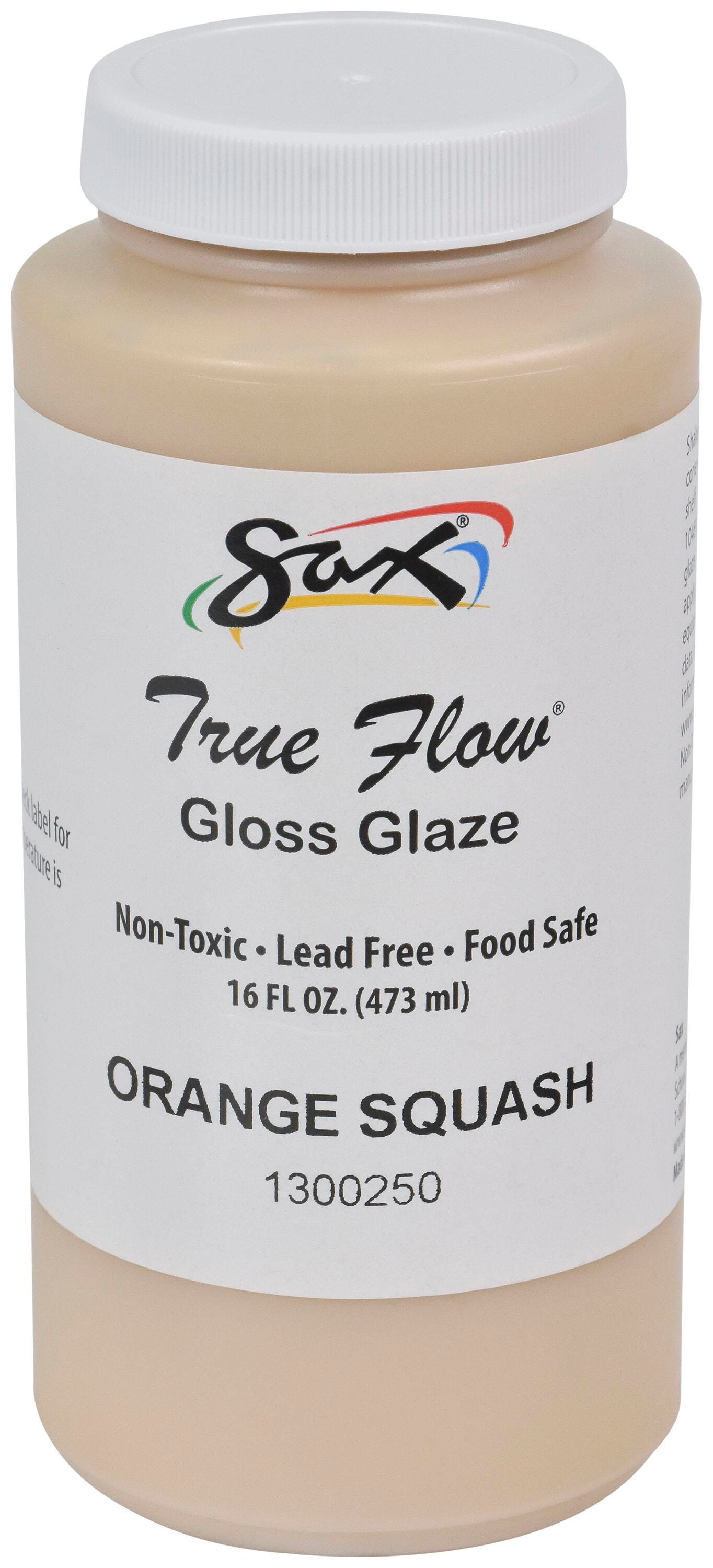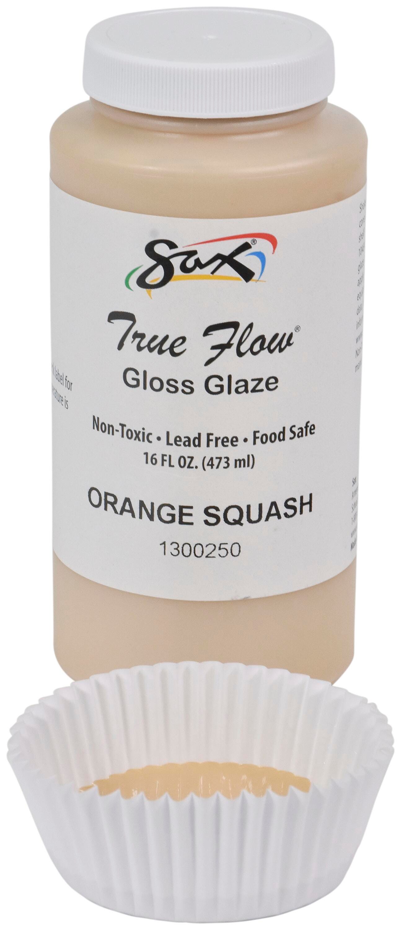 The Sax gloss glaze in opaque Orange Squash is a high-quality glazing paint that's non-toxic and dinnerware safe when fired to cone 06-05. During application, the glaze may be a different color and will change to the desired look after the required kiln firing. The color lightens when fired at cone 6.