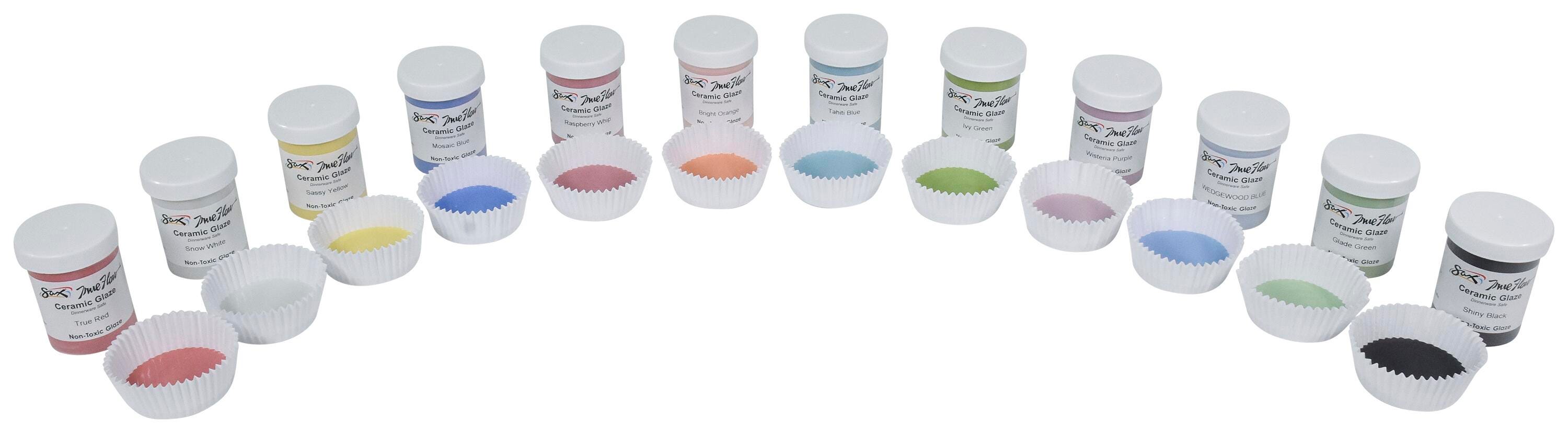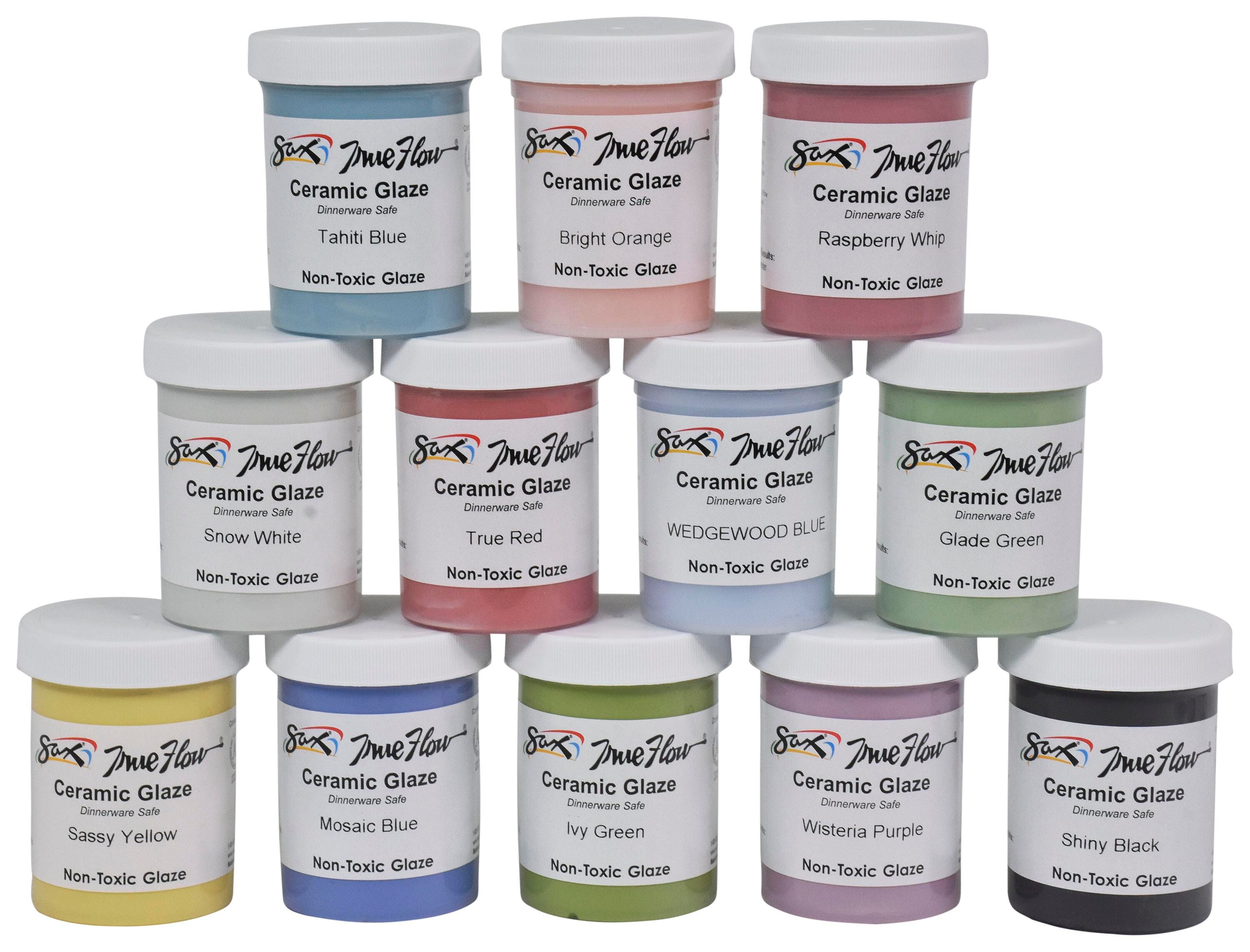 Sax gloss glazes leave your artwork with a beautiful, colorful finish. Complete gorgeous abstract works of art, bowls, vases, and home decorations. The pottery paint coating not only leaves a bold colored finish, but it also helps protect the finished product. Our ceramic glazing meets the FDA standards set for food and is suitable for dishes and mugs. The painting glaze may appear a different color during application and change to the desired look after the required kiln firing. Please see individual colors for firing results when fired at cone 6. This set of 12 contains 4-ounce jars in each of the following colors: Snow White, True Red, Raspberry Whip, Bright Orange, Sassy Yellow, Glade Green, Ivy Green, Tahiti Blue, Wedgewood Blue, Mosaic Blue, Wisteria Purple, and Shiny Black.Features