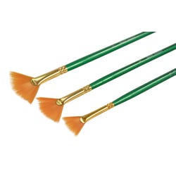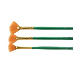 This Sax Optimum golden taklon fan blender brush set includes 3 painting brushes. The convenient mixed sizes of 2, 4, and 6 allow for more possibilities in creating art. From crafting wispy effects to fine-tuning delicate strokes, the artist's brushes help create unique pieces, whether you’re in the classroom or art studio. High-quality and durable golden taklon synthetic bristles are fixed in seamless nickel-plated ferrules for lasting performance, and a long handle allows for enhanced comfort and control on easels. This set contains 3 fan blender brushes, including one each in the sizes 2, 4, and 6.Features