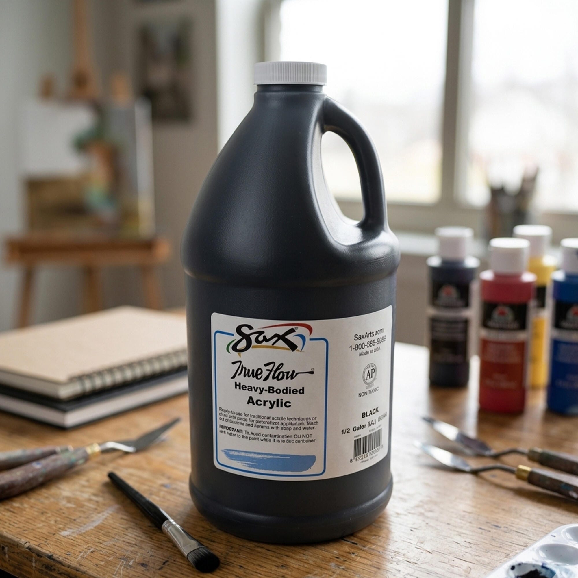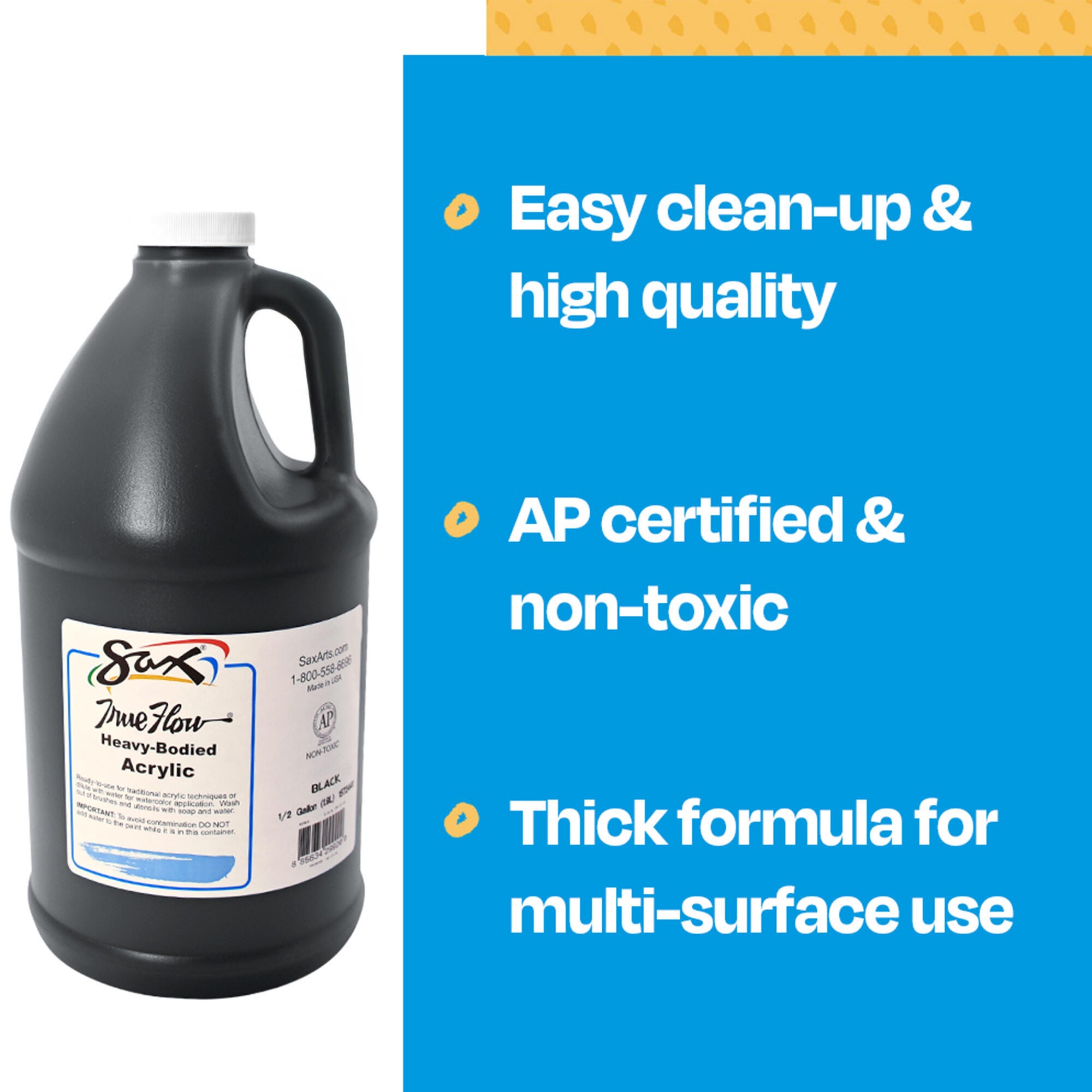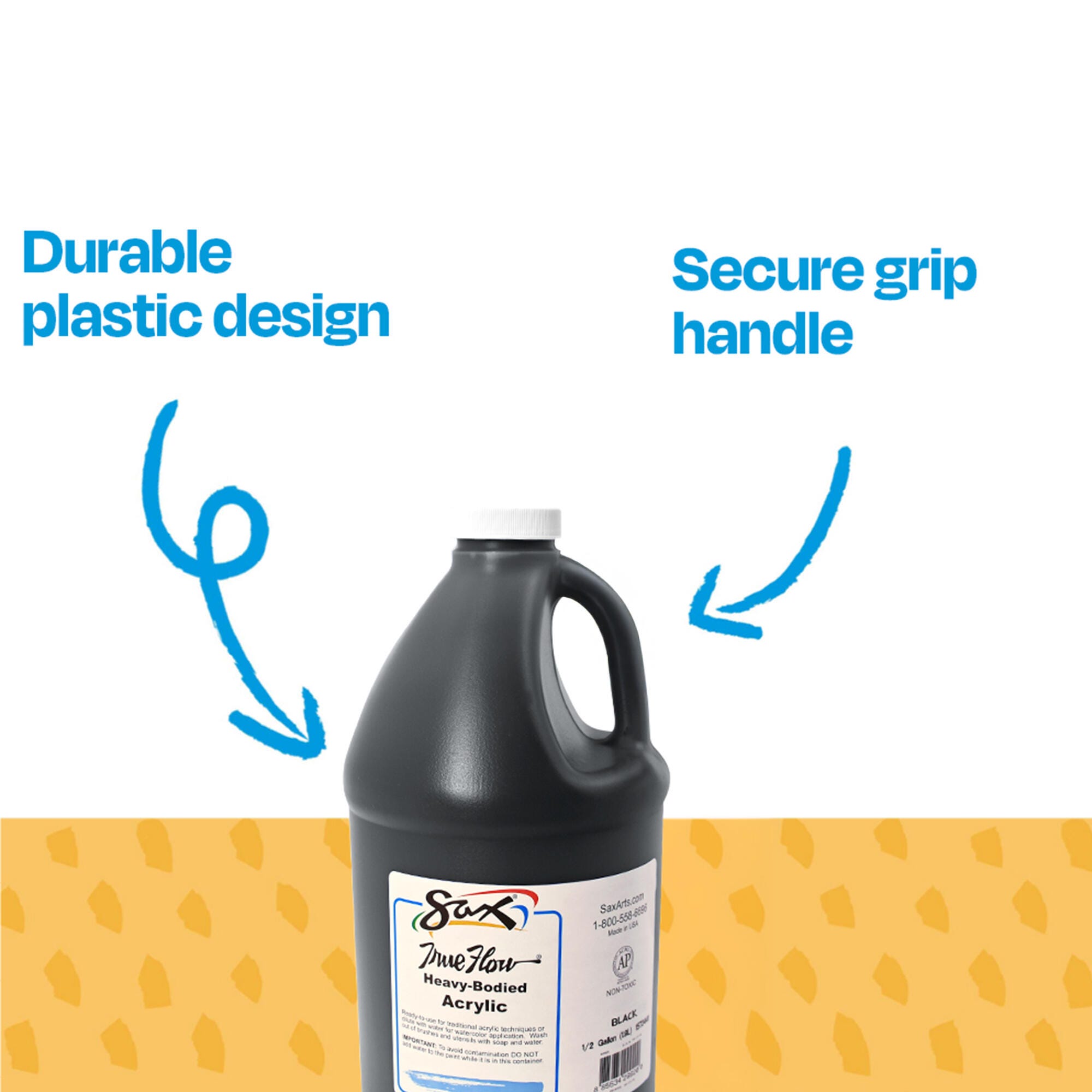 This Sax heavy body acrylic paint in a mars black color comes in a convenient half gallon bottle to accommodate the whole classroom. Non-separating and intermixable for a range of hues, our art paint is easy to apply. This paint dries to a matte finish and is ideal for traditional acrylic painting as well as block printing or silk screening. Enjoy excellent flow, coverage, blending, and drying for a variety of projects. Use the classroom paint for school assignments, art classes, group painting, or background canvas painting. Each acrylic paint comes in a durable plastic container for convenient handling and storage. Not recommended for outdoor use.