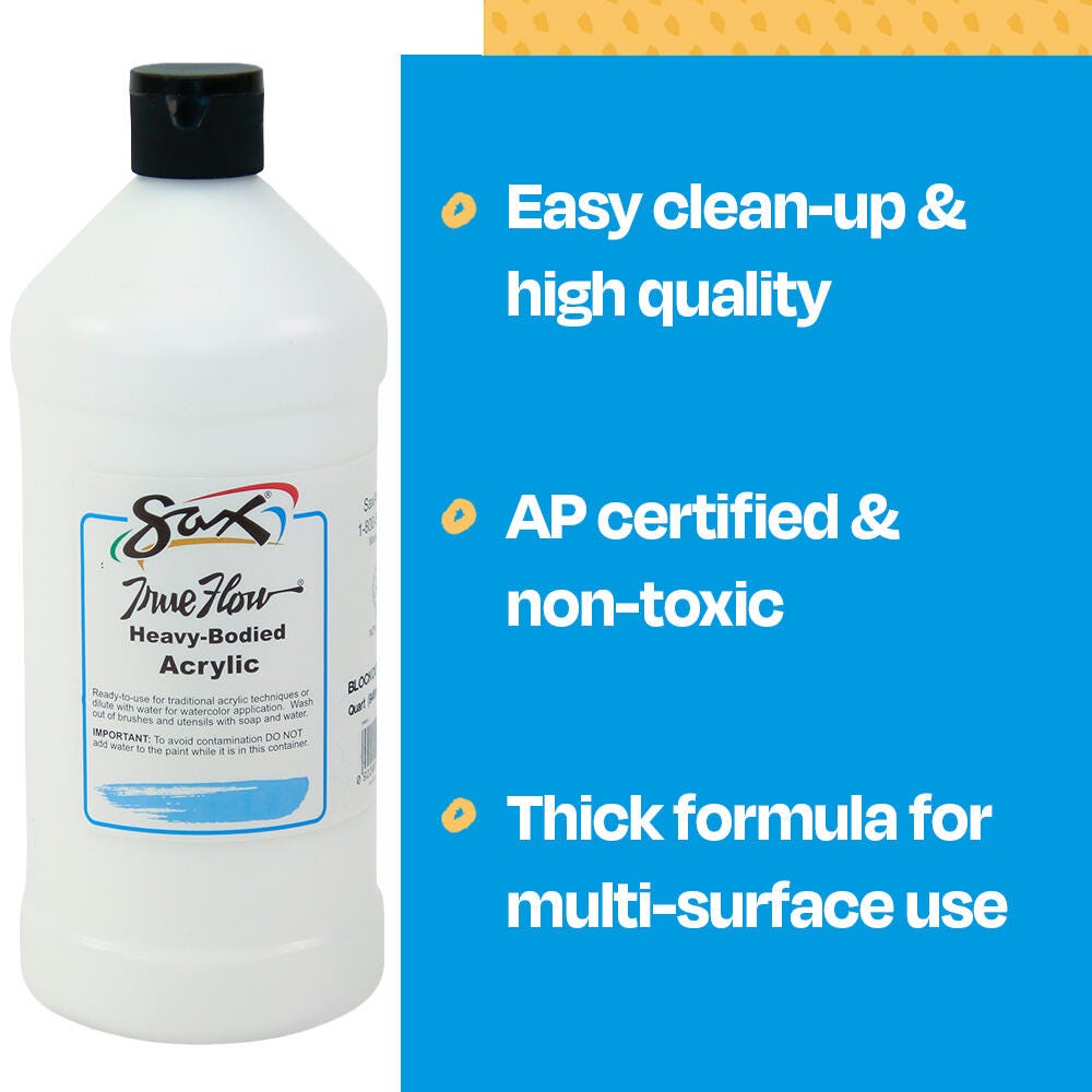 This Sax heavy body acrylic paint in a blockout white color comes in a convenient 1 quart bottle to accommodate the classroom. Non-separating and intermixable for a range of hues, our art paint is easy to apply. This paint dries to a matte finish and is ideal for traditional acrylic painting as well as block printing or silk screening. Enjoy excellent flow, coverage, blending, and drying for a variety of projects. Use the classroom paint for school assignments, art classes, group painting, or background canvas painting. Each acrylic paint comes in a durable plastic container for convenient handling and storage. Not recommended for outdoor use.Features