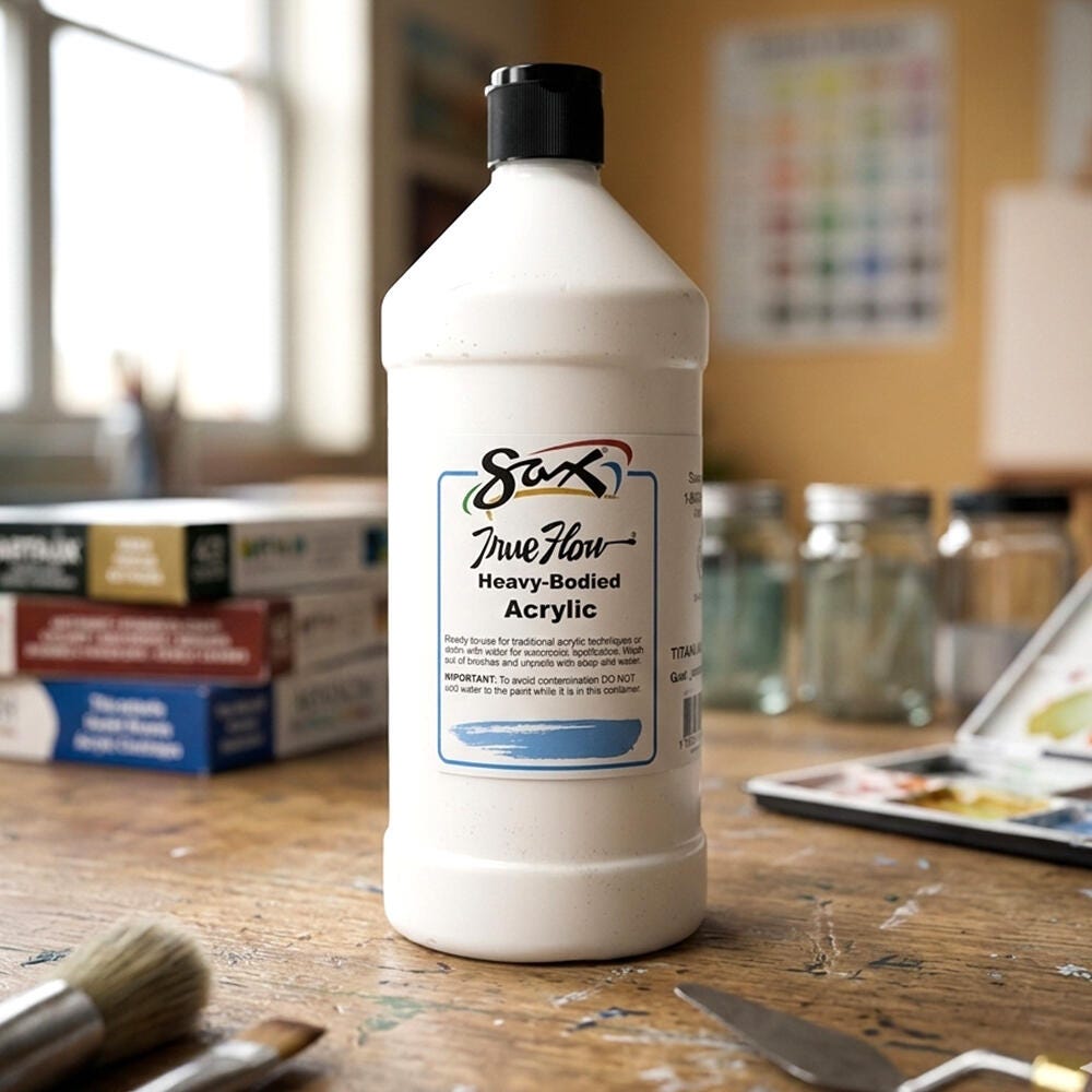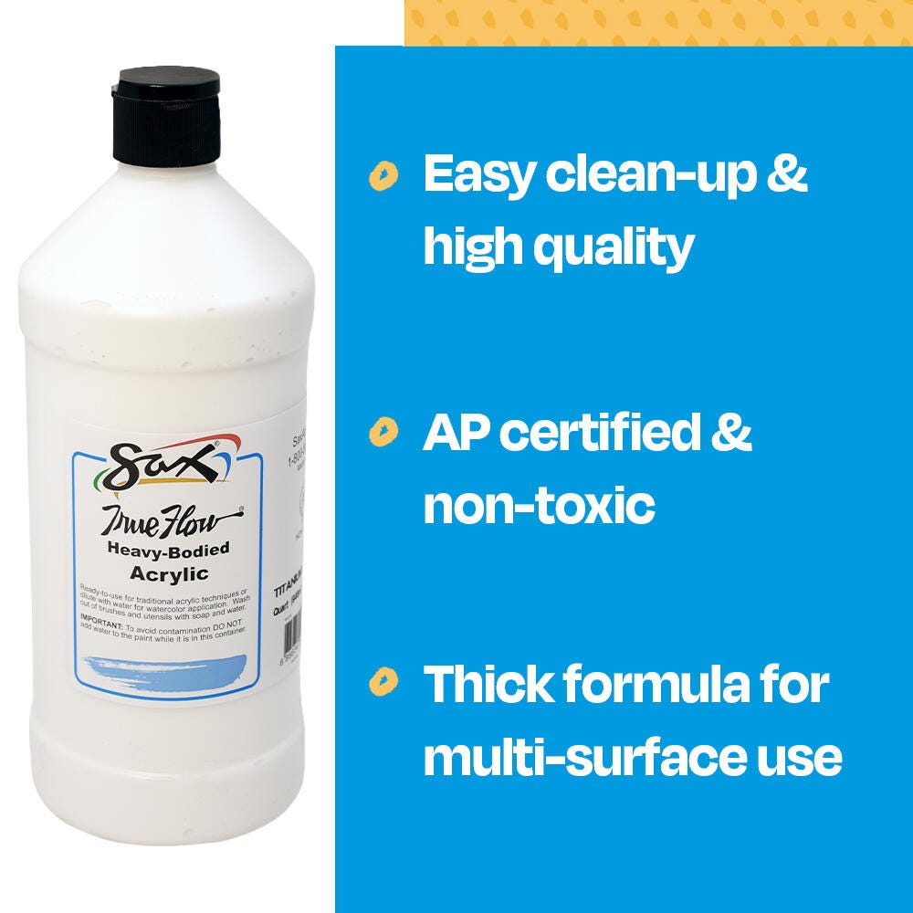 This Sax heavy body acrylic paint in a titanium white color comes in a convenient 1 quart bottle to accommodate the classroom. Non-separating and intermixable for a range of hues, our art paint is easy to apply. This paint dries to a matte finish and is ideal for traditional acrylic painting as well as block printing or silk screening. Enjoy excellent flow, coverage, blending, and drying for a variety of projects. Use the classroom paint for school assignments, art classes, group painting, or background canvas painting. Each acrylic paint comes in a durable plastic container for convenient handling and storage. Not recommended for outdoor use.