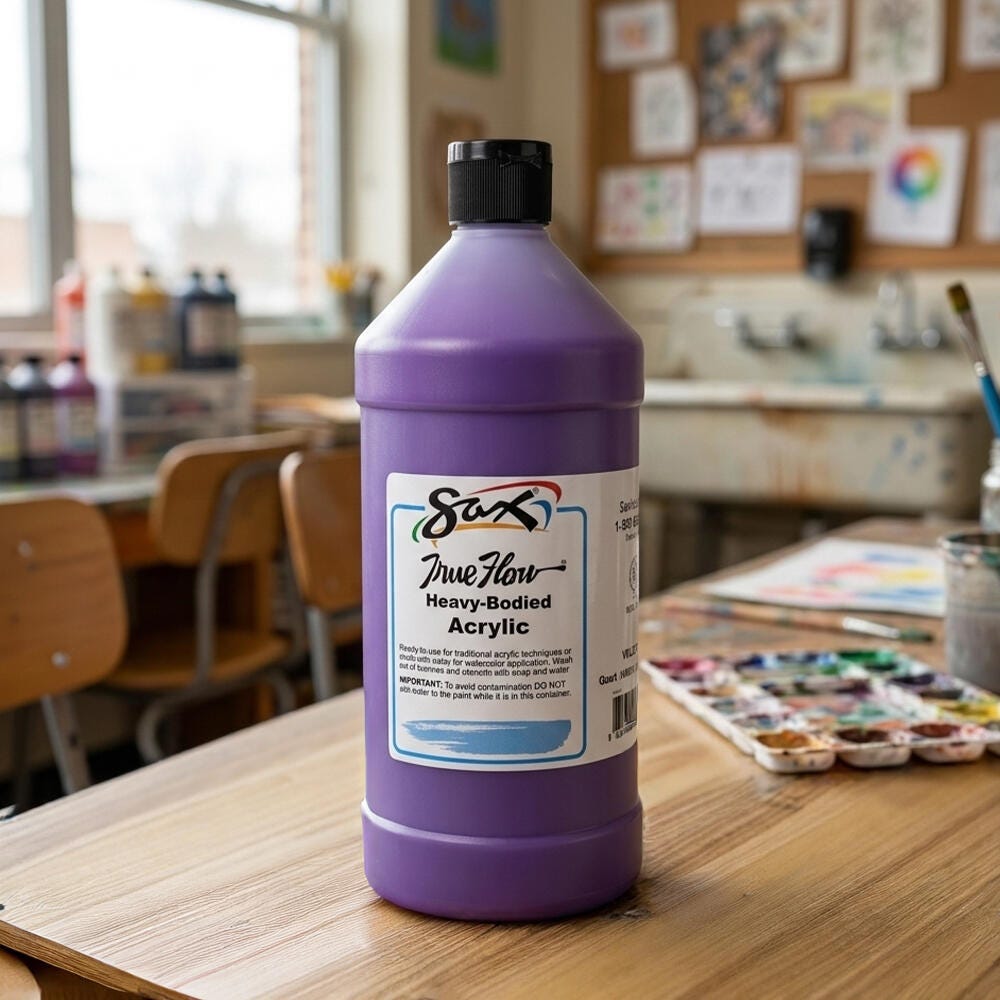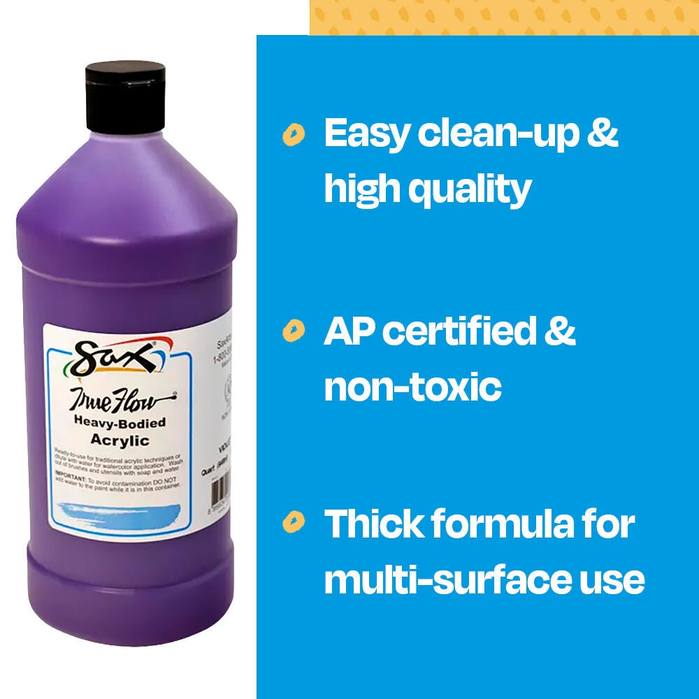 This Sax heavy body acrylic paint in a violet color comes in a convenient 1 quart bottle to accommodate the classroom. Non-separating and intermixable for a range of hues, our art paint is easy to apply. This paint dries to a matte finish and is ideal for traditional acrylic painting as well as block printing or silk screening. Enjoy excellent flow, coverage, blending, and drying for a variety of projects. Use the classroom paint for school assignments, art classes, group painting, or background canvas painting. Each acrylic paint comes in a durable plastic container for convenient handling and storage. Not recommended for outdoor use.