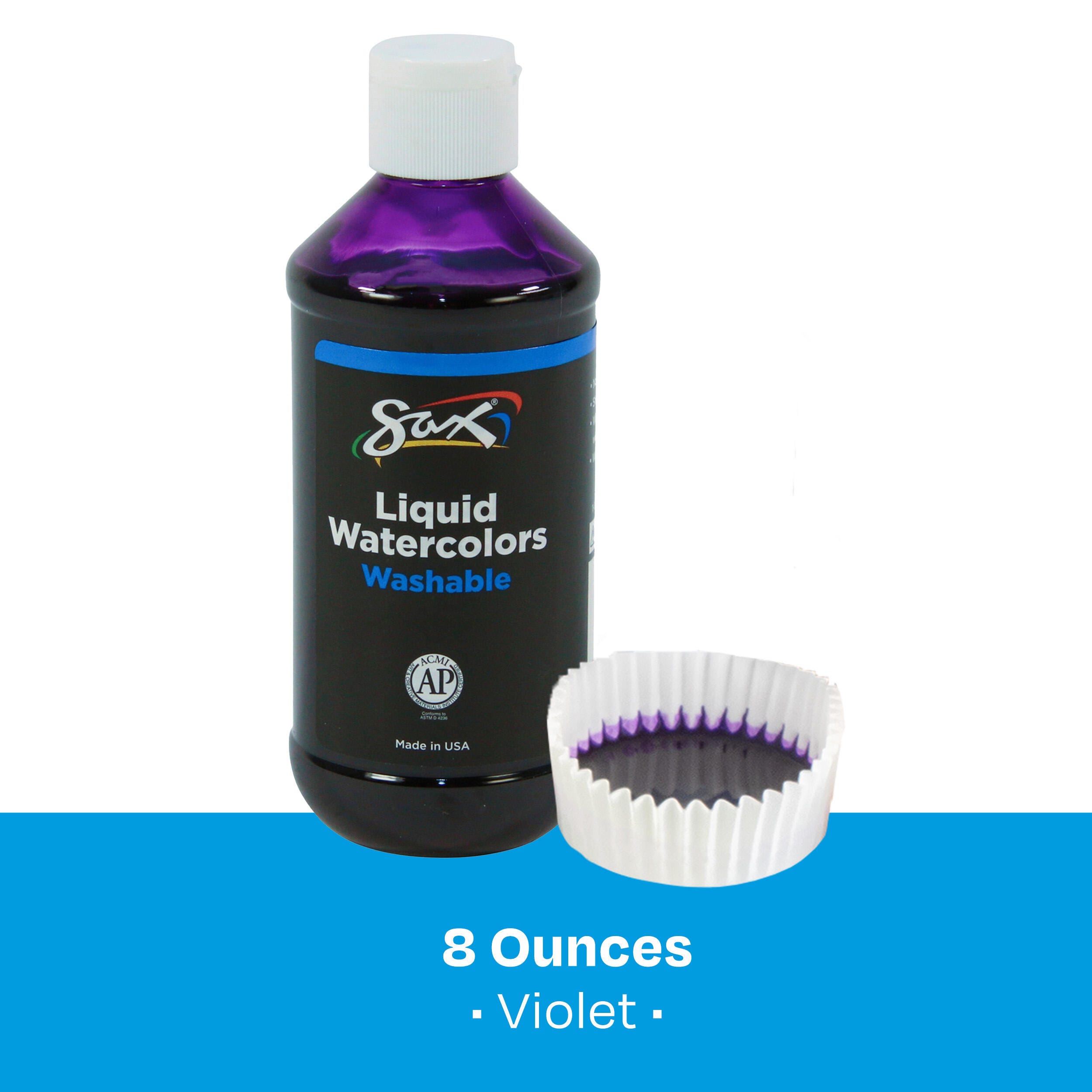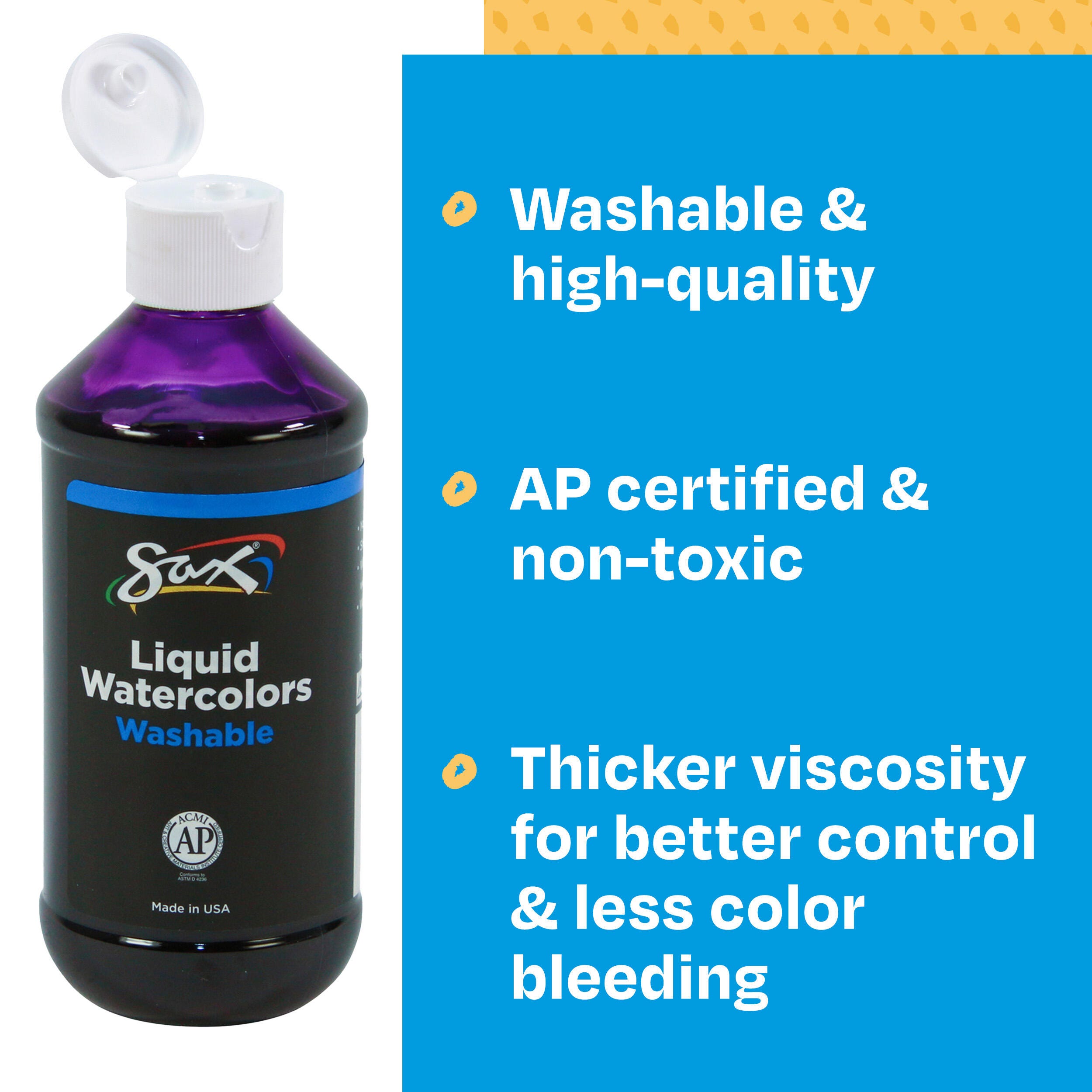This Sax liquid washable watercolor paint comes in a violet color. The liquid medium provides rich hues straight from the bottle with beautiful results when dried on paper or other materials. A thicker viscosity allows for better control and easier dispensing, along with increased surface tension for less color bleeding. Use this paint at full strength (undiluted) or dilute as needed with water for soft, muted colors. The formula is washable, easy to clean from hands with soap and water, and rinses out of most fabrics. Enjoy easy pouring with a plastic jug that can be poured from the big-mouth opening or dispensed slowly from the snap-down pour spout. Shake well before use.