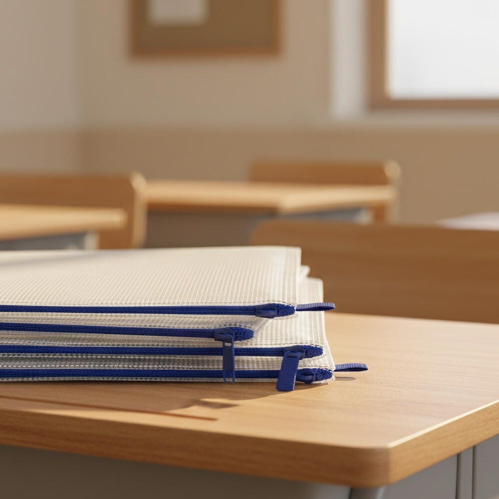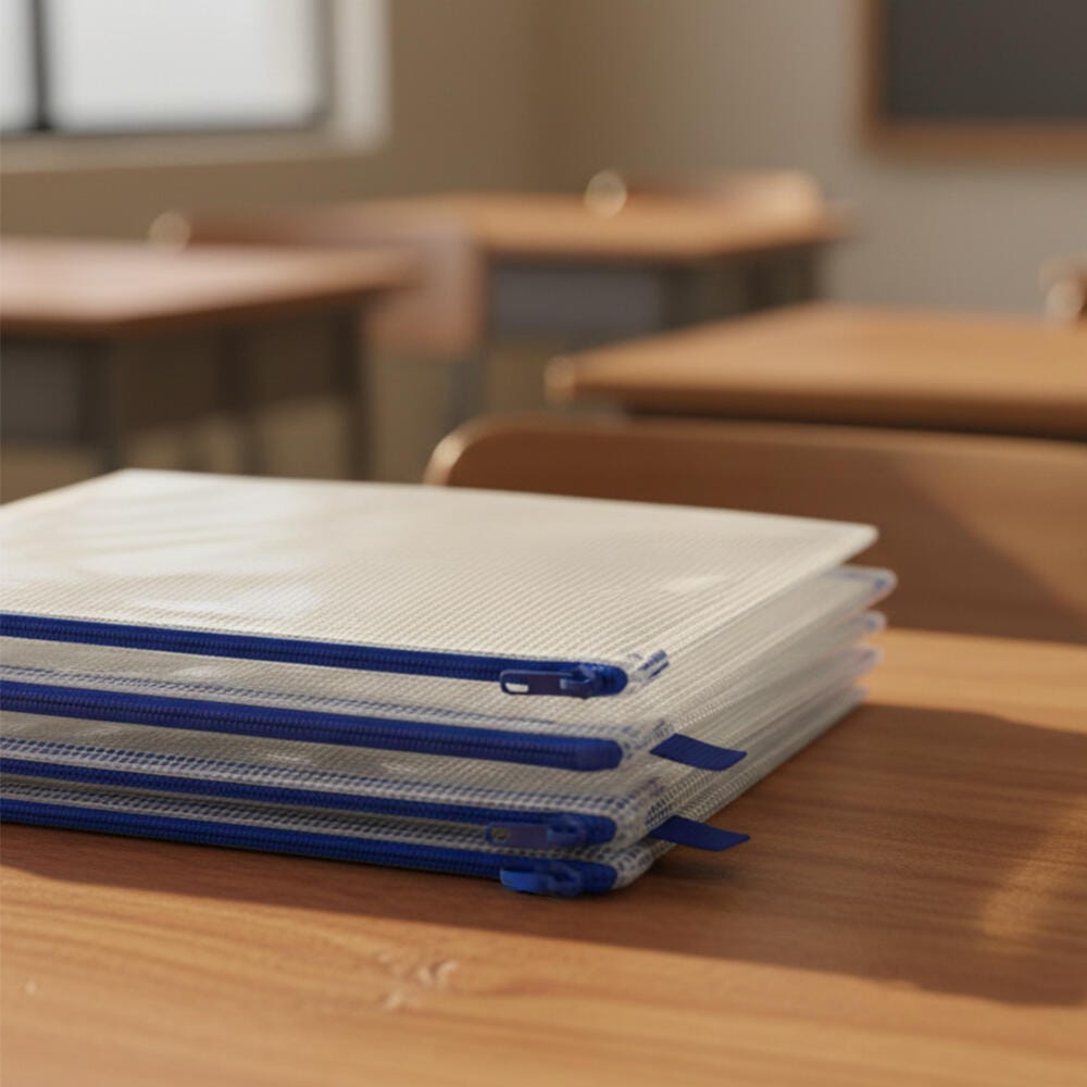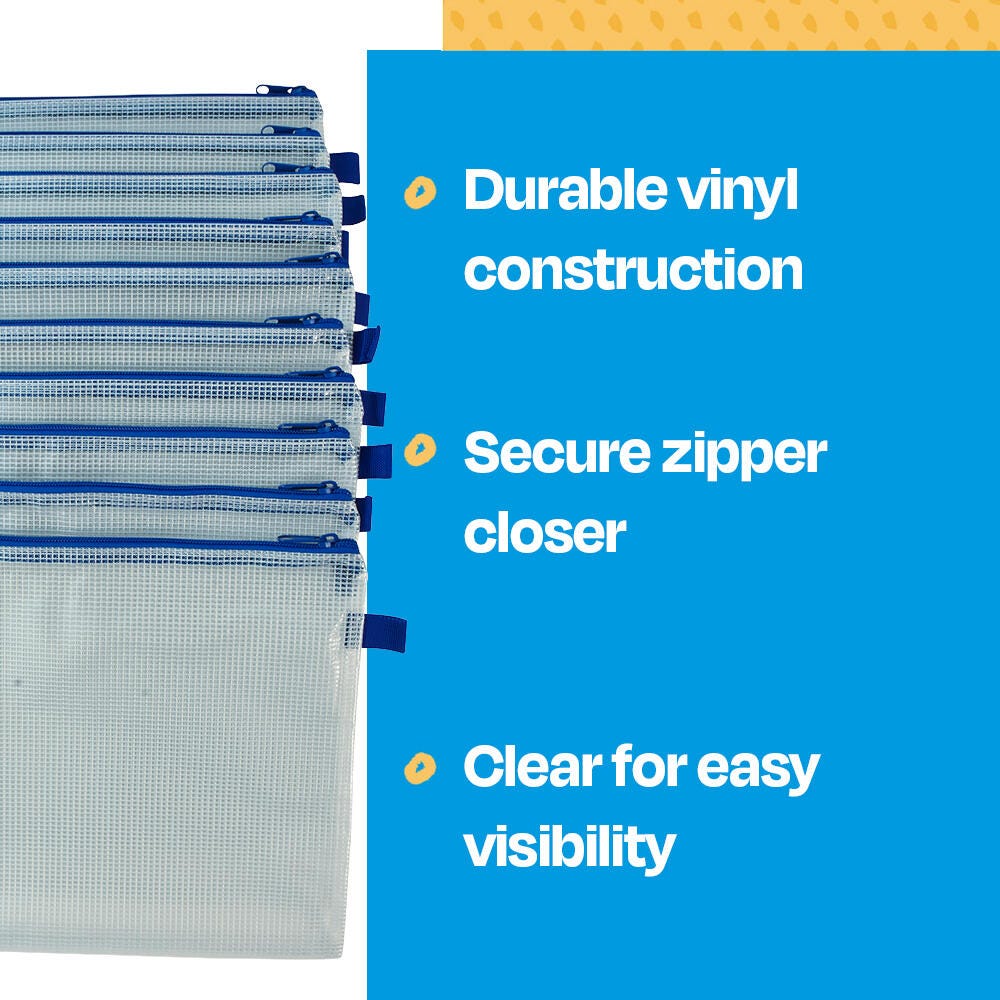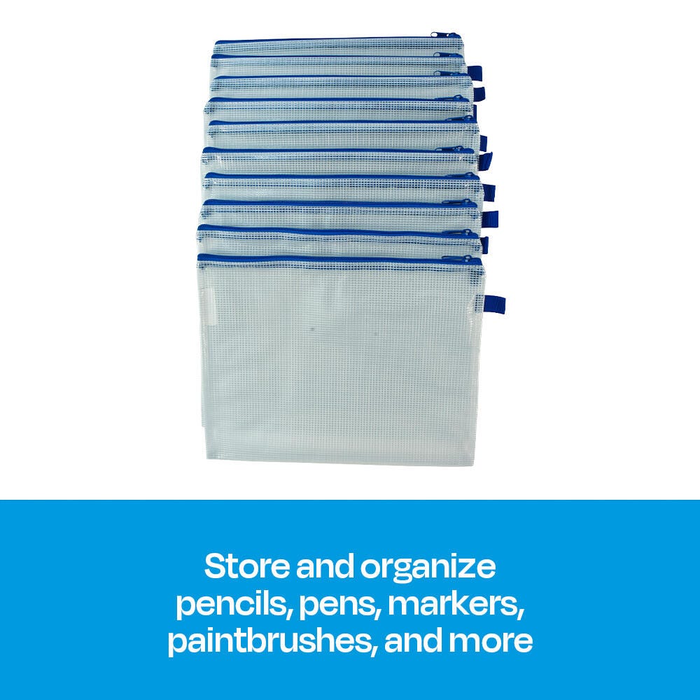 Sax mesh tool case pouches are a durable, reliable solution for storing small school supplies like pens, pencils, crayons, glue, markers, and paintbrushes. An easy-to-use zipper helps keep items all in one spot while the clear, see-through construction helps keep track of materials. The organizer measures 10 x 13 inches and features a fabric loop for hanging on wall hooks and lockers. This pack contains 10 pouches.