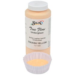 Sax Squash Yellow underglaze paint comes in a concentrated opaque liquid color. Decorate pottery with this glazing paint that's ready for use on clay, greenware, and bisque. The color may be a different shade during application and will change to the desired look after the required kiln firing. This painting medium's color slightly darkens when fired at cone 6. Our high-quality underglaze has a matte look after firing and can be transformed to a shiny, rich glaze appearance with a transparent glaze coating on top.Features