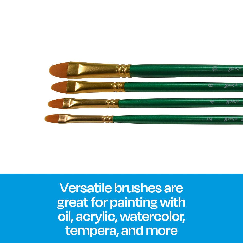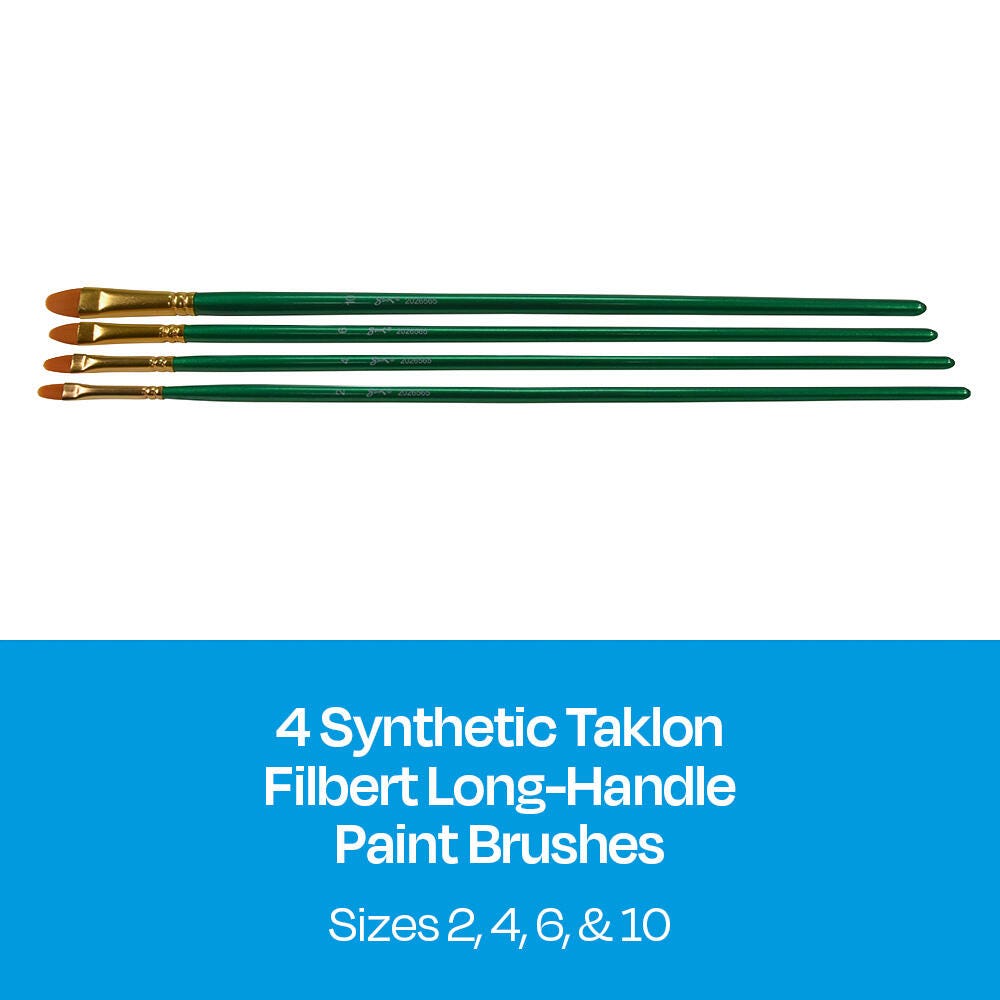 Sax Optimum golden taklon paint brushes have filbert tips and long handles for easier blending and detailed painting. This multi-pack comes with assorted sizes, including one each of 2, 4, 6, and 10. Mixed filbert sizes allow for more options when painting with oils and acrylics. A long handle design enables better control and comfort when painting on easels, and each brush is handcrafted with high-quality, durable materials to promote long-lasting use.Features