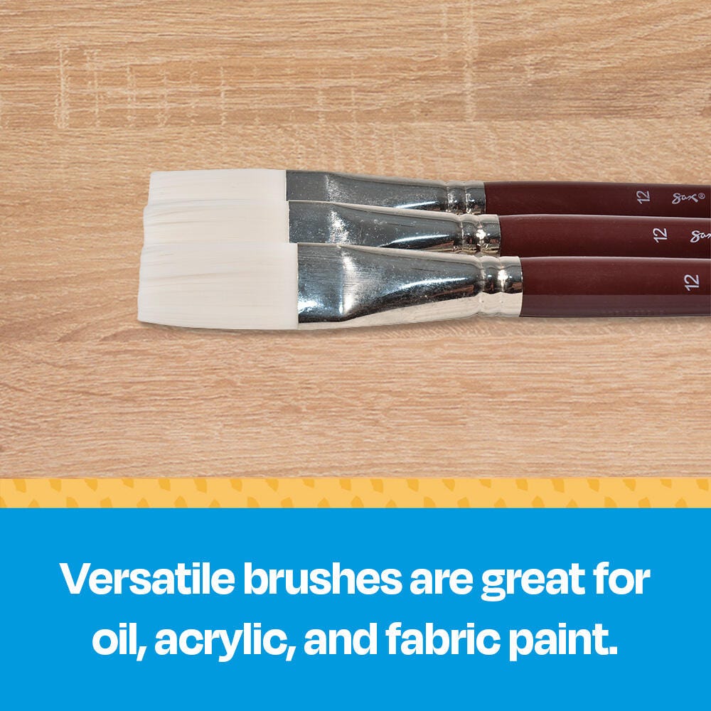 Sax optimum white synthetic taklon paint brushes (size 12) are durable, high-quality, and give you better control. Hand-crafted with white nylon taklon for clean brush strokes, the flat brushes come with long handles for better comfort. The longer handle size allows for better control with easel painting. Get predictable brush strokes every time with great color capacity, crisp edges, and sharp points on our synthetic brushes. The tip springs back even on rough watercolor paper. Our 3-pack of taklon brushes is perfect for all of your crafting needs in the class or art studio. Use the paint set for oil, acrylic, and watercolor painting.Features