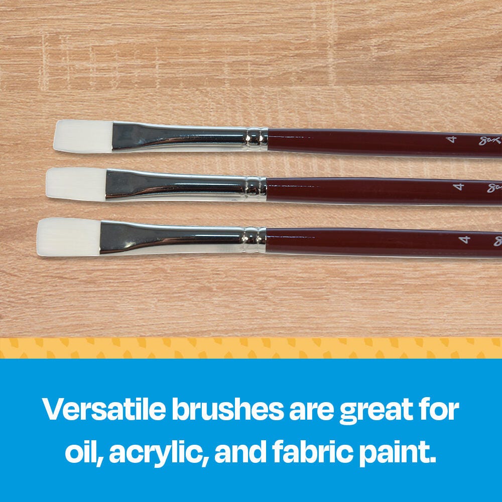 Sax Optimum white synthetic taklon paint brushes (size 4) are durable, high-quality, and give you better control. Hand-crafted with white nylon taklon for clean brush strokes, the flat brushes come with long handles for better comfort when easel painting. Get predictable brush strokes every time with great color capacity, crisp edges, and sharp points on our synthetic brushes. The tip springs back even on rough watercolor paper. Our 3-pack of taklon brushes is perfect for all your crafting needs in the classroom or art studio. Use the paint set for oil, acrylic, and watercolor painting.Features