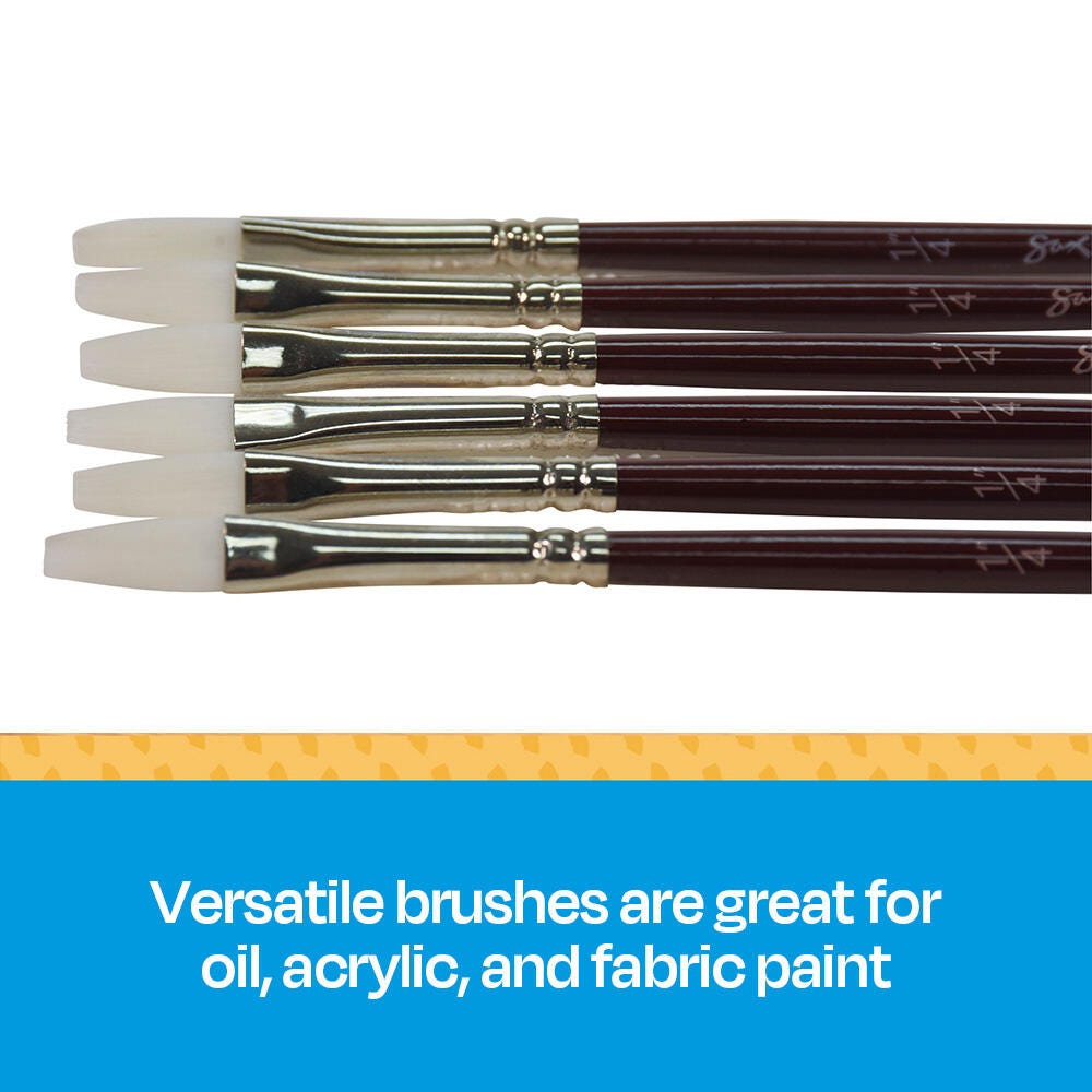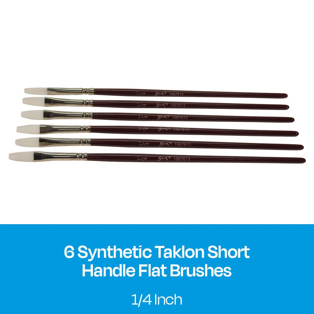 Sax Optimum white synthetic taklon paint brushes (size 1/4 inch) are durable, high-quality, and give you better control. Hand-crafted with white nylon taklon for clean brush strokes, the flat brushes come with short handles for better comfort when working close to artwork. Get predictable brush strokes every time with great color capacity, crisp edges, and sharp points on our synthetic brushes. The tip springs back even on rough watercolor paper. Our 6-pack of taklon brushes is perfect for all your crafting needs in the classroom or art studio. Use the paint set for oil, acrylic, and watercolor painting.Features