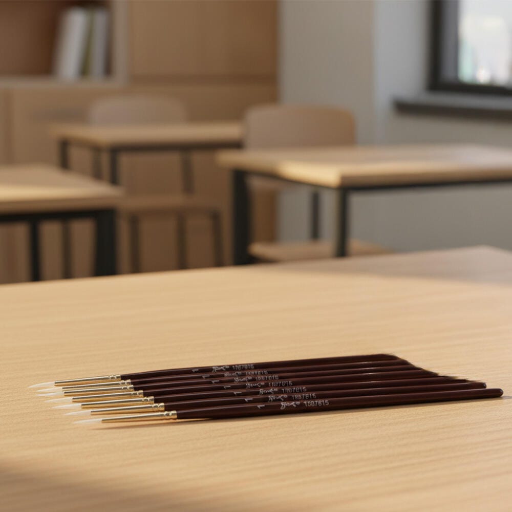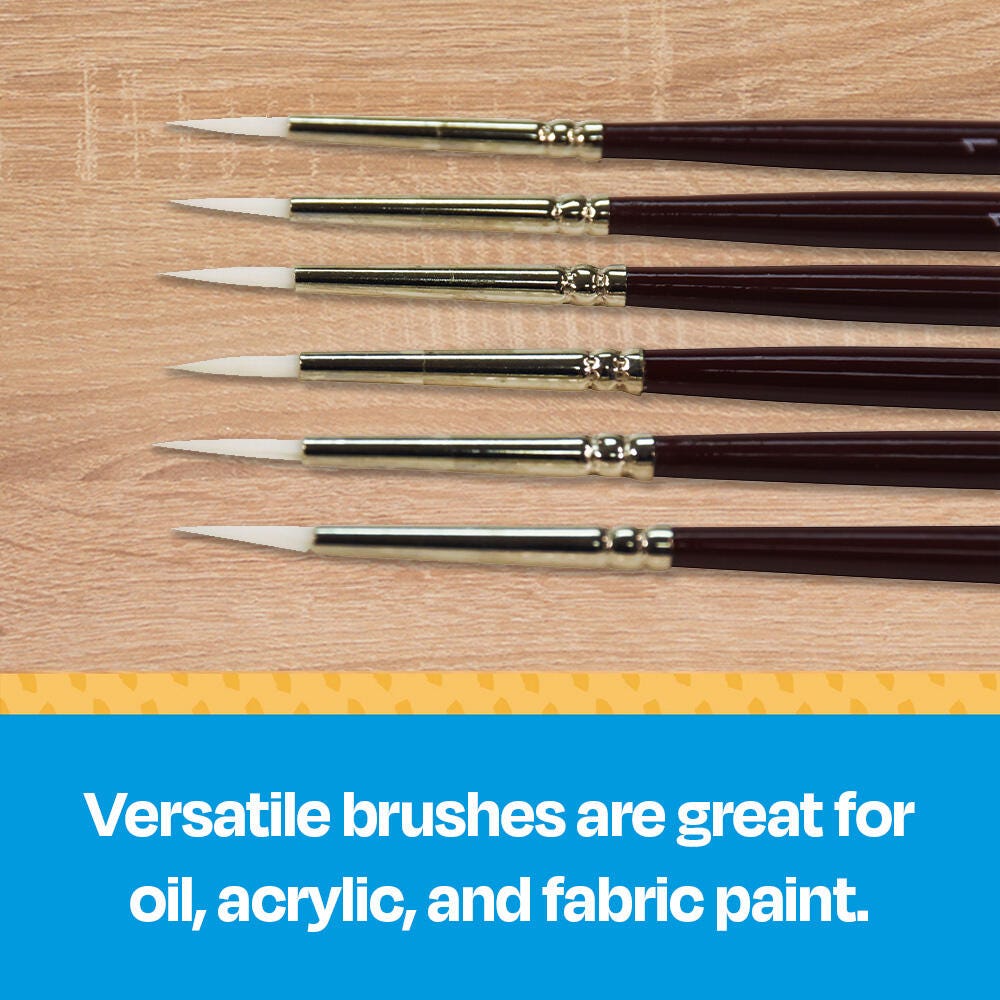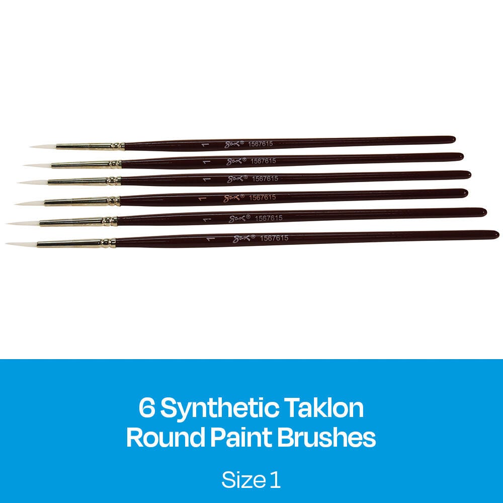 Sax white synthetic taklon paint brushes with short handles and round tips are durable, high-quality, and give you better control. They’re hand-crafted with white nylon taklon for clean brush strokes, and the short handle size allows for more precise, intricate brush strokes when working close to artwork. Get predictable brush strokes every time with great color capacity, crisp edges, and sharp points. The tip springs back even on rough watercolor paper. Our 6-pack of synthetic bristle brushes is perfect for all your crafting needs in the classroom or art studio. Use the size 1 brushes for very fine detail, small spaces, and lines. White synthetic hair brushes are great with different mediums, including oil, acrylic, and watercolors.