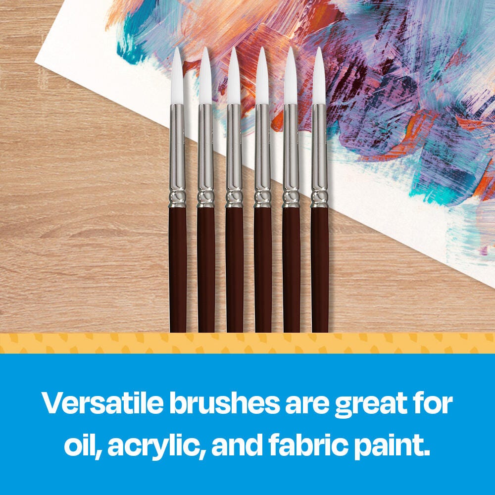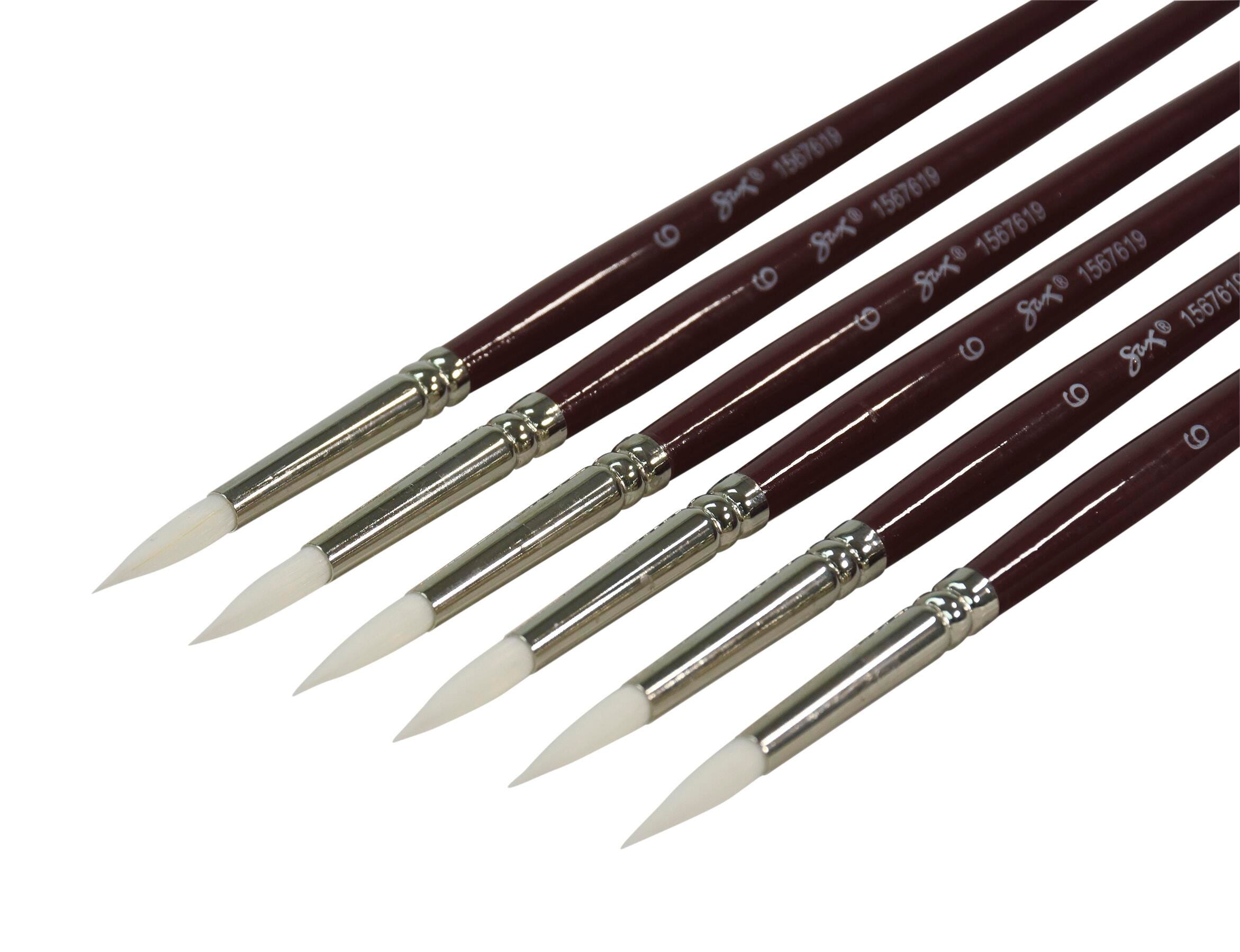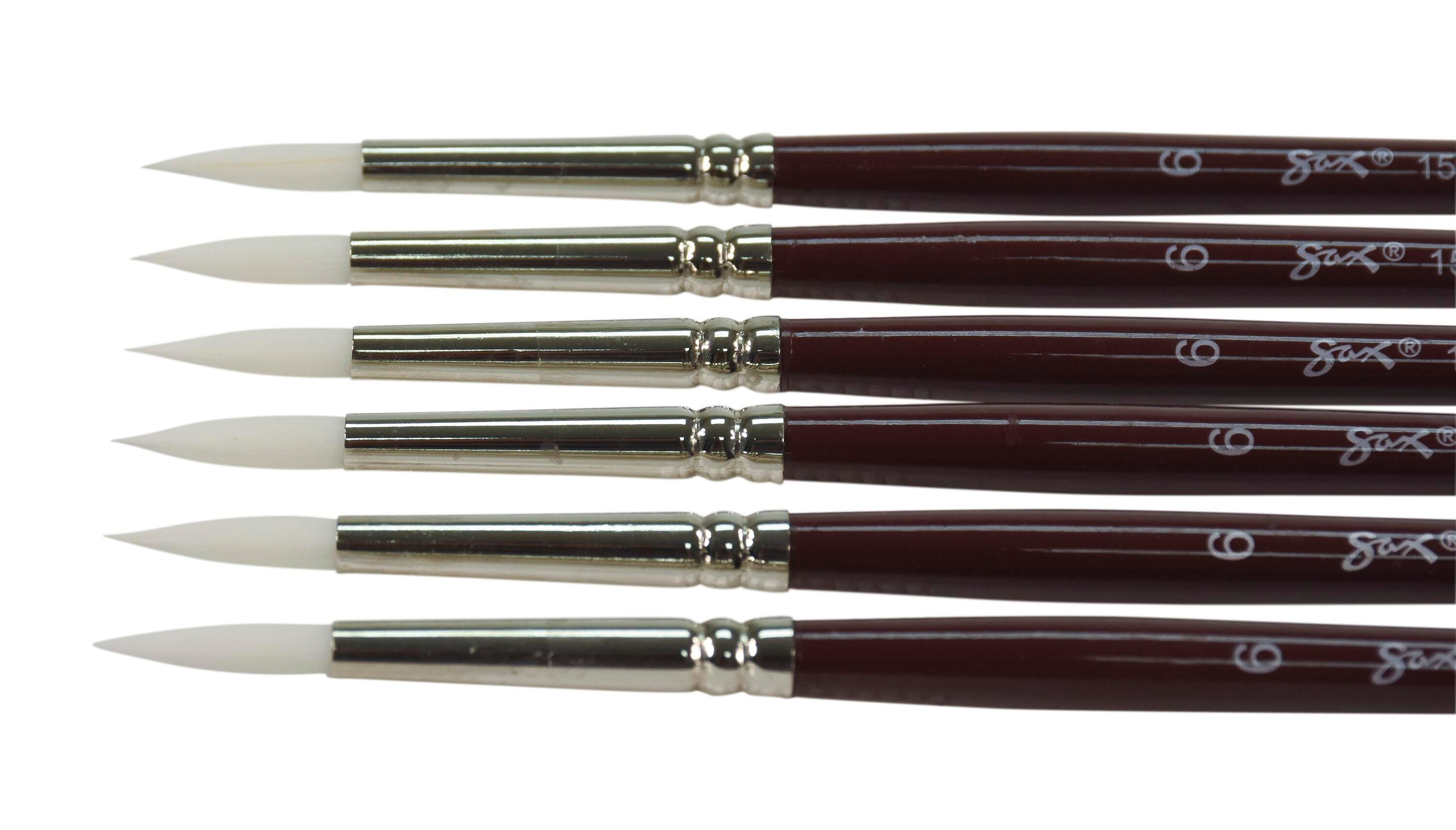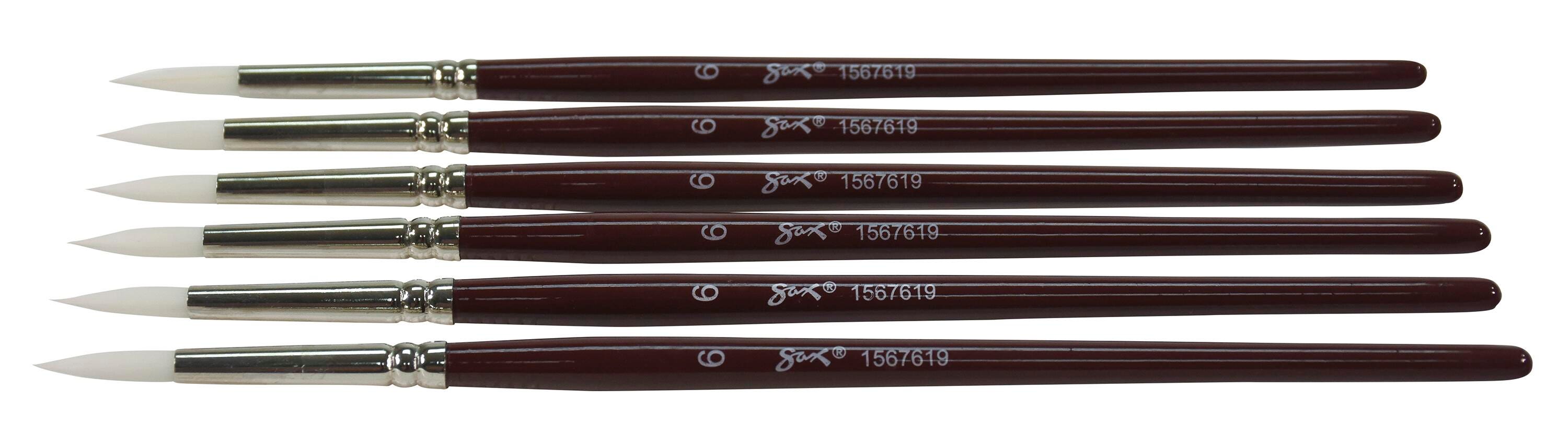 Sax white synthetic taklon paint brushes with short handles and round tips are durable, high-quality, and give you better control. They’re hand-crafted with white nylon taklon for clean brush strokes, and the short handle size allows for more precise, intricate brush strokes when working close to artwork. Get predictable brush strokes every time with great color capacity, crisp edges, and sharp points. The tip springs back even on rough watercolor paper. Our 6-pack of synthetic bristle brushes is perfect for all your crafting needs in the classroom or art studio. Use the size 6 brushes for detail, small spaces, and lines. White synthetic hair brushes are great with different mediums, including oil, acrylic, and watercolors.Features
