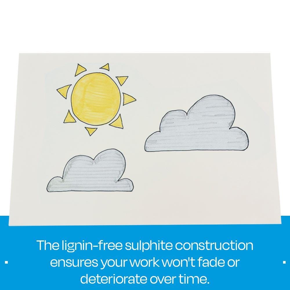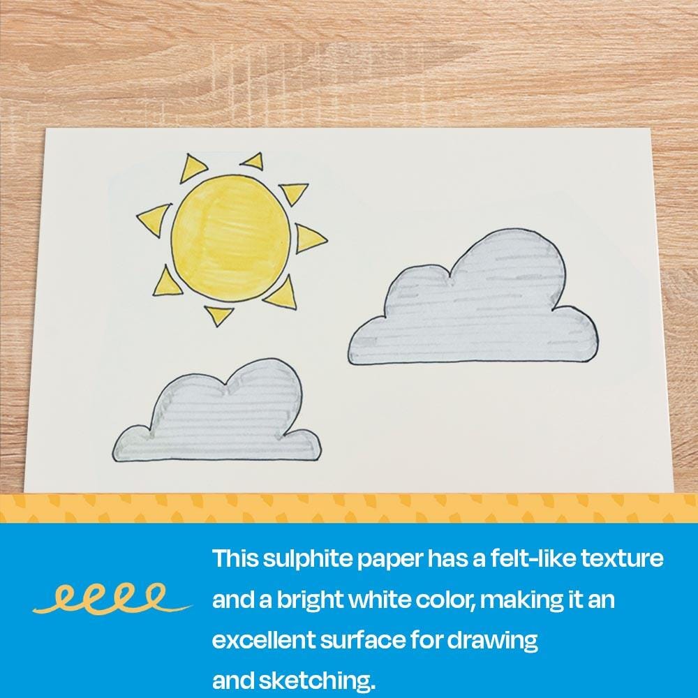 This high-quality, 100 percent sulphite paper from Sax is standard weight and accepts dry media and wet media, including tempera, watercolor, and brushed-applied ink. The paper has exceptional body and strength, perfect texture for all dry media renderings, and erases well. The brilliant white stock enhances colored pencil, heavy black pencil, and charcoal drawings.