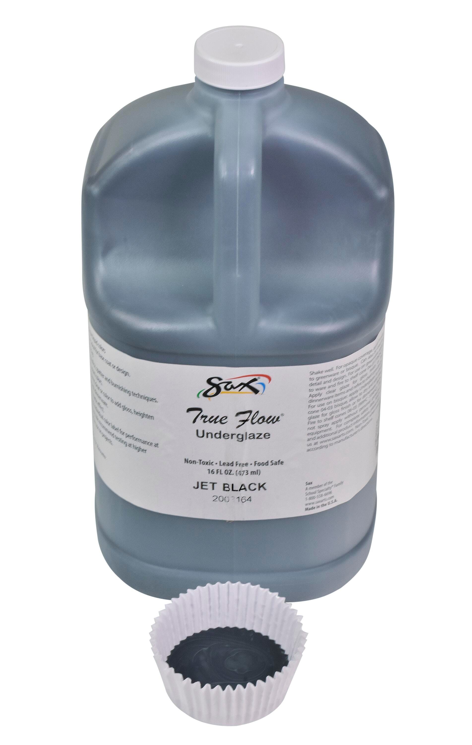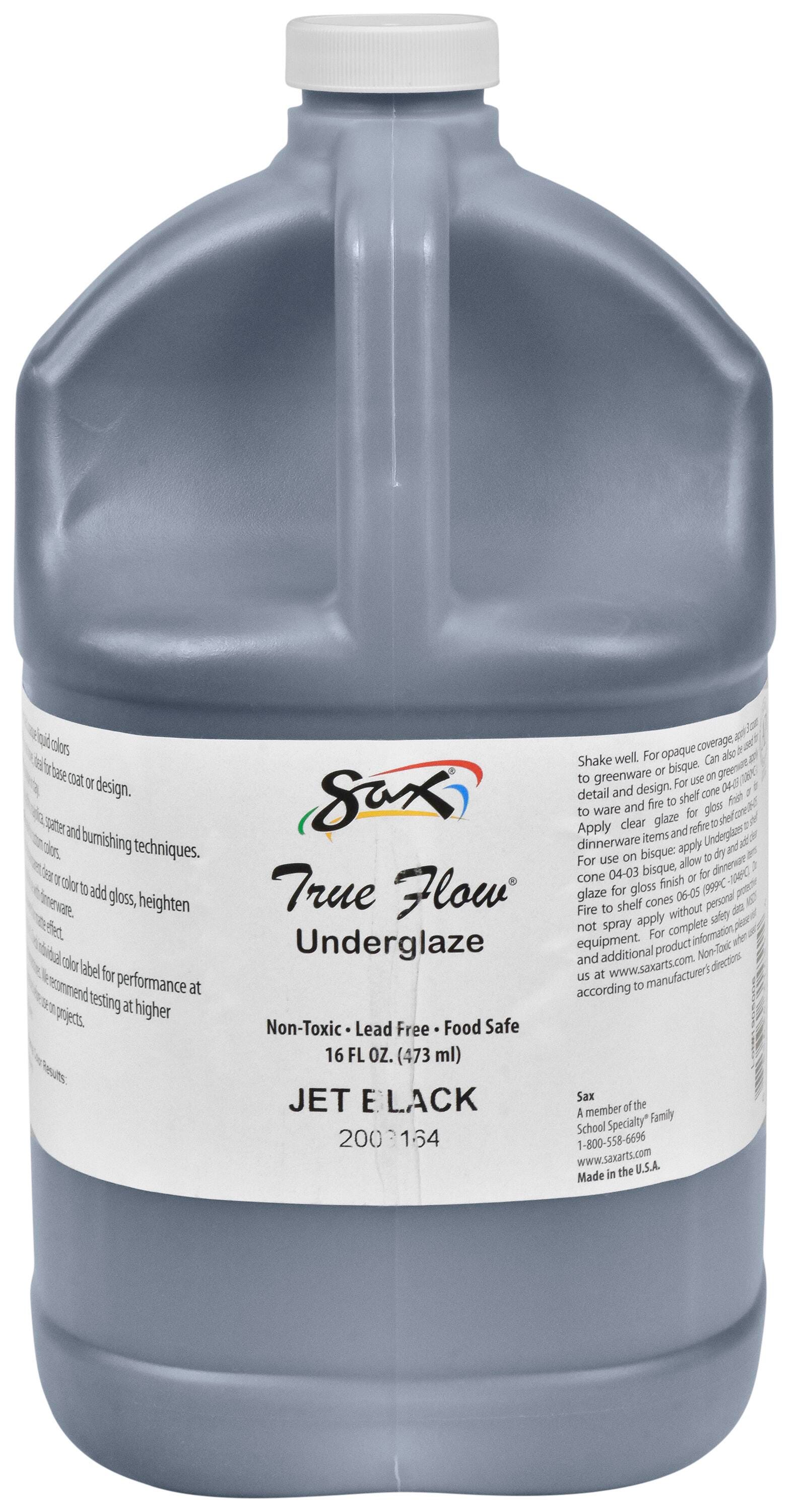 Sax Jet Black underglaze paint comes in a concentrated opaque liquid color. Decorate pottery with this glazing paint that's ready for use on clay, greenware, and bisque. The color may be a different shade during application and will change to the desired look after the required kiln firing. This painting medium's color does not change when fired at cone 6. Our high-quality underglaze has a matte look after firing and can be transformed to a shiny, rich glaze appearance with a transparent glaze coating on top.Features