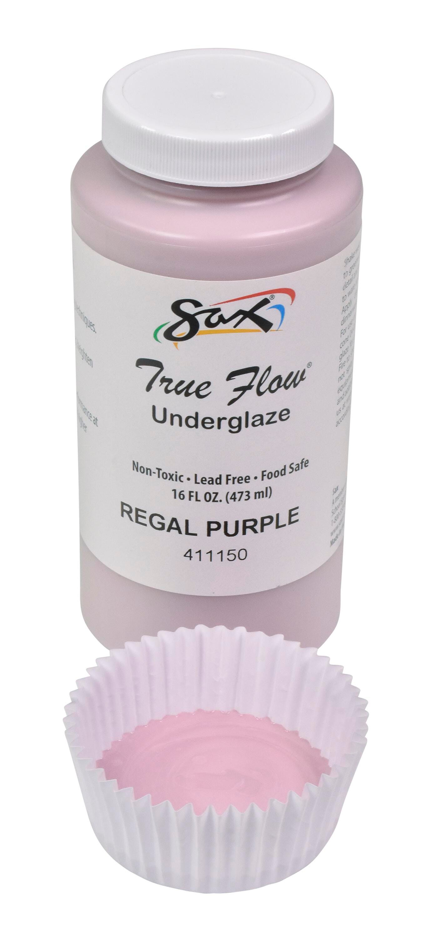 Sax Regal Purple underglaze paint comes in a concentrated opaque liquid color. Decorate pottery with this glazing paint that's ready for use on clay, greenware, and bisque. The color may be a different shade during application and will change to the desired look after the required kiln firing. This painting medium's color slightly darkens when fired at cone 6. Our high-quality underglaze has a matte look after firing and can be transformed to a shiny, rich glaze appearance with a transparent glaze coating on top.Features