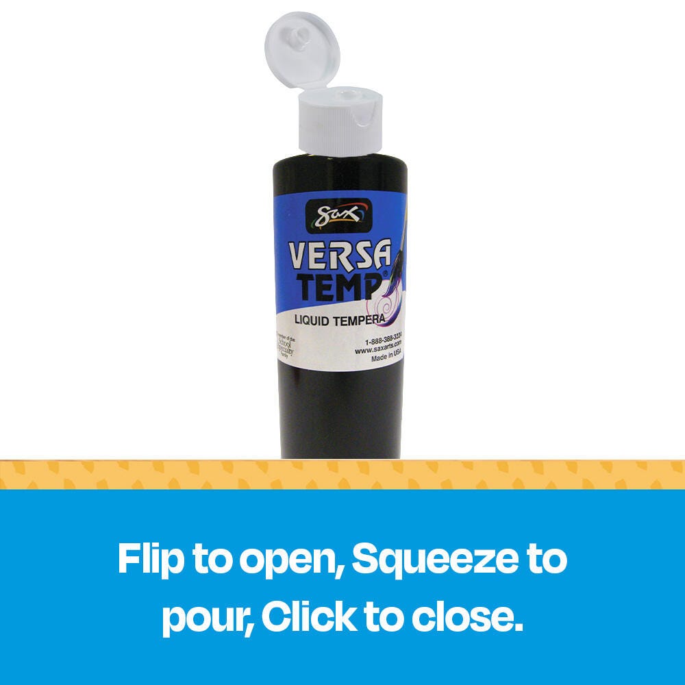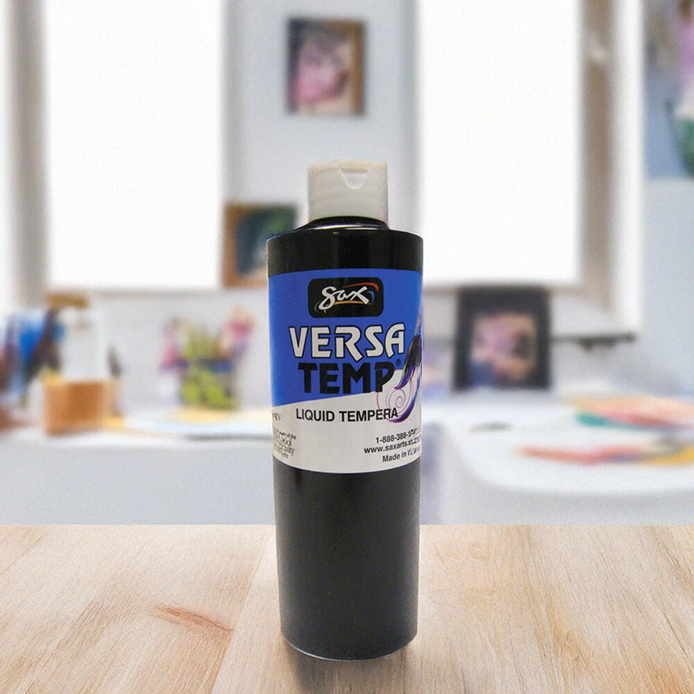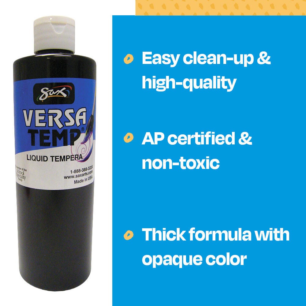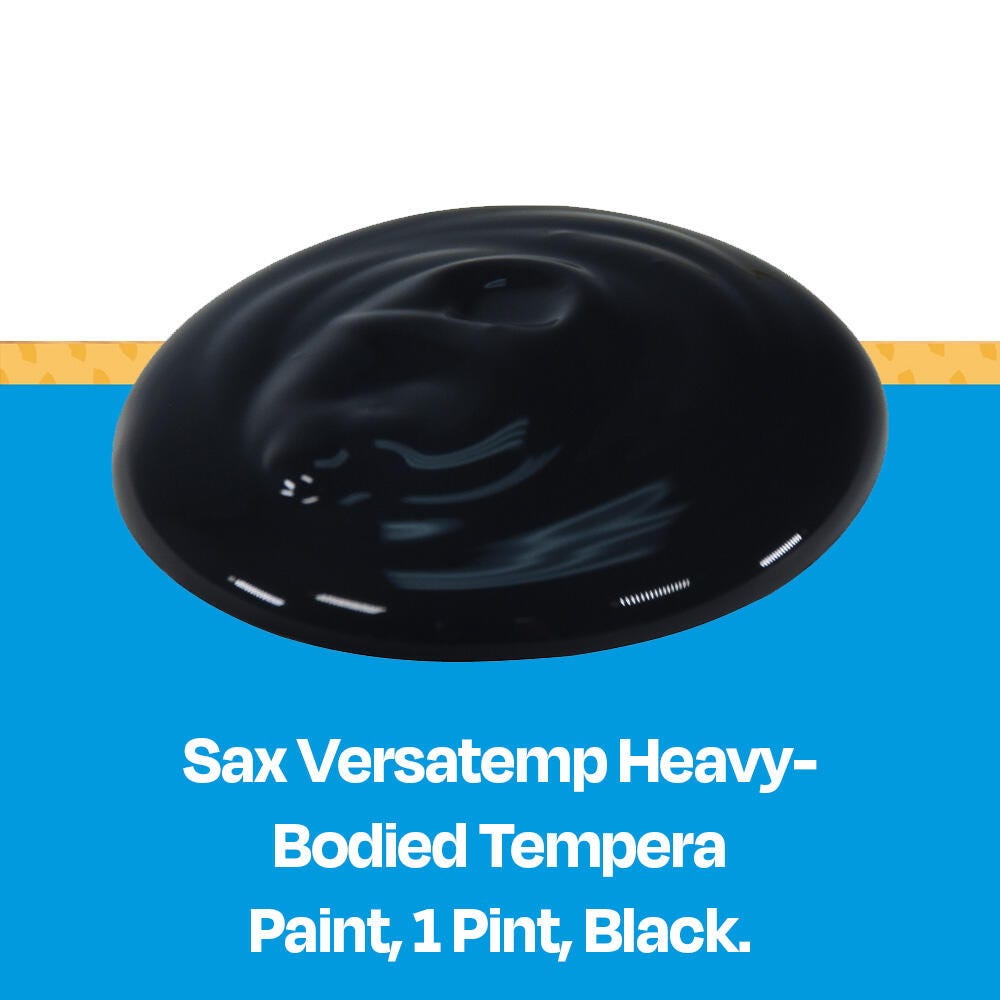 Sax Versatemp heavy-bodied tempera paint in black produces bold, vibrant results. Foster creativity with a paint that resists cracking and chipping. The convenient pint bottle is easy to pour and store, and is perfect for sharing in the classroom. Complete art projects, posters, and signs that stand out with one shade or craft new hues by mixing. The heavy formula is easy to apply and mix.