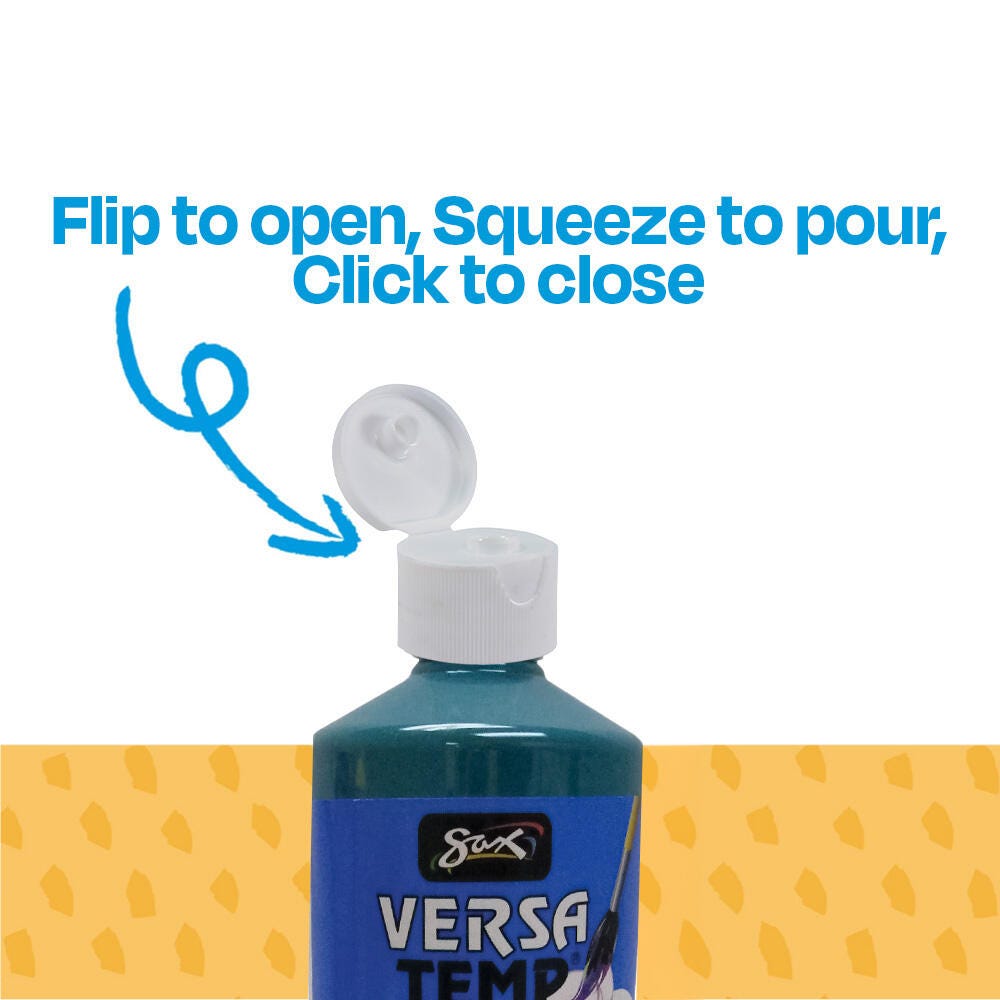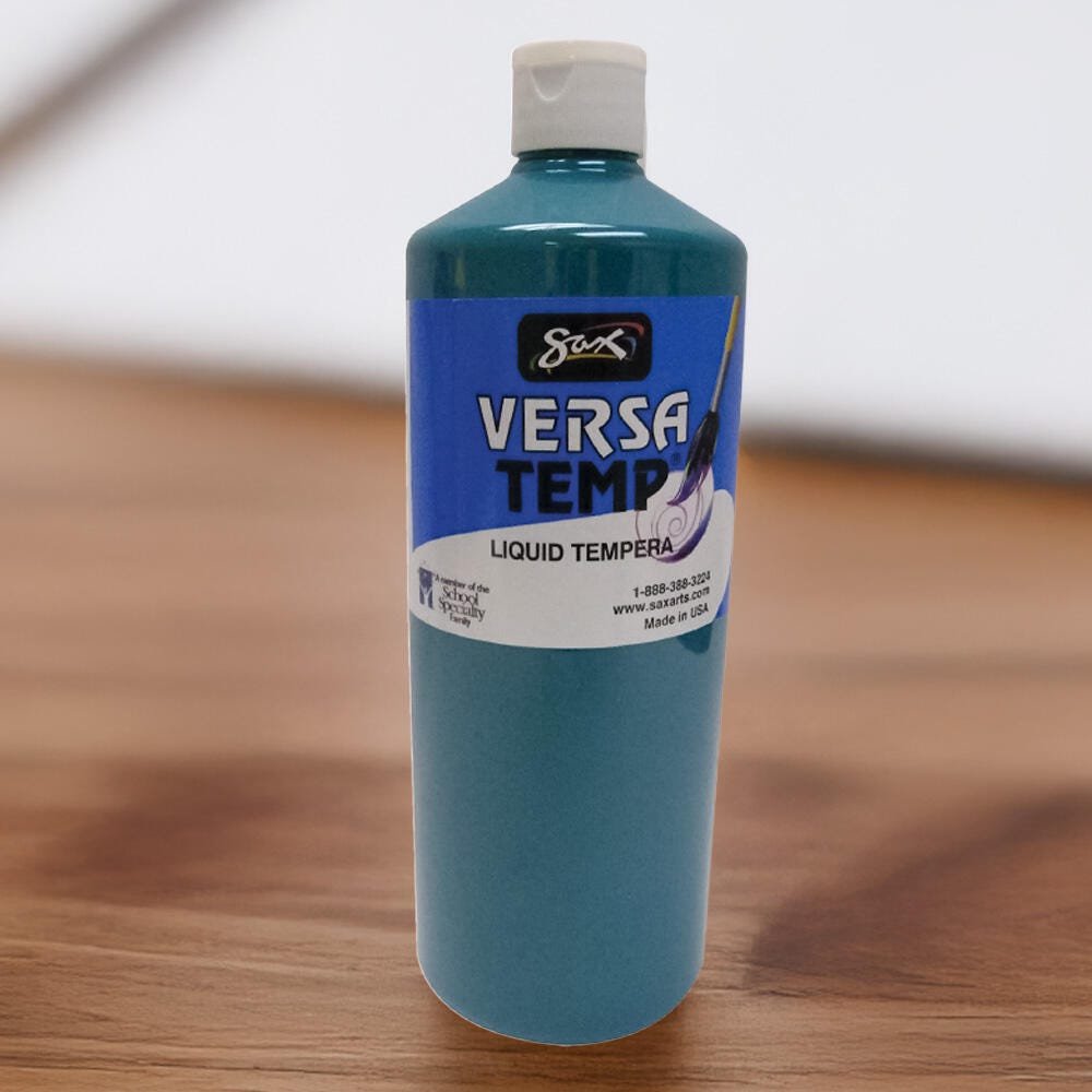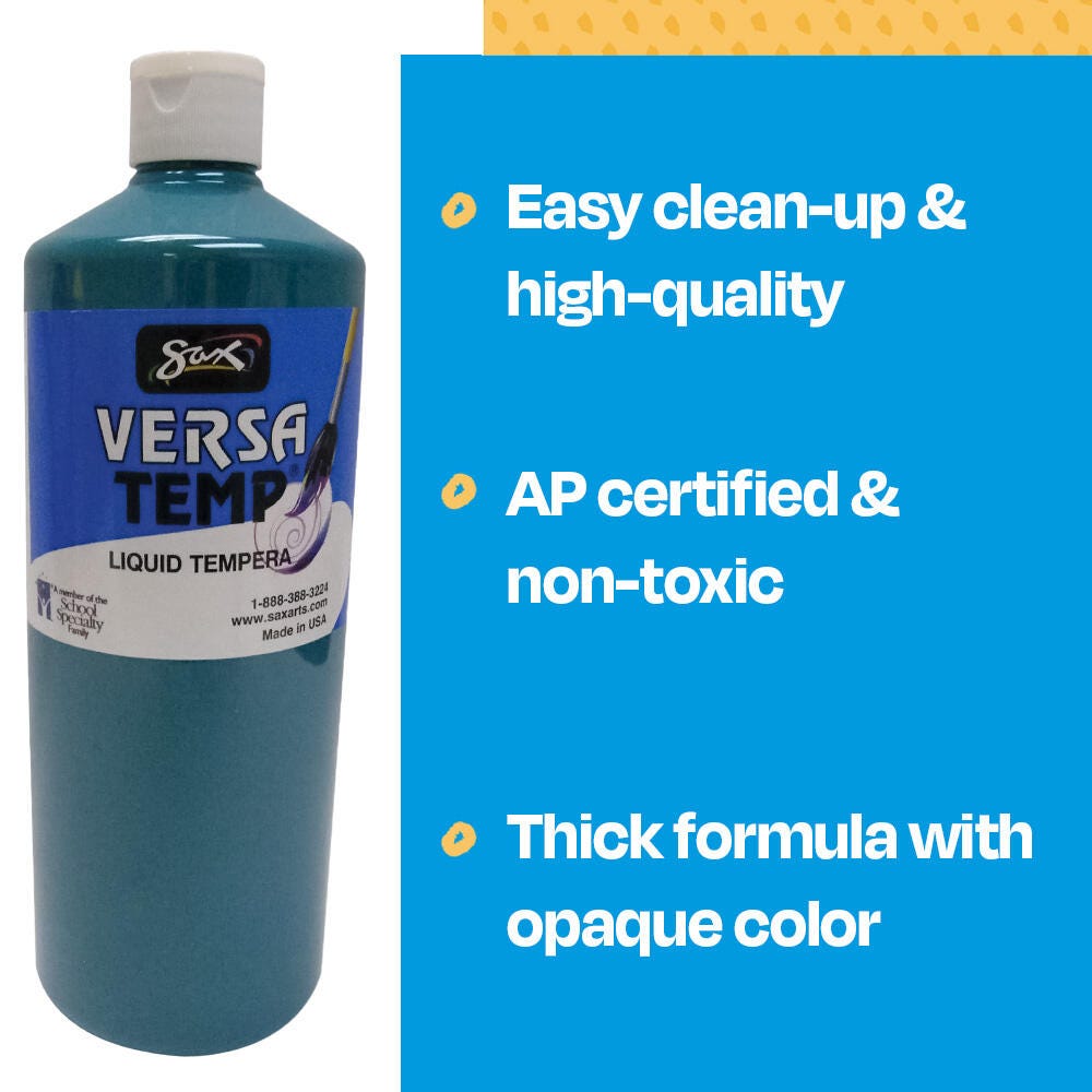 Sax Versatemp heavy-bodied tempera paint in turquoise produces bold, vibrant results. Foster creativity with a paint that resists cracking and chipping. The convenient quart bottle is easy to pour and store, and is perfect for sharing in the classroom. Complete art projects, posters, and signs that stand out with one shade or craft new hues by mixing. The heavy formula is easy to apply and mix.