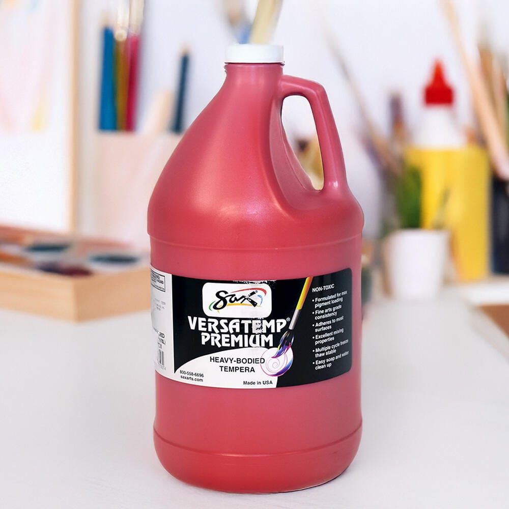 Sax Versatemp premium heavy-bodied tempera paint in primary red is perfect for artists and students. Enjoy richer, brighter, and more intense colors with a thick consistency that provides superior brush film build and excellent color mixing properties. This tempera is perfect for block and screen printing as well as signs, sets, and backdrops. Complete projects, posters, and unique paintings with this high-quality painting medium in a large 1 gallon bottle. Stock up and save with our tempera paints.