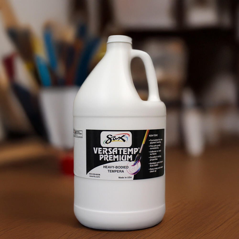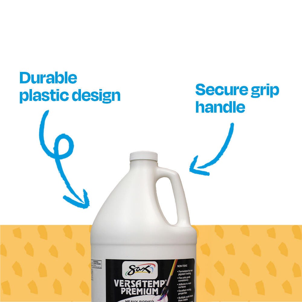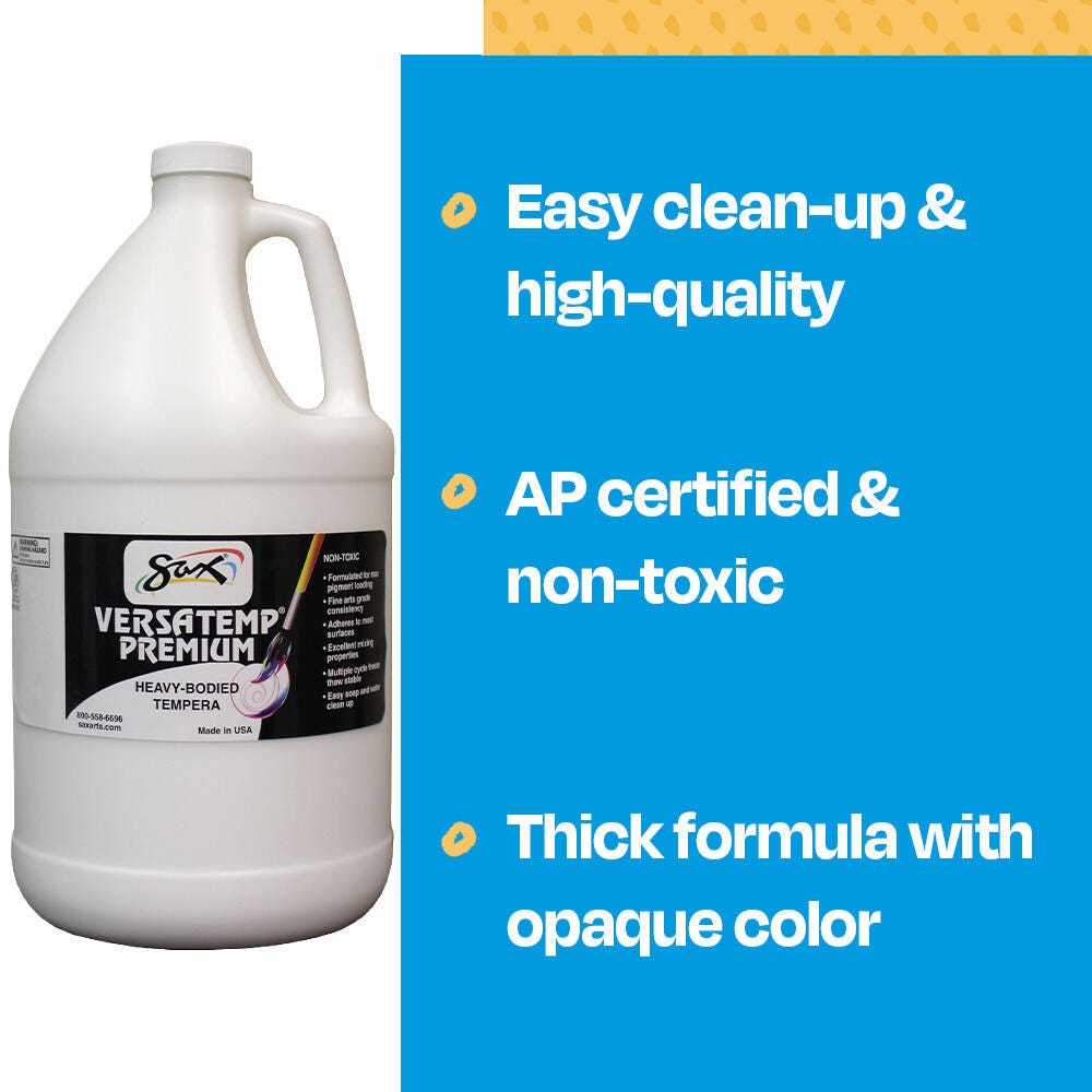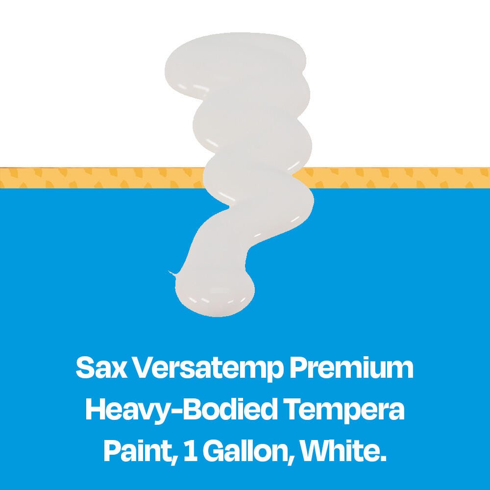 Sax Versatemp premium heavy-bodied tempera paint in white is perfect for artists and students. Enjoy richer, brighter, and more intense colors with a thick consistency that provides superior brush film build and excellent color mixing properties. This tempera is perfect for block and screen printing as well as signs, sets, and backdrops. Complete projects, posters, and unique paintings with this high-quality painting medium in a large 1 gallon bottle. Stock up and save with our tempera paints.