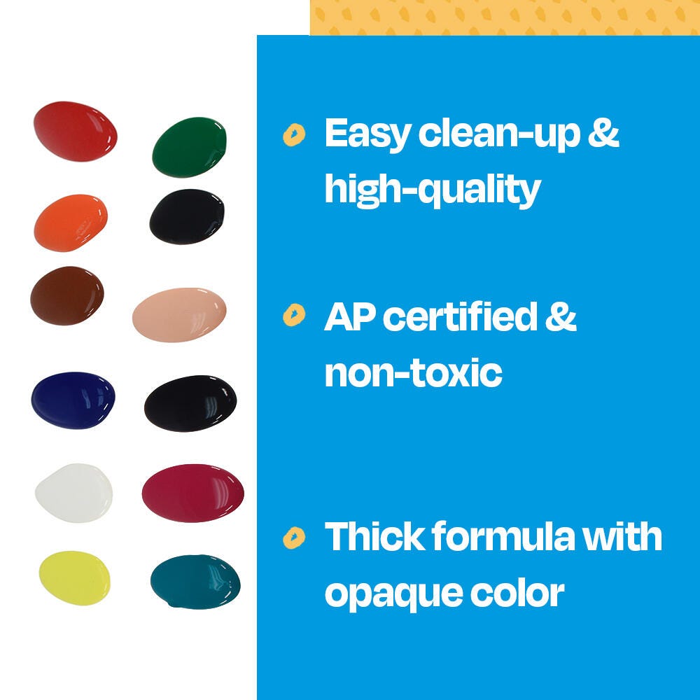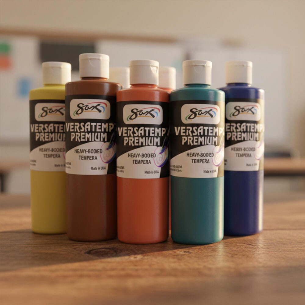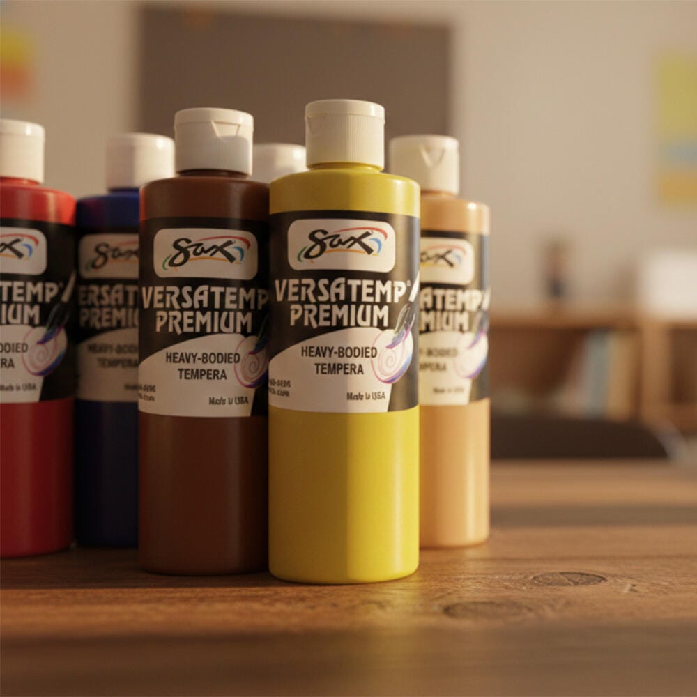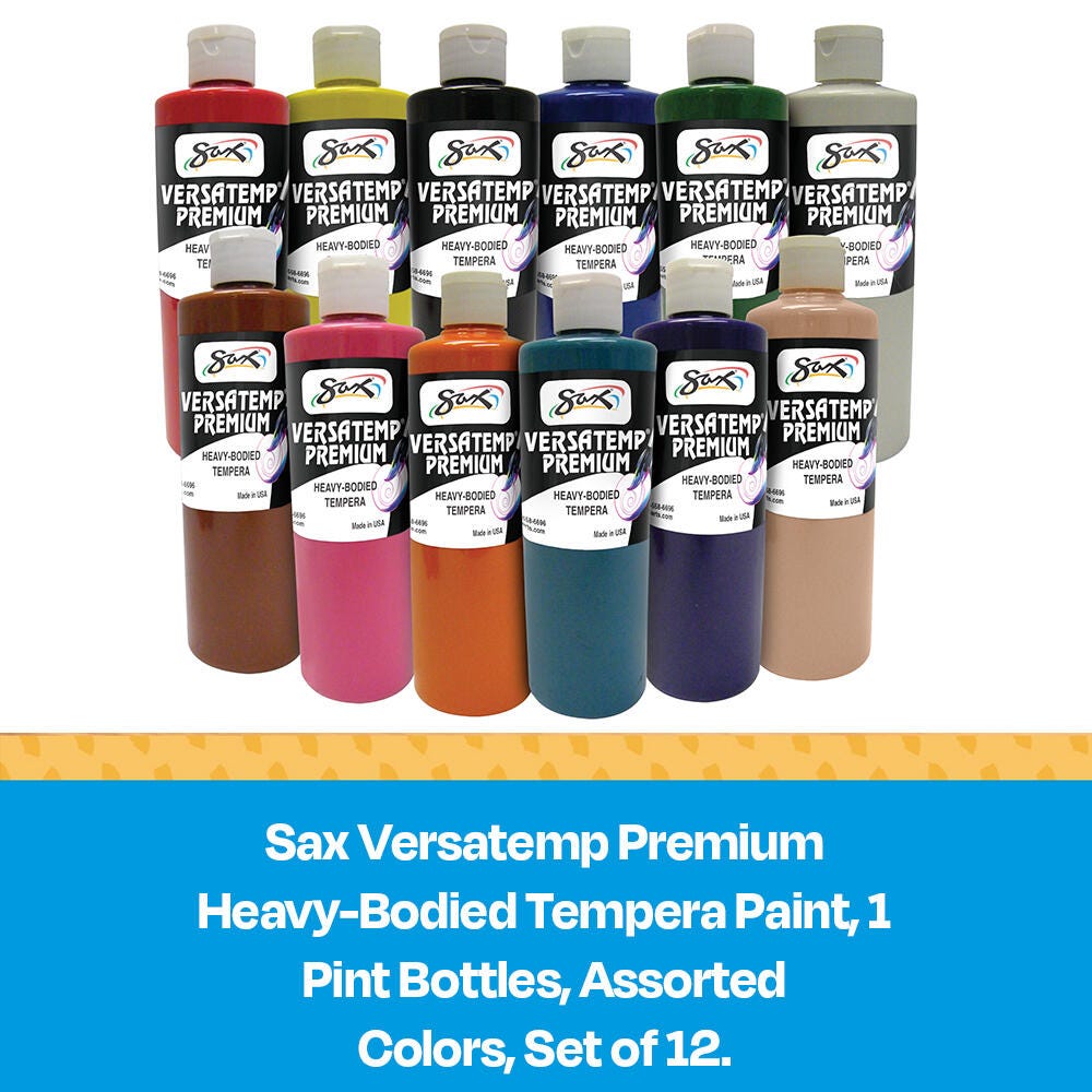 The Sax Versatemp premium heavy-bodied tempera paint kit comes in a variety of colors for sharing in art class. Our high-quality paints have richer, brighter, and more intense colors that provide superior brush build up and excellent color mixing properties. Complete projects, posters, and unique paintings with the long-lasting kit with convenient pint bottles. Stock up and save with high-quality tempera paints. This set contains twelve 1-pint bottles of heavy-bodied tempera paint, with one each in the following colors: Primary Red, Primary Yellow, black, Primary Blue, green, white, brown, magenta, orange, turquoise, violet, and peach.