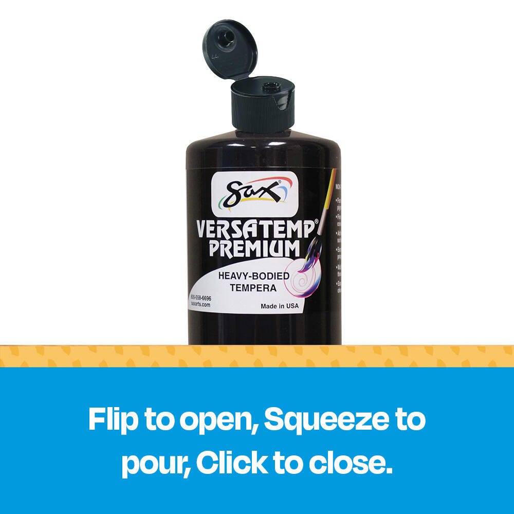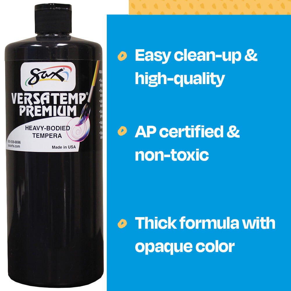 Sax Versatemp premium heavy-bodied tempera paint in black is perfect for artists and students. Enjoy richer, brighter, and more intense colors with a thick consistency that provides superior brush film build and excellent color mixing properties. This tempera is perfect for block and screen printing as well as signs, sets, and backdrops. Complete projects, posters, and unique paintings with this high-quality painting medium in a convenient 1 quart bottle. Stock up and save with our tempera paints.