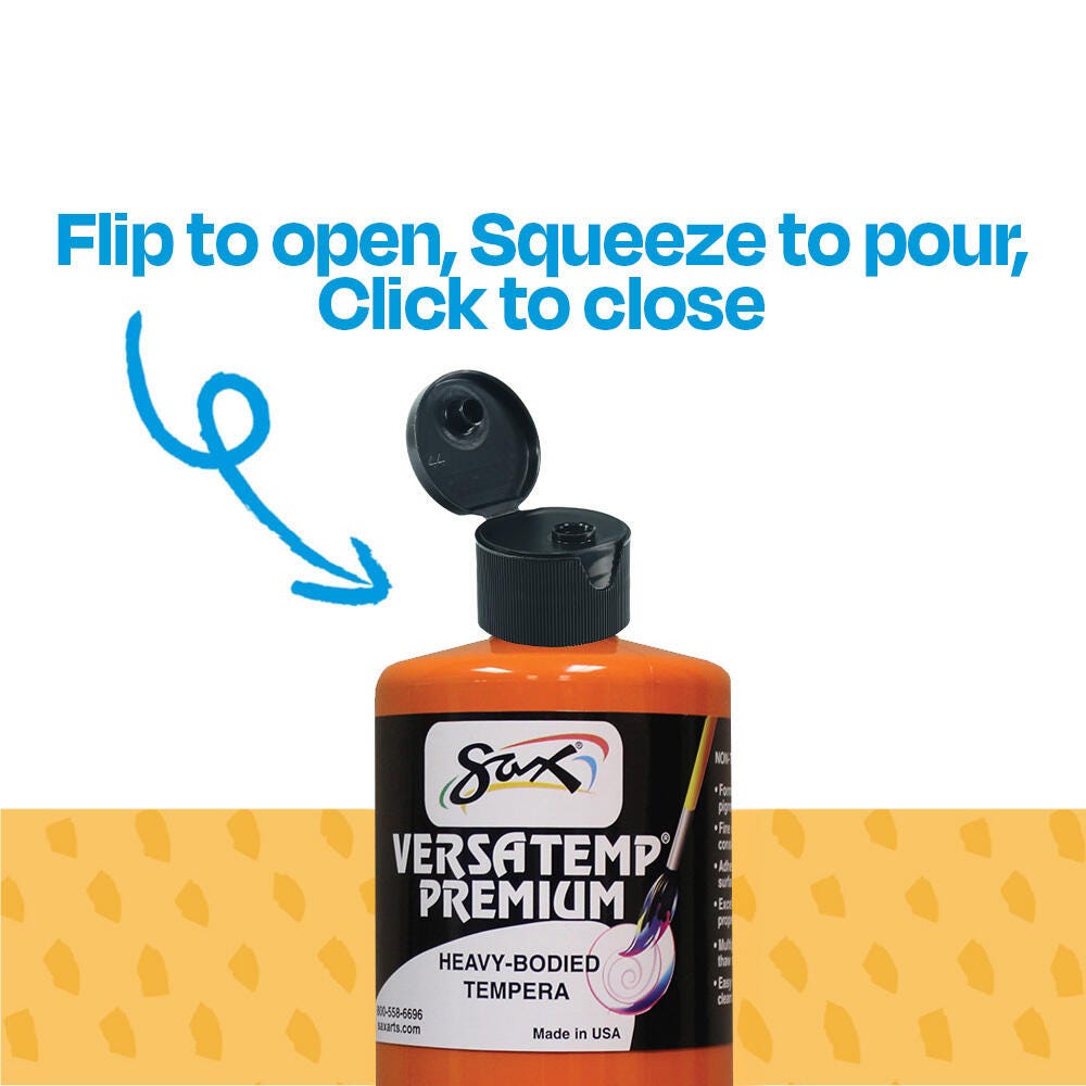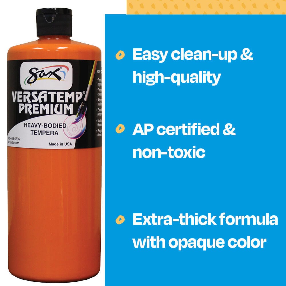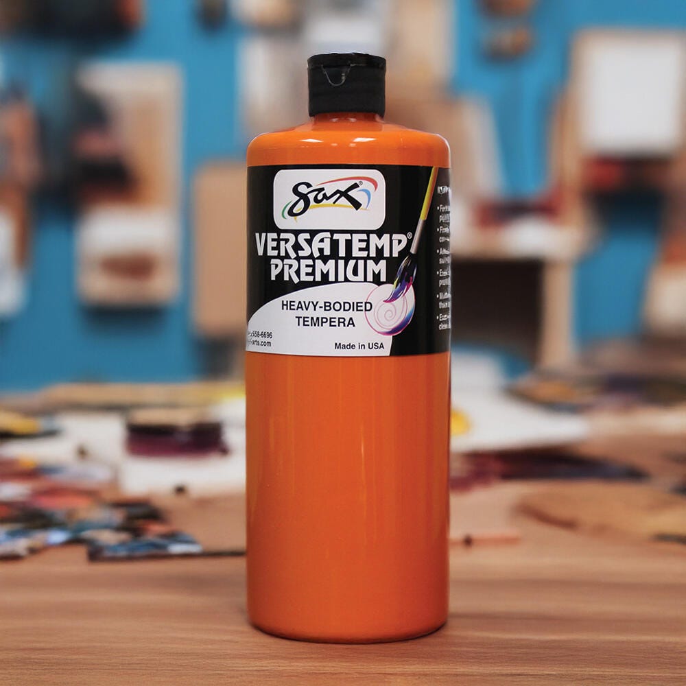 Sax Versatemp premium heavy-bodied tempera paint in orange is perfect for artists and students. Enjoy richer, brighter, and more intense colors with a thick consistency that provides superior brush film build and excellent color mixing properties. This tempera is perfect for block and screen printing as well as signs, sets, and backdrops. Complete projects, posters, and unique paintings with this high-quality painting medium in a convenient 1 quart bottle. Stock up and save with our tempera paints.