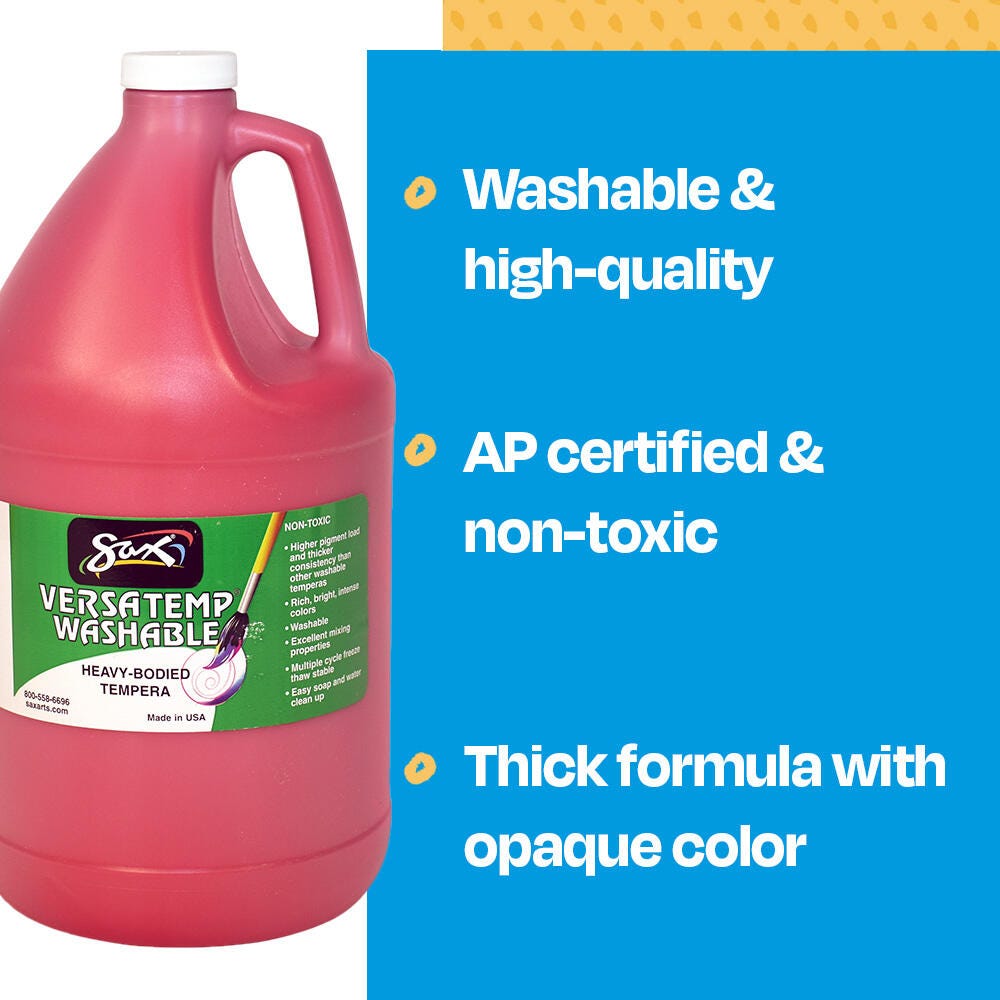 Sax Versatemp washable heavy-bodied tempera paint in a primary red color crafts bold, vibrant color with a mess-free formula. Foster creativity with a paint that enables more fun and easier cleaning for children and adults. While most kid-friendly formulas lack pigment strength, our formula provides a stronger pigment load with a heavy, creamy consistency. This painting medium comes in a large gallon bottle for effortless handling, pouring, storing, and sharing in the classroom. Complete school projects, art lessons, and signs with one shade or create new hues by mixing and matching colors.