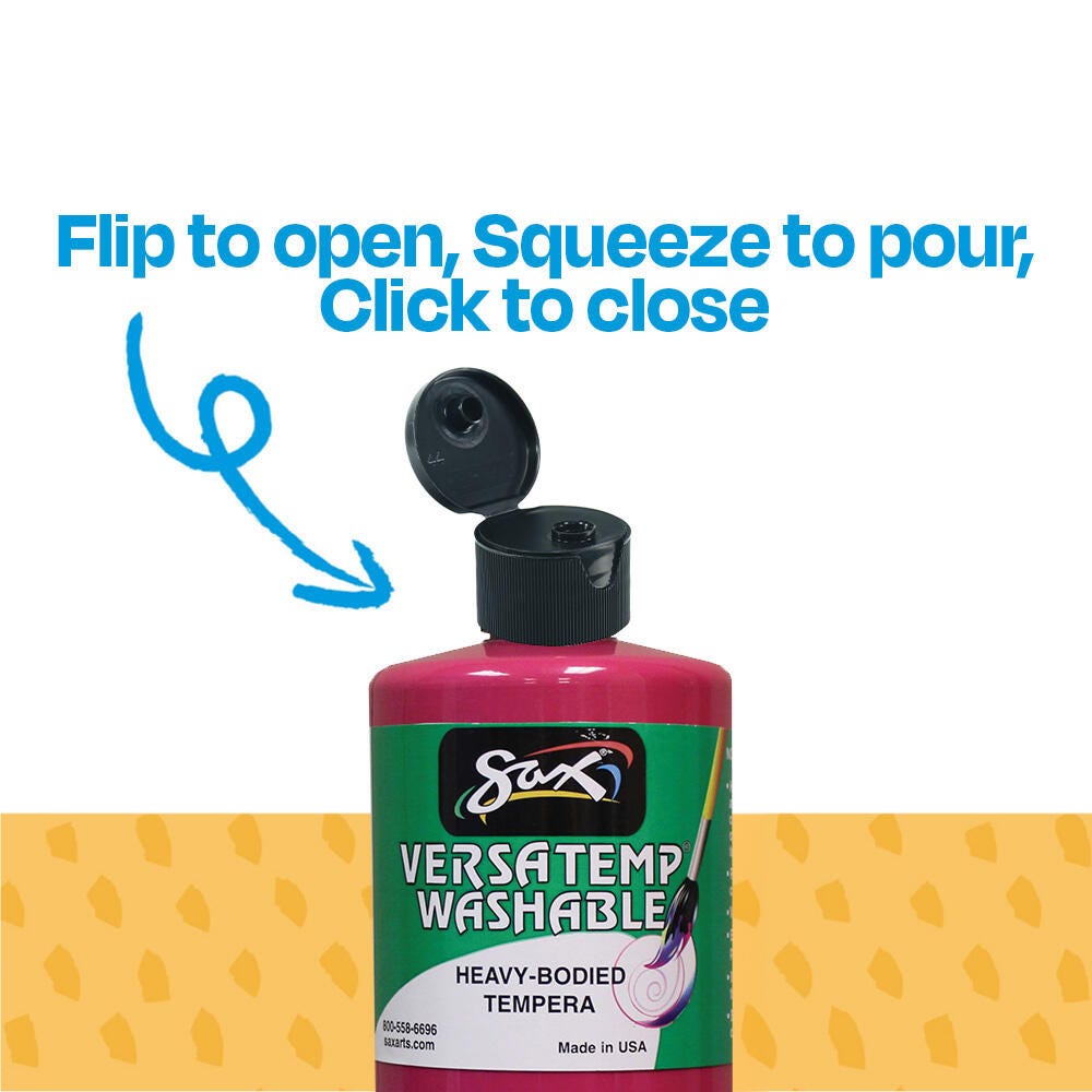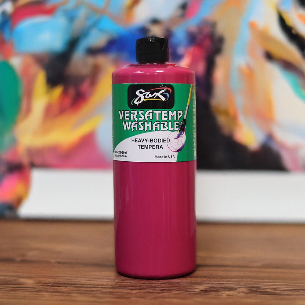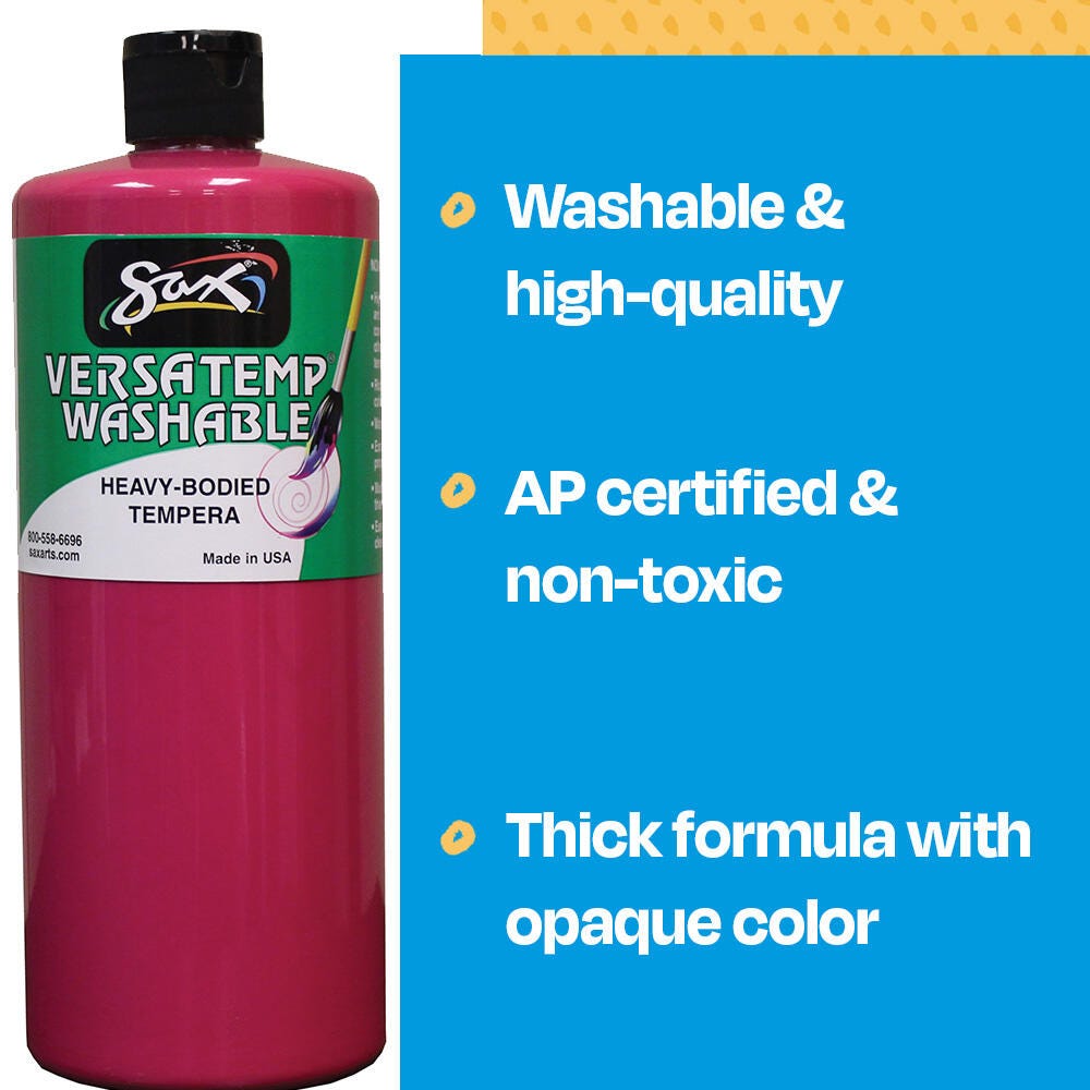 Sax Versatemp washable heavy-bodied tempera paint in a magenta color crafts bold, vibrant color with a mess-free formula. Foster creativity with a paint that enables more fun and easier cleaning for children and adults. While most kid-friendly formulas lack pigment strength, our formula provides a stronger pigment load with a heavy, creamy consistency. This painting medium comes in a convenient quart bottle for effortless handling, pouring, storing, and sharing in the classroom. Complete school projects, art lessons, and signs with one shade or create new hues by mixing and matching colors.