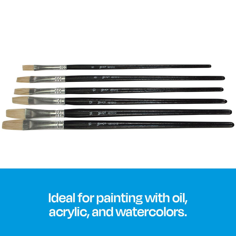 These long wooden-handled paint brushes include assorted sizes in flat tips for artists of all levels.