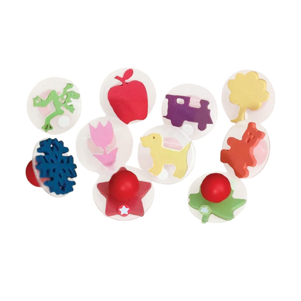 Center Enterprises Giant Imaginative Play Stamper Set 2 of 10 comes in a large 3 inch size with comfort grip handles making it easy for younger children to stamp fun paint and ink designs. Each set comes in a sturdy, reusable storage case for big painting and stamping fun.Features