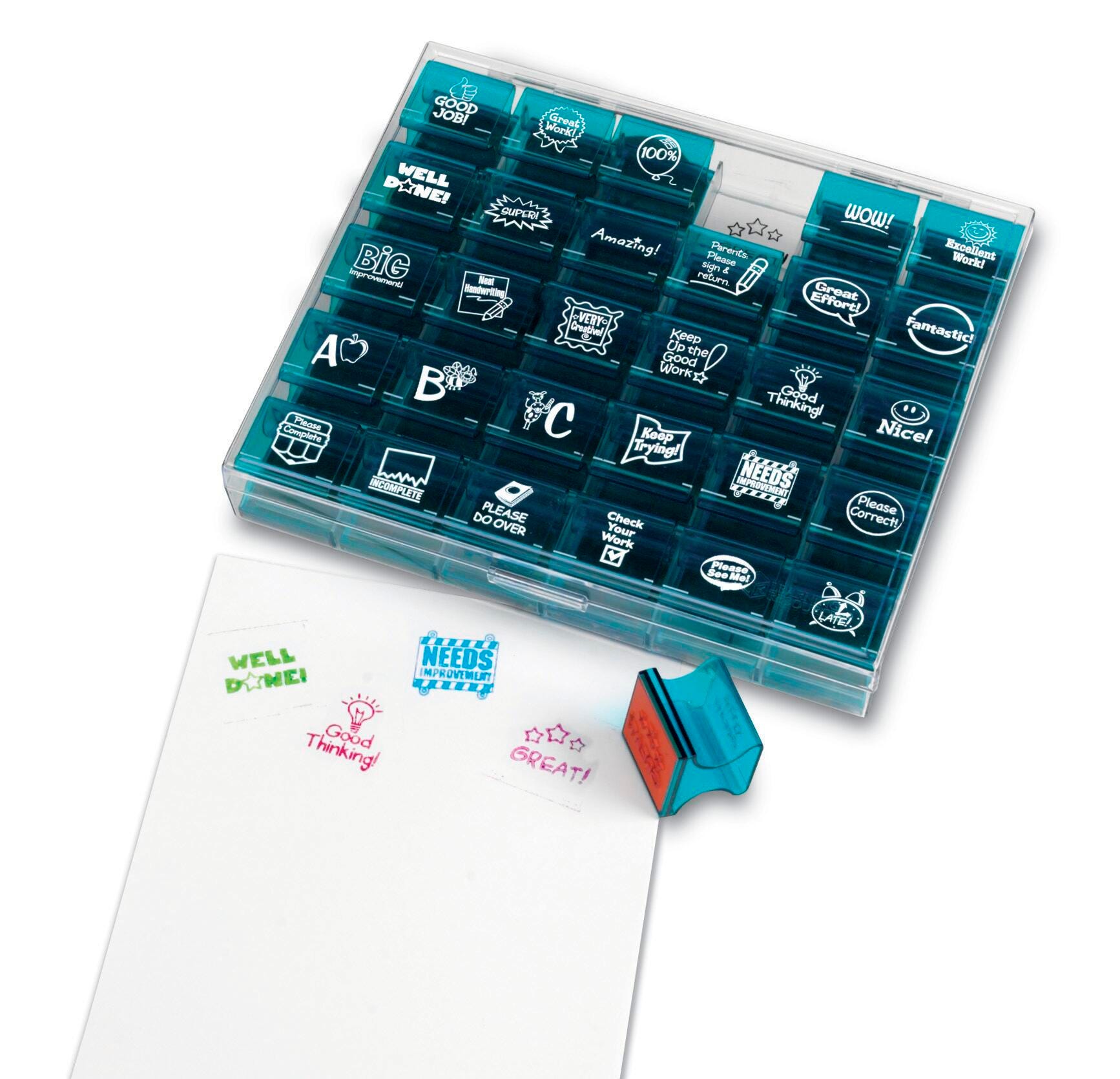 This set of plastic Teacher Incentive Stamps from Learning Resources makes grading papers quick and easy. The cute, illustrated stamps have encouraging messages and standard classroom comments, like "Great Work" or "Needs Improvement". The stamps measure 1-1/2 x 1-1/2 inches each and come in a plastic storage case for easy organization. Recommended for ages 3 and above.Features