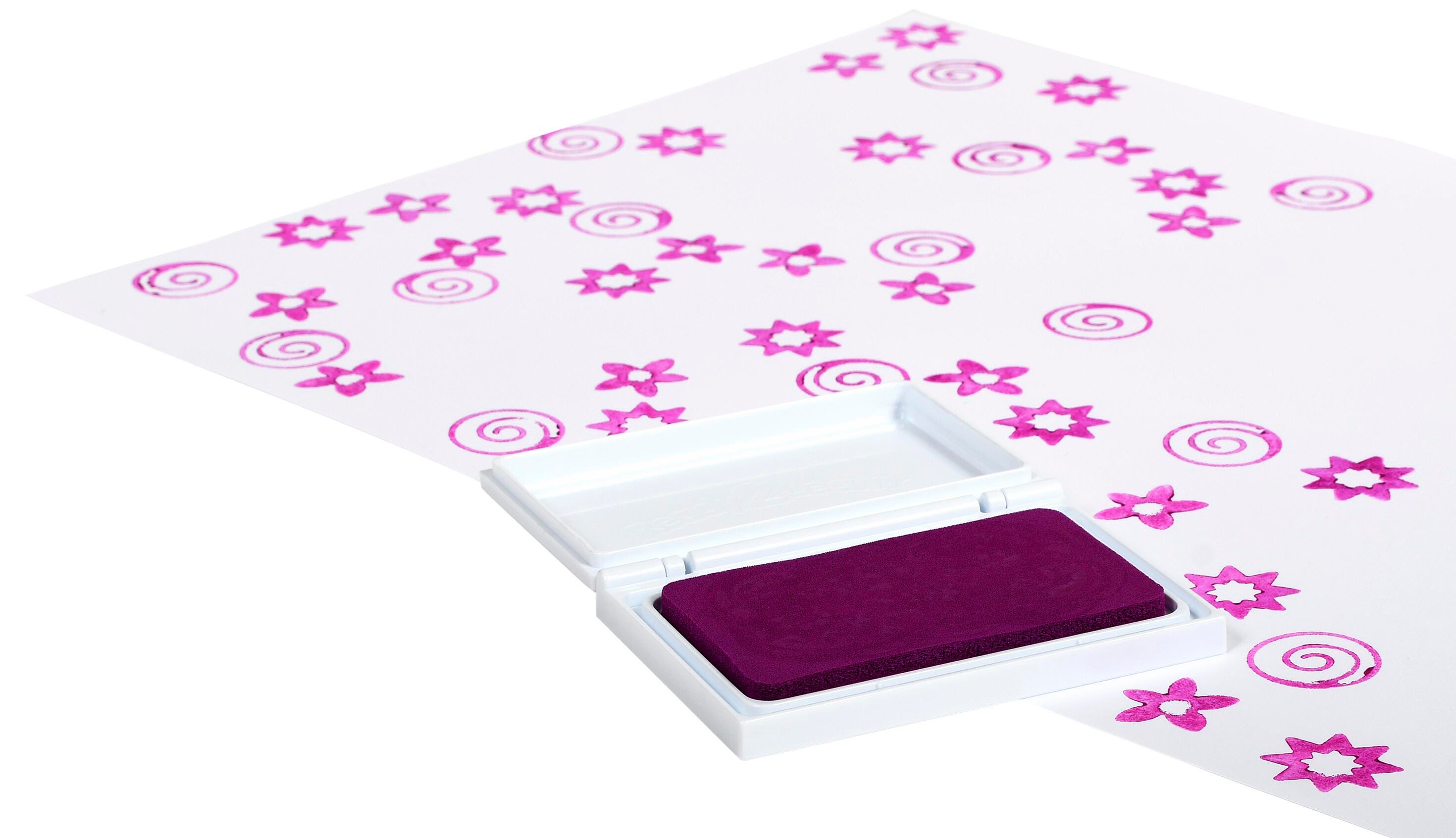 This hot pink stamp pad is fade-resistant and acid-free for archival quality. The raised pad means there are no hard edges around the ink. Children can press down without hitting an edge, which provides more area for stamping. Stamping is a fun way to develop fine motor skills and foster creative expression. The ink pad is packaged in a plastic case with a flip cover to prevent it from drying out. For ages 3+ years. Size of entire stamp pad (with plastic casing): 3-7/8 L x 2-3/4 W x 5/8 H inches; Size of ink pad: 3-3/8 L x 2 W inches.Features