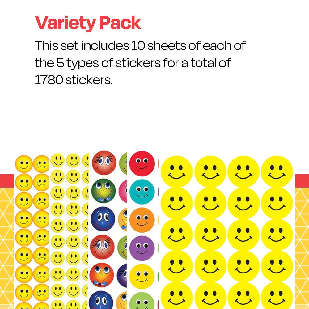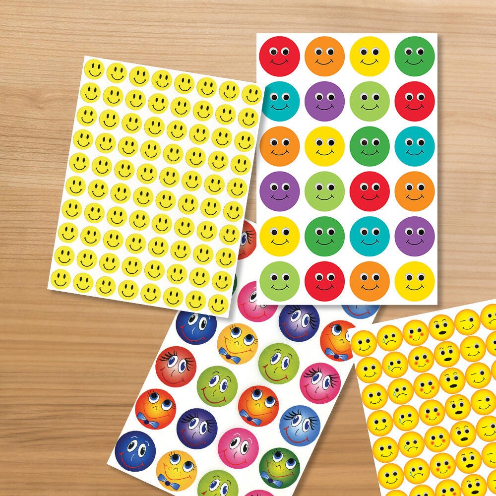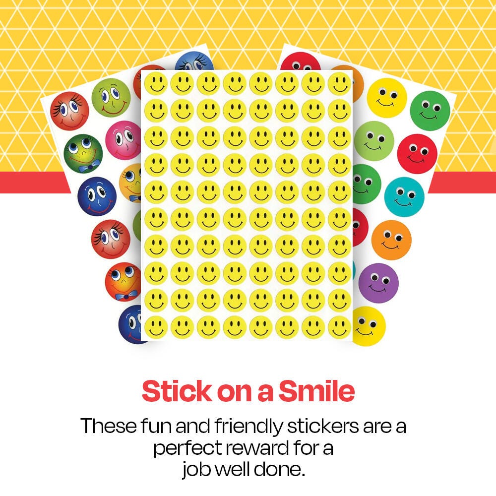 The School Smart smiley face stickers set includes 50 sheets of happy and mixed emotion face stickers. Our emoji and happy face stickers are perfect for reward or recognition and paper grading in kindergarten or elementary school. This multi-pack includes 10 sheets of each of the following: funny faces, small smiley faces, large smiley faces, colored smiley faces, and smile emoji stickers (totaling 1780 stickers).