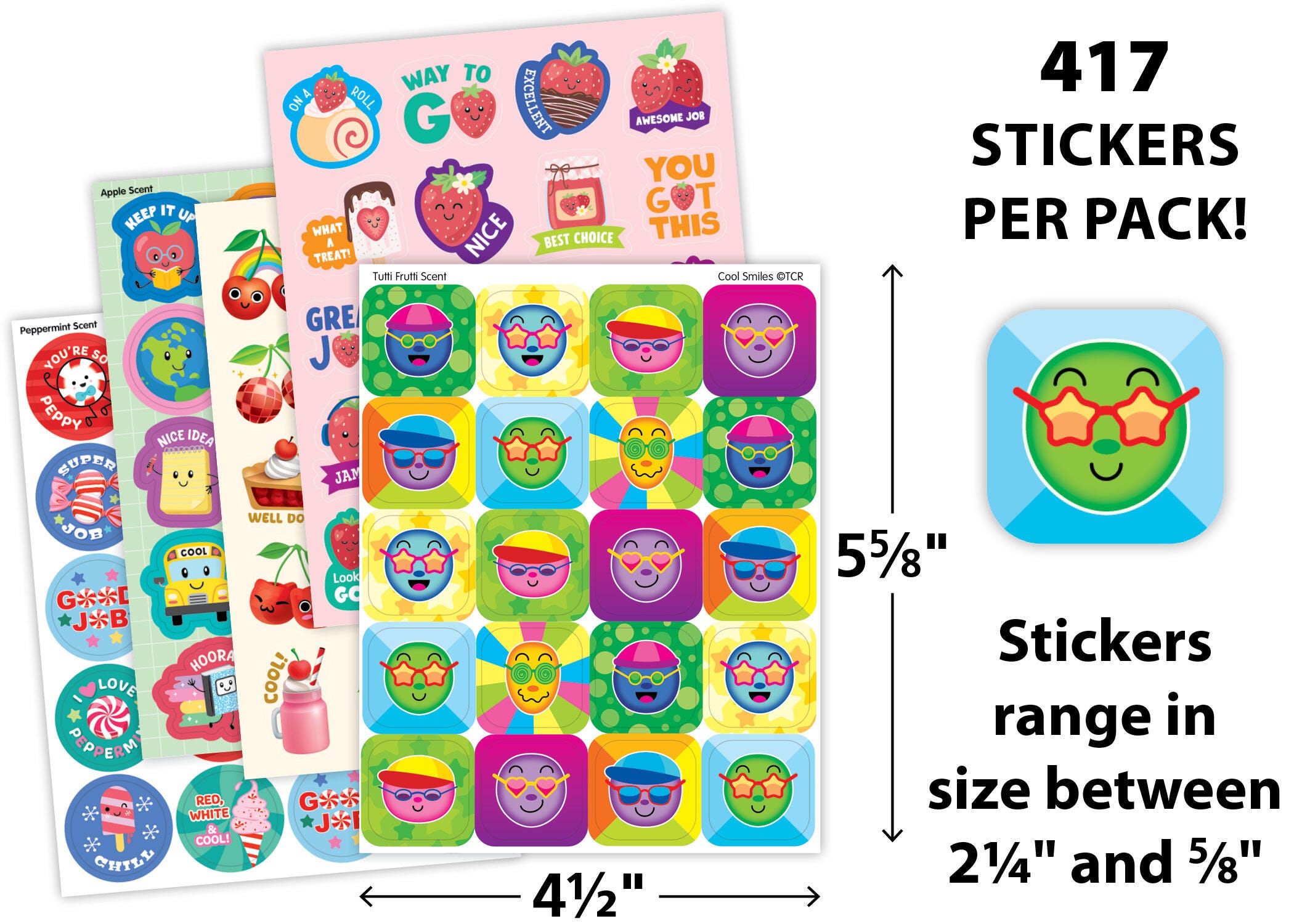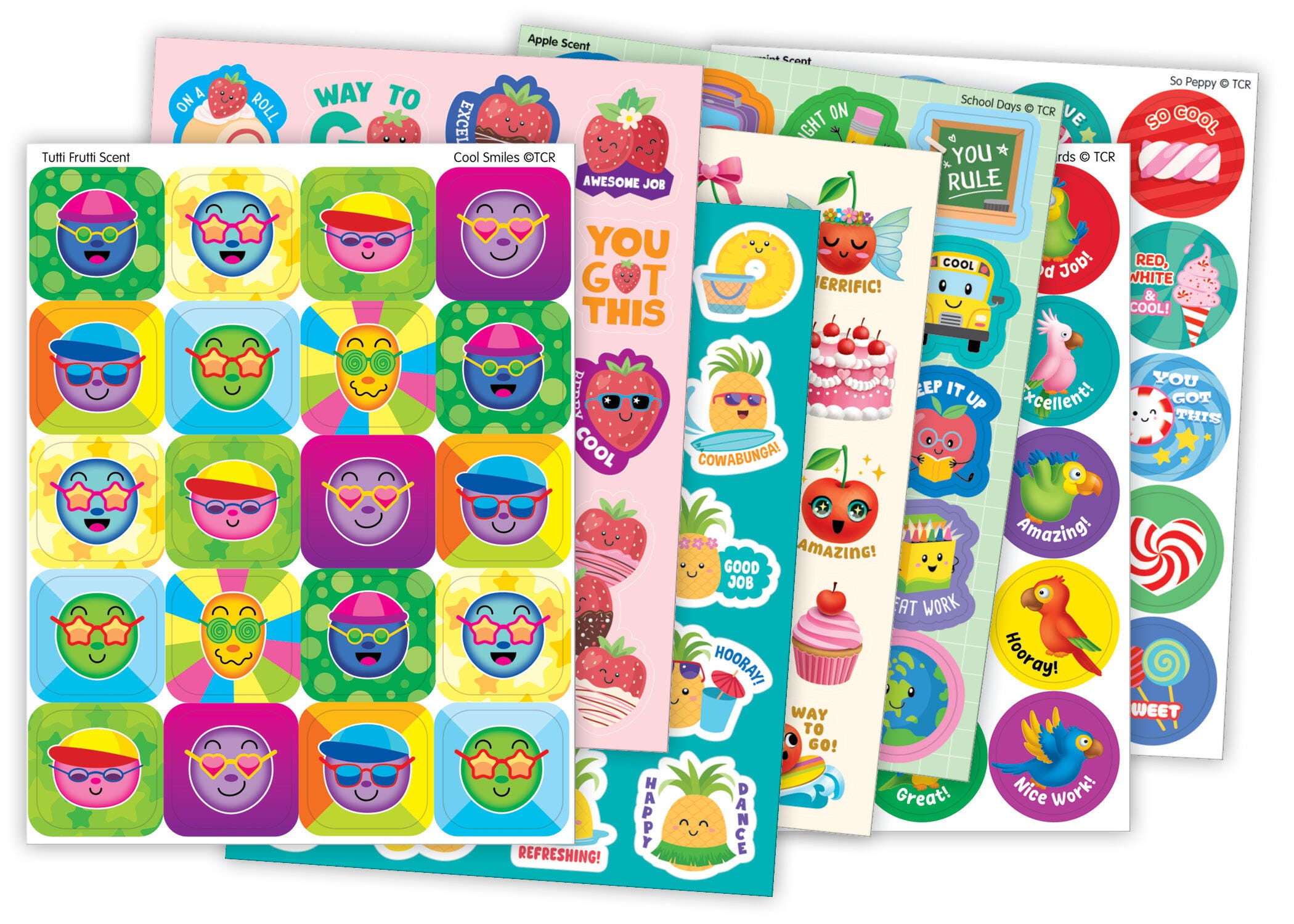 Make school life a little bit sweeter with the Sweet Scents Smell Stickers from Teacher Created Resources! This variety pack of scented stickers is the perfect way to grade papers, decorate assignments, and motivate students to tackle every assignment. With kid-friendly designs and delectable scents, these stickers are a hit with teachers and students alike. This pack includes 417 non-toxic, acid-free, and lignin-free stickers in 7 scents: pineapple, tutti frutti, strawberry, peppermint, cherry, apple, and tropical. The stickers vary in size from about 2-1/4 to 5/8 inches.