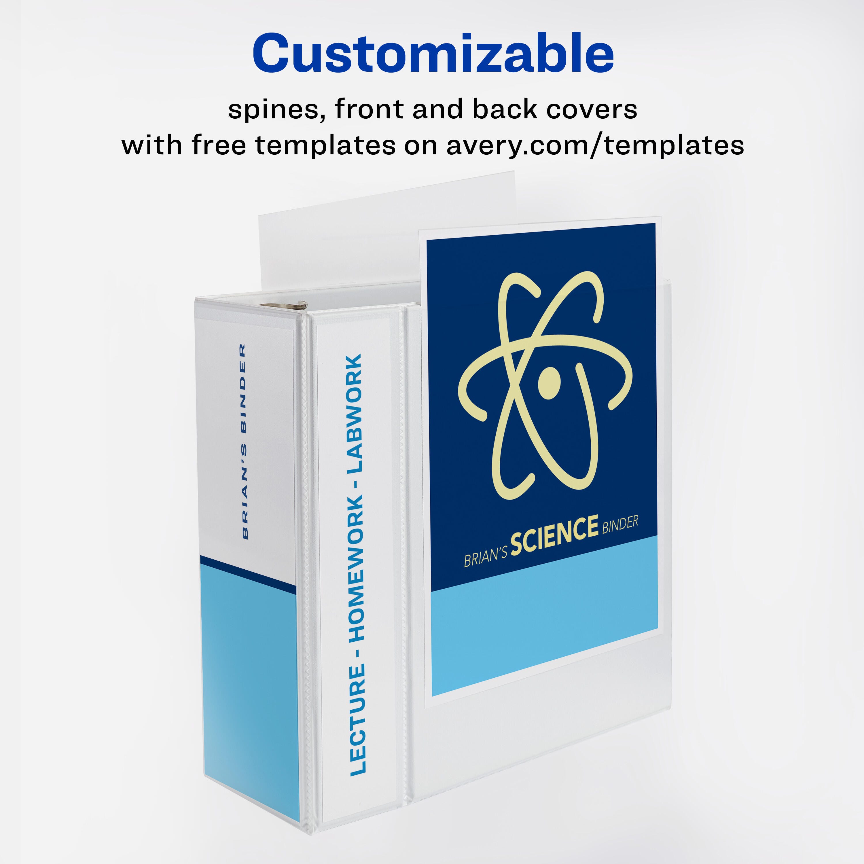 This Heavy-Duty View Binder with One Touch rings is perfect for extended use. From everyday referencing to classroom notes and home business use, this binder's strong enough to handle them all. DuraHinge design is stronger, lasts longer and resists tearing. The DuraEdge feature makes the sides and top more pliable to resist splitting. Deep-texture film offers a smoother finish and features a linen pattern for high-quality look and feel. Simply pull the lever to open the rings for adding, replacing and removing pages. Then push to lock the rings in place. One Touch rings open and close with ease and keep pages secure. Even when filled to its capacity, this binder still has four stacked pockets for a bit of extra space inside. Wide front and back binder panels fully cover standard dividers and sheet protectors. Customize the cover with free, easy-to-use, online templates and designs.