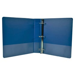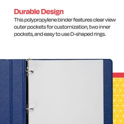 Compile important notes, papers, records, and other essential paperwork inside the School Smart blue 1 inch D ring view binder. Our sturdy D ring binder with view pockets has a convenient non-glare overlay on the spine, front, and back covers to allow you to insert custom labels or individual sheets for easy access and viewability. The clear pockets on the binder covers also prevent the transfer of ink from printed materials. The D ring mechanisms are D-shaped and easy to open and close, so you can store and organize important sheets of paper in your 3 ring binder. Made of polypropylene, the sturdy binder also has two deep inner pockets to hold loose sheets of paper. Our D ring file has a 225 sheet capacity, and the entire blue binder measures 10 x 11-1/2 inches.Features