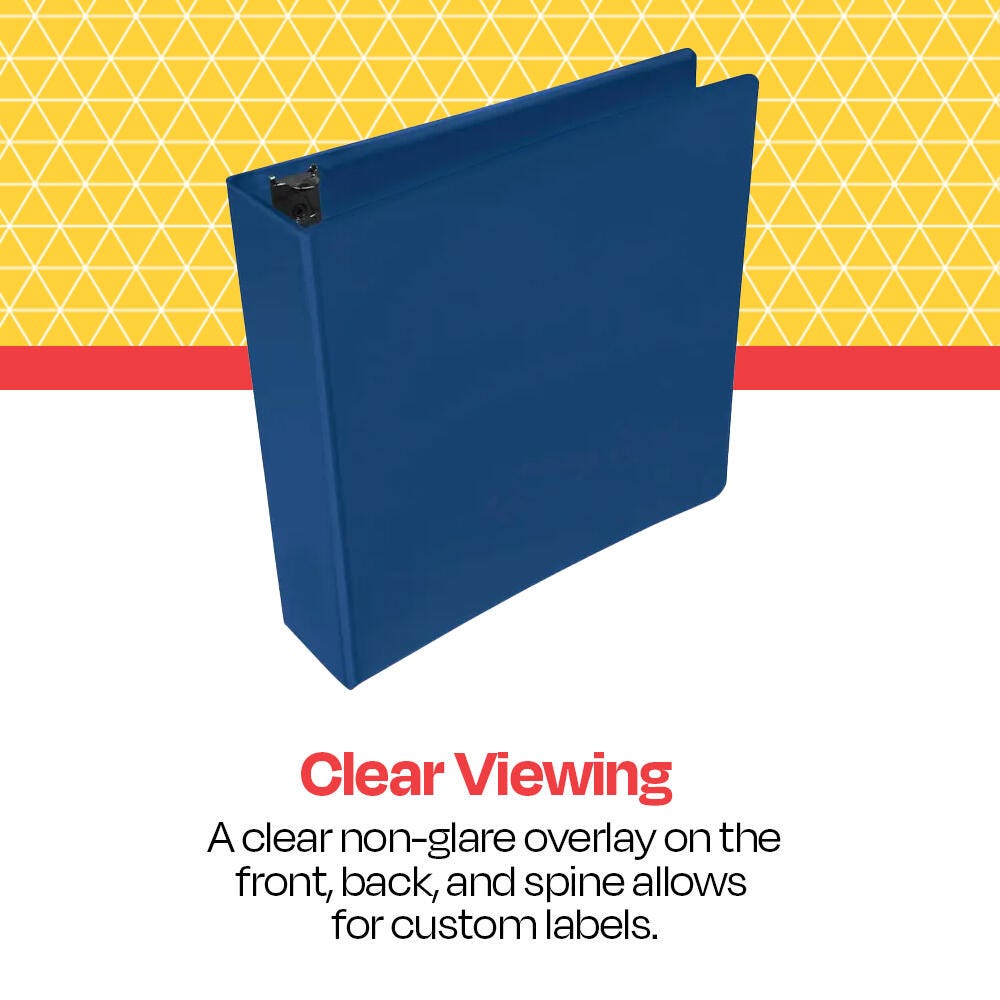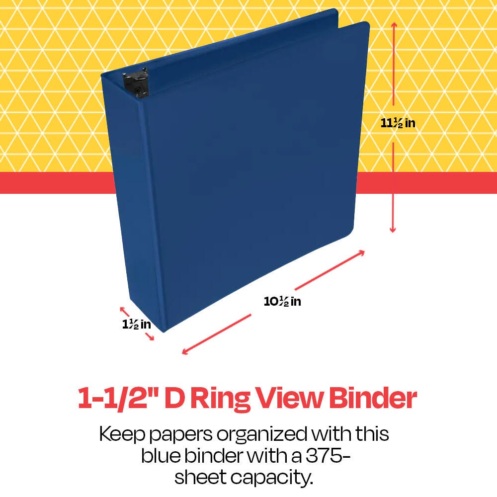 Compile important notes, papers, records, and other essential paperwork inside the School Smart blue 1-1/2 inch D-ring view binder. Our sturdy D-ring binder with view pockets has a convenient non-glare overlay on the spine, front, and back covers to allow you to insert custom labels or individual sheets for easy access and viewability. The clear pockets on the binder covers also prevent ink transfer from printing materials. The D-ring mechanisms are D-shaped and easy to open and close, so you can store and organize important sheets of paper in your 3-ring binder. Made of polypropylene, the sturdy binder also has two deep inner pockets to hold loose sheets of paper. Our D-ring file has a 350-sheet capacity, and the entire blue binder measures 10-1/2 x 11-1/2 inches.