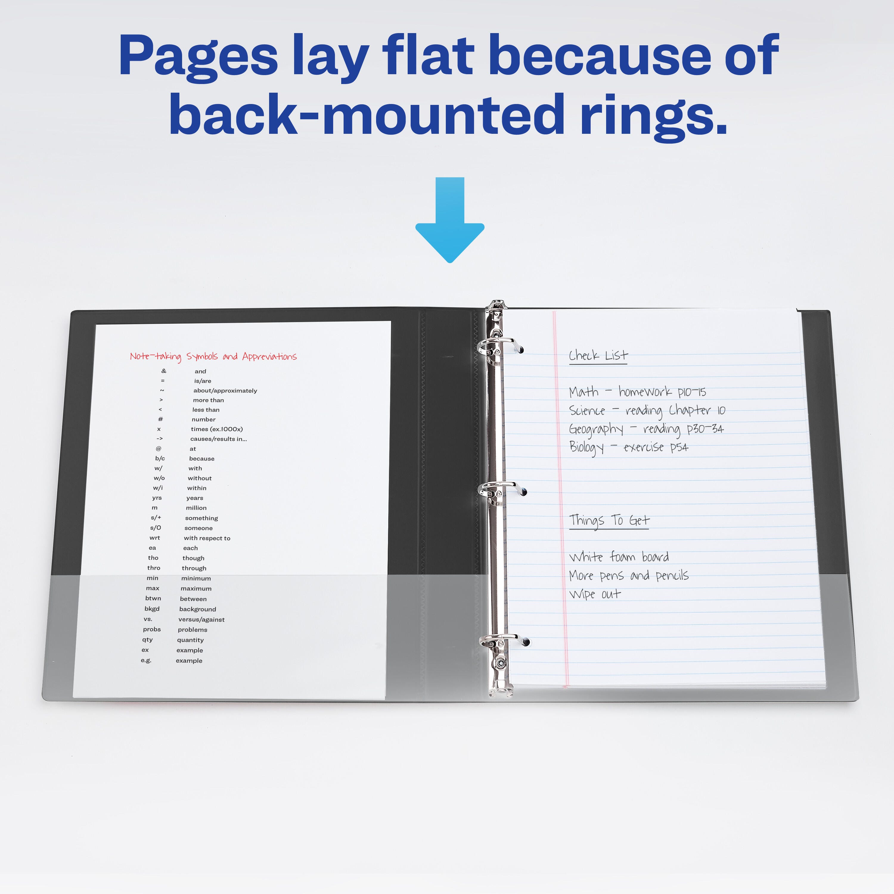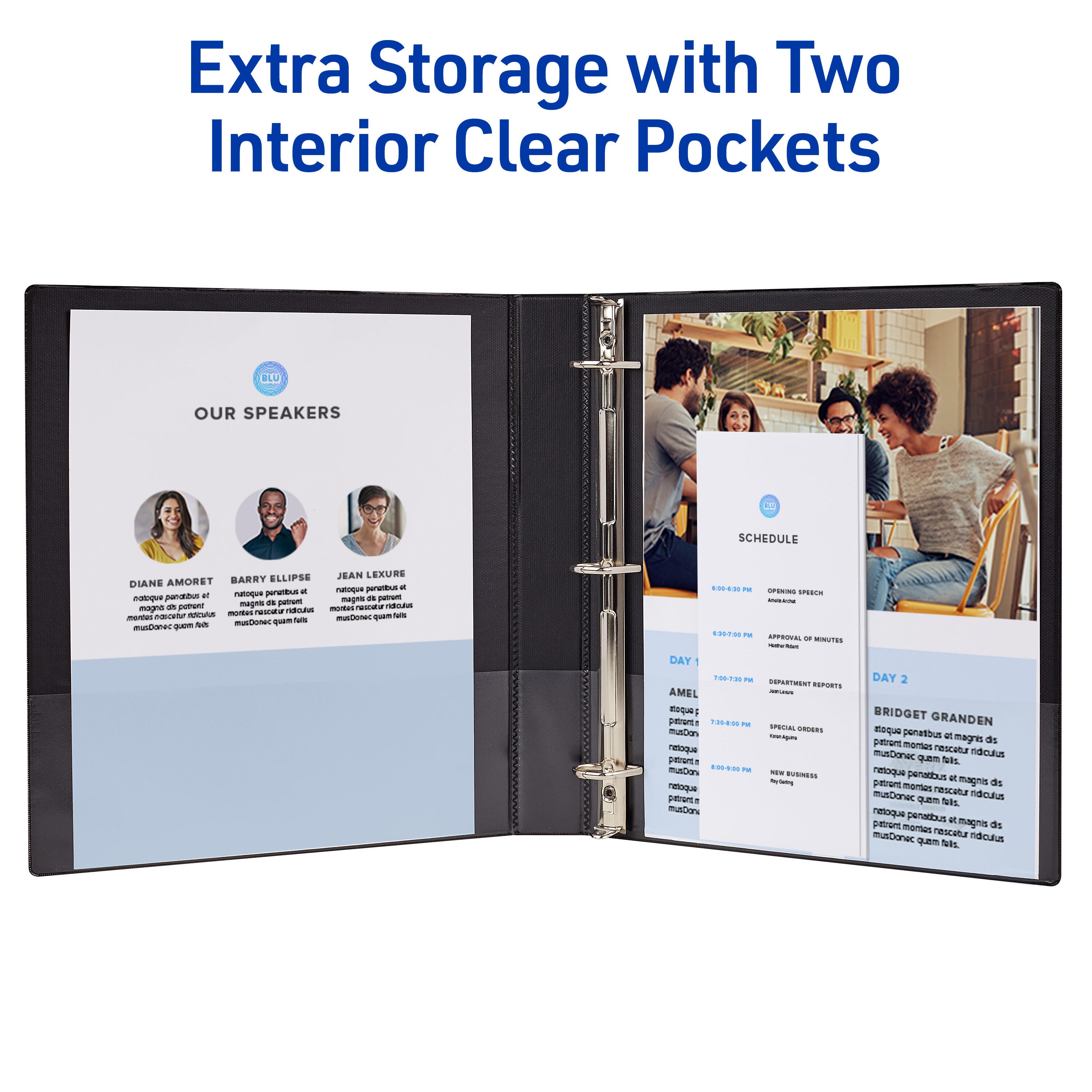 Avery Durable View Slant Ring Binders feature durable construction that is ideal for frequent referencing. DuraHinge design is stronger, lasts longer and resists tearing. DuraEdge feature makes the sides and top more pliable to resist splitting. Deep texture film offers a smoother finish and features a linen pattern for high quality look and feel. Wider front and back binder panels fully cover standard dividers and sheet protectors. Organize and secure paper with two interior pockets. Slant rings have a higher page capacity compared to same size round rings. Clear cover and spine for easy customization. Pages lie flat with back-mounted rings; exposed rivets on back. Holds 8-1/2 x 11 inch documents. Front insert and spine label included. 36% minimum post-consumer content.